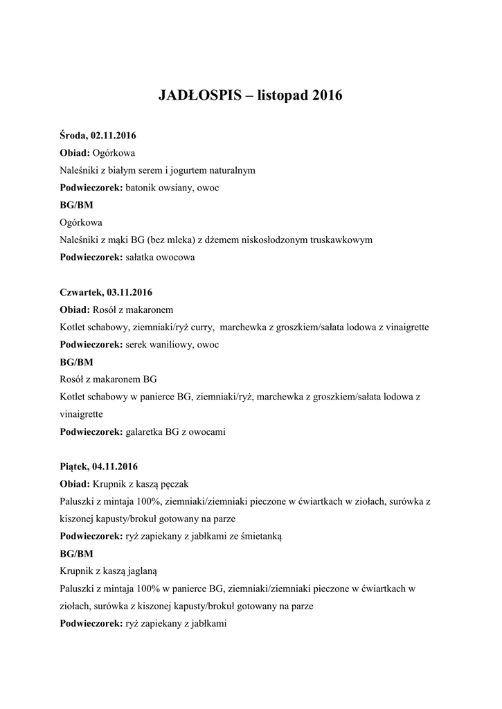 JADŁOSPIS – listopad 2016 Środa, 02.11.2016 Obiad: Ogórkowa Naleśniki z białym serem i jogurtem naturalnym Podwieczorek: batonik owsiany, owoc BG/BM Ogórkowa Naleśniki z mąki BG (bez mleka) z dżemem niskosłodzonym truskawkowym Podwieczorek: sałatka owocowa Czwartek, 03.11.2016 Obiad: Rosół z makaronem Kotlet schabowy, ziemniaki/ryż curry, marchewka z groszkiem/sałata lodowa z vinaigrette Podwieczorek: serek waniliowy, owoc BG/BM Rosół z makaronem BG Kotlet schabowy w panierce BG, ziemniaki/ryż, marchewka z groszkiem/sałata lodowa z vinaigrette Podwieczorek: galaretka BG z owocami Piątek, 04.11.2016 Obiad: Krupnik z kaszą pęczak Paluszki z mintaja 100%, ziemniaki/ziemniaki pieczone w ćwiartkach w ziołach, surówka z kiszonej kapusty/brokuł gotowany na parze Podwieczorek: ryż zapiekany z jabłkami ze śmietanką BG/BM Krupnik z kaszą jaglaną Paluszki z mintaja 100% w panierce BG, ziemniaki/ziemniaki pieczone w ćwiartkach w ziołach, surówka z kiszonej kapusty/brokuł gotowany na parze Podwieczorek: ryż zapiekany z jabłkami Poniedziałek, 07.11.2016 Obiad: Barszcz czerwony z ziemniakami zabielany Kotlet mielony z szynki wieprzowej, ziemniaki/makaron, mizeria/marchewka baby Podwieczorek: paluszki ziołowo-czosnkowe BG/BM Barszcz czerwony z ziemniakami Kotlet mielony z szynki wieprzowej w panierce BG, ziemniaki, ogórki zielone w vinaigrette/ marchewka baby Podwieczorek: pieczony banan Wtorek, 08.11.2016 Obiad: Pomidorowa z makaronem De Volaye, ziemniaki puree/ryż basmati, surówka z buraczków na zimno/kalafior gotowany na parze Podwieczorek: domowe ciasto ze śliwkami BG/BM Pierś kurczaka w panierce BG, ziemniaki/ryż basmati, surówka z buraczków na zimno/kalafior gotowany na parze Podwieczorek: kisiel ze świeżymi śliwkami Środa, 09.11.2016 Obiad: Rosół z lanym kluseczkami Nugettsy z piersi kurczaka, ziemniaki pieczone/ryż kolorowy, fasolka szparagowa/pomidor Podwieczorek: chipsy z jabłuszek suszonych BG/BM Rosół z makaronem BG Nugettsy z piersi kurczaka w panierce BG, ziemniaki pieczone/ryż kolorowy, fasolka szparagowa/pomidor Podwieczorek: chipsy z jabłuszek suszonych Czwartek, 10.11.2016 Obiad: Szczawiowa z ziemniakami i jajkiem Kluski leniwe, marchewka z jabłkiem Podwieczorek: muffinka z czekoladą BG/BM Szczawiowa z ziemniakami Naleśniki z mąki BG z prażonymi jabłkami Podwieczorek: batonik owsiany, owoc Piątek, 11.11.2016 WOLNE