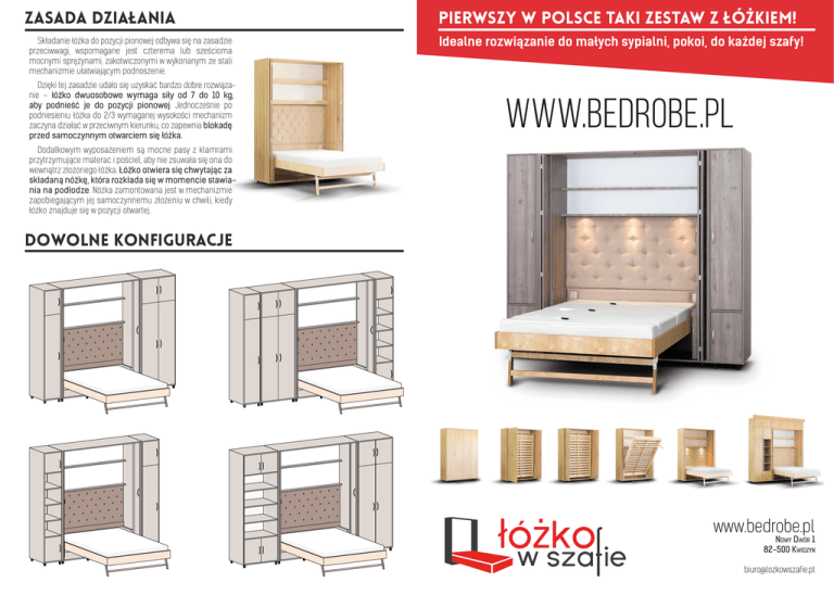 zasada działania Składanie łóżka do pozycji pionowej odbywa się na zasadzie przeciwwagi, wspomagane jest czterema lub sześcioma mocnymi sprężynami, zakotwiczonymi w wykonanym ze stali mechanizmie ułatwiającym podnoszenie. Pierwszy w Polsce taki zestaw z łóżkiem! Idealne rozwiązanie do małych sypialni, pokoi, do każdej szafy! Dzięki tej zasadzie udało się uzyskać bardzo dobre rozwiązanie – łóżko dwuosobowe wymaga siły od 7 do 10 kg, aby podnieść je do pozycji pionowej. Jednocześnie po podniesieniu łóżka do 2/3 wymaganej wysokości mechanizm zaczyna działać w przeciwnym kierunku, co zapewnia blokadę przed samoczynnym otwarciem się łóżka. Dodatkowym wyposażeniem są mocne pasy z klamrami przytrzymujące materac i pościel, aby nie zsuwała się ona do wewnątrz złożonego łóżka. Łóżko otwiera się chwytając za składaną nóżkę, która rozkłada się w momencie stawiania na podłodze. Nóżka zamontowana jest w mechanizmie zapobiegającym jej samoczynnemu złożeniu w chwili, kiedy łóżko znajduje się w pozycji otwartej. dowolne konfiguracje www.bedrobe.pl NOWY DWÓR 1 82-500 KWIDZYN [email protected] Maciej i Julian - łóżko w szafie 270˚ 270˚ 270˚ Garderoba i witryna - dostawki do konfiguracji 270˚ Rozmiar materaca 90 Rozmiar materaca 140 Rozmiar 40 Rozmiar 80 Drzwi nakładane - otwierane 270˚ Drzwi nakładane - otwierane 270˚ Dostawka do konfiguracji zestawu Dostawka do konfiguracji zestawu Maciej DN-90 Maciej DN-140 garderoba 40 garderoba 80 Wymiary zewnętrzne: 113x227x60 Wymiary zewnętrzne: 163x227x60 Materac: 90x200 Materac: 140x200 Rozmiar materaca 90 Rozmiar materaca 140 Rozmiar 40 Rozmiar 80 Drzwi wsuwane w bok szafy Drzwi wsuwane w bok szafy Dostawka do konfiguracji zestawu Dostawka do konfiguracji zestawu Julian DW-90 Julian DW-140 Wymiary zewnętrzne: 127x227x60 Wymiary zewnętrzne: 185x227x60 Materac: 90x200 Materac: 140x200 Witryna 40 Witryna 80