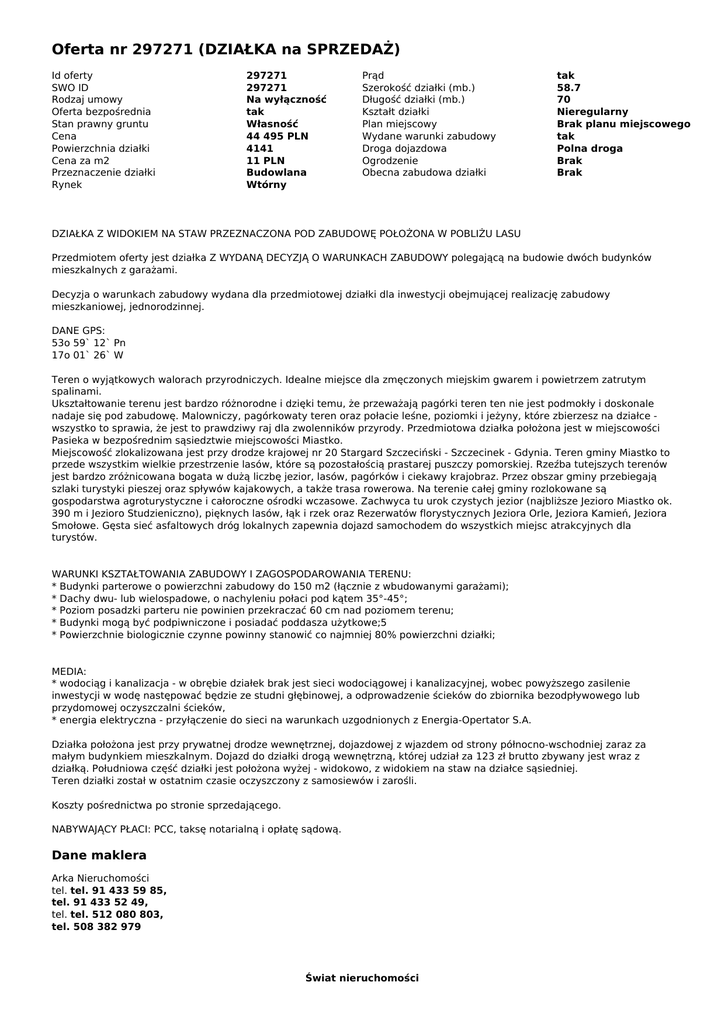 Oferta nr 297271 (DZIAŁKA na SPRZEDAŻ) Id oferty SWO ID Rodzaj umowy Oferta bezpośrednia Stan prawny gruntu Cena Powierzchnia działki Cena za m2 Przeznaczenie działki Rynek 297271 297271 Na wyłączność tak Własność 44 495 PLN 4141 11 PLN Budowlana Wtórny Prąd Szerokość działki (mb.) Długość działki (mb.) Kształt działki Plan miejscowy Wydane warunki zabudowy Droga dojazdowa Ogrodzenie Obecna zabudowa działki tak 58.7 70 Nieregularny Brak planu miejscowego tak Polna droga Brak Brak DZIAŁKA Z WIDOKIEM NA STAW PRZEZNACZONA POD ZABUDOWĘ POŁOŻONA W POBLIŻU LASU Przedmiotem oferty jest działka Z WYDANĄ DECYZJĄ O WARUNKACH ZABUDOWY polegającą na budowie dwóch budynków mieszkalnych z garażami. Decyzja o warunkach zabudowy wydana dla przedmiotowej działki dla inwestycji obejmującej realizację zabudowy mieszkaniowej, jednorodzinnej. DANE GPS: 53o 59` 12` Pn 17o 01` 26` W Teren o wyjątkowych walorach przyrodniczych. Idealne miejsce dla zmęczonych miejskim gwarem i powietrzem zatrutym spalinami. Ukształtowanie terenu jest bardzo różnorodne i dzięki temu, że przeważają pagórki teren ten nie jest podmokły i doskonale nadaje się pod zabudowę. Malowniczy, pagórkowaty teren oraz połacie leśne, poziomki i jeżyny, które zbierzesz na działce wszystko to sprawia, że jest to prawdziwy raj dla zwolenników przyrody. Przedmiotowa działka położona jest w miejscowości Pasieka w bezpośrednim sąsiedztwie miejscowości Miastko. Miejscowość zlokalizowana jest przy drodze krajowej nr 20 Stargard Szczeciński - Szczecinek - Gdynia. Teren gminy Miastko to przede wszystkim wielkie przestrzenie lasów, które są pozostałością prastarej puszczy pomorskiej. Rzeźba tutejszych terenów jest bardzo zróżnicowana bogata w dużą liczbę jezior, lasów, pagórków i ciekawy krajobraz. Przez obszar gminy przebiegają szlaki turystyki pieszej oraz spływów kajakowych, a także trasa rowerowa. Na terenie całej gminy rozlokowane są gospodarstwa agroturystyczne i całoroczne ośrodki wczasowe. Zachwyca tu urok czystych jezior (najbliższe Jezioro Miastko ok. 390 m i Jezioro Studzieniczno), pięknych lasów, łąk i rzek oraz Rezerwatów florystycznych Jeziora Orle, Jeziora Kamień, Jeziora Smołowe. Gęsta sieć asfaltowych dróg lokalnych zapewnia dojazd samochodem do wszystkich miejsc atrakcyjnych dla turystów. WARUNKI KSZTAŁTOWANIA ZABUDOWY I ZAGOSPODAROWANIA TERENU: * Budynki parterowe o powierzchni zabudowy do 150 m2 (łącznie z wbudowanymi garażami); * Dachy dwu- lub wielospadowe, o nachyleniu połaci pod kątem 35°-45°; * Poziom posadzki parteru nie powinien przekraczać 60 cm nad poziomem terenu; * Budynki mogą być podpiwniczone i posiadać poddasza użytkowe;5 * Powierzchnie biologicznie czynne powinny stanowić co najmniej 80% powierzchni działki; MEDIA: * wodociąg i kanalizacja - w obrębie działek brak jest sieci wodociągowej i kanalizacyjnej, wobec powyższego zasilenie inwestycji w wodę następować będzie ze studni głębinowej, a odprowadzenie ścieków do zbiornika bezodpływowego lub przydomowej oczyszczalni ścieków, * energia elektryczna - przyłączenie do sieci na warunkach uzgodnionych z Energia-Opertator S.A. Działka położona jest przy prywatnej drodze wewnętrznej, dojazdowej z wjazdem od strony północno-wschodniej zaraz za małym budynkiem mieszkalnym. Dojazd do działki drogą wewnętrzną, której udział za 123 zł brutto zbywany jest wraz z działką. Południowa część działki jest położona wyżej - widokowo, z widokiem na staw na działce sąsiedniej. Teren działki został w ostatnim czasie oczyszczony z samosiewów i zarośli. Koszty pośrednictwa po stronie sprzedającego. NABYWAJĄCY PŁACI: PCC, taksę notarialną i opłatę sądową. Dane maklera Arka Nieruchomości tel. tel. 91 433 59 85, tel. 91 433 52 49, tel. tel. 512 080 803, tel. 508 382 979 Świat nieruchomości Świat nieruchomości Powered by TCPDF (www.tcpdf.org)
