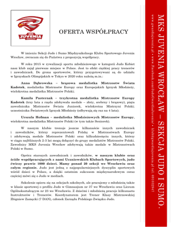 Kamila Pasternak – trzykrotna medalistka Mistrzostw Europy Kadetek (trzy lata z rzędu zdobywała medale – złoty, srebrny i brązowy), piąta zawodniczka Mistrzostw Świata Juniorek, wielokrotna Mistrzyni Polski; uczestniczka Światowych Igrzysk Młodzieży (odbywają się raz na 4 lata); Urszula Hofman – medalistka Młodzieżowych Mistrzostw Europy, wielokrotna medalistka Mistrzostw Polski (w tym także Seniorek). Oprócz starszych zawodniczek i zawodników, w naszym klubie oraz ściśle współpracujących z nami Uczniowskich Klubach Sportowych, judo ćwiczy prawie 1000 dzieci. Mamy ponad 20 sekcji we Wrocławiu oraz całym regionie. Judo jest jedną z najpopularniejszych dyscyplin sportowych wśród dzieci w Polsce, a dzięki ostatnim sukcesom międzynarodowym coraz częściej mówi się o Judo w mediach. Szkolenie opiera się na sekcjach szkolnych, ale pracujemy z młodzieżą także w klasie sportowej o profilu Judo w Gimnazjum nr 37 we Wrocławiu oraz Liceum Ogólnokształcącym nr 23 we Wrocławiu. Z dziećmi i młodzieżą pracuje kilkunastu Instruktorów i Trenerów. Koordynatorem jest Trener Klasy Mistrzowskiej Zbigniew Zamęcki (7 DAN), członek Zarządu Polskiego Związku Judo. [email protected] tel. 691032947 W naszym klubie trenuje jeszcze kilkanaście innych zawodniczek i zawodników, którzy reprezentowali Polskę w Mistrzostwach Europy i zdobywają medale Mistrzostw Polski oraz kilkudziesięciu innych, którzy w ciągu najbliższych 2-3 lat mogą dołączyć do grupy medalistów Mistrzostw Polski. Zawodnicy MKS Juvenia Wrocław zdobywają także medale w Mistrzostwach Polski w Sumo. MKS JUVENIA WROCŁAW – SEKCJA JUDO I SUMO Anna Dąbrowska – brązowa medalistka Mistrzostw Świata Kadetek, medalistka Mistrzostw Europy oraz Europejskich Igrzysk Młodzieży, wielokrotna medalistka Mistrzostw Polski; www.Facebook .com/JudoGwardiaJuvenia/ W roku 2015 w rywalizacji sportu młodzieżowego w kategorii Judo Kobiet nasz klub zajął pierwsze miejsce w Polsce. Jest to efekt ciężkiej pracy trenerów i zawodniczek. Do grona sportowców, którzy przygotowywani są do udziału w Igrzyskach Olimpijskich w Tokyo w 2020 roku należą m.in.: W imieniu Sekcji Judo i Sumo Międzyszkolnego Klubu Sportowego Juvenia Wrocław, zwracam się do Państwa z propozycją współpracy. www.gwardiajuveni a.pl OFERTA WSPÓŁPRACY - reklamę na dresach klubowych, w których zawodnicy występują w trakcie zawodów, zgrupowań oraz innych akcjach szkoleniowych; - udział w akcjach promocyjnych Państwa firmy, jeśli nie będzie to kolidowało z kalendarzem imprez zawodnika, tzn. piknikach, podsumowaniach roku, oraz innych firmowych wydarzeniach; - reklamę Państwa firmy na dresie oraz ubiorze sportowym sztabu szkoleniowego – Trenerów oraz innych członków zespołu; - reklamę Państwa firmy w trakcie zawodów organizowanych przez nasz klub. W tym roku organizujemy Puchar Polski Seniorów, Otwarty Puchar Polski Kadetów i Juniorów, w którym co rocznie startuje około 700 zawodników z kilkunastu krajów, Mistrzostwa Polski Juniorów; dotyczy to banerów, roll-upów i innych reklam w hali oraz dużego baneru za podium; stoiska Państwa firmy w trakcie - pierwszeństwo w podjęciu współpracy w kolejnym okresie. Czas, na jaki proponujemy współpracę to 12 miesięcy. Od 1 października 2016 roku do 30 września 2017 roku. Pakiet to 10 000 złotych na rok, czyli mniej niż 850 złotych na miesiąc. Liczymy, że dzięki współpracy z Państwem, nasi zawodnicy będą osiągać jeszcze lepsze wyniki sportowe, w szczególności w Pucharach Europy, Mistrzostwach Europy i Świata, a Państwa firma dotrze do dużej liczby odbiorców, jakimi są rodzice, dzieci i sympatycy Judo na Dolnym Śląsku i w Polsce. [email protected] tel. 691032947 - możliwość wystawienia zawodów, które organizujemy; - reklamę w trakcie zawodów dzieci, które organizujemy, około 5-6 turniejów w roku, w każdym startuje między 250 a 700 dzieci; www.Facebook.com/Judo GwardiaJuvenia/ - udział w reklamach Państwa firmy w prasie, telewizji, portalach internetowych, możliwość wykorzystania wizerunku naszych zawodników; - reklama na stronie klubowej www.gwardiajuvenia.pl oraz profilu na portalu społecznościowym Facebook, regularne promowanie Państwa firmy na ww. stronach; MKS JUVENIA WROCŁAW – SEKCJA JUDO I SUMO - reklamę na judogach zawodników startujących w zawodach ogólnopolskich, czyli około 60 osób, wszyscy nasi sponsorzy będą zamieszczeni na naszywkach na plecach, na tzw. Backnumberach; www.gwardiajuvenia.pl Ze swojej strony możemy zaoferować: Zapewnienie szkolenia, sprzętu, opieki lekarskiej i fizjoterapeutycznej tak dużej liczbie zawodników, którzy prezentują wysoki poziom sportowy, to duże wyzwanie, także finansowe. Poszukujemy sposorów, którzy wesprą nasz klub.