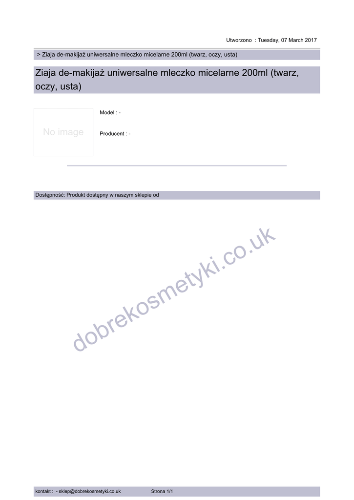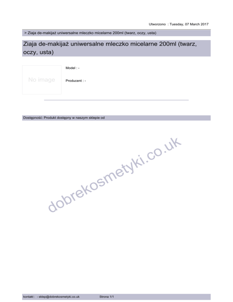 Utworzono : Tuesday, 07 March 2017 > Ziaja de-makijaż uniwersalne mleczko micelarne 200ml (twarz, oczy, usta) Ziaja de-makijaż uniwersalne mleczko micelarne 200ml (twarz, oczy, usta) Model : - No image Producent : - Dostępność: Produkt dostępny w naszym sklepie od y t e k u . o c . i k m s o k e br do kontakt : - [email protected] Strona 1/1