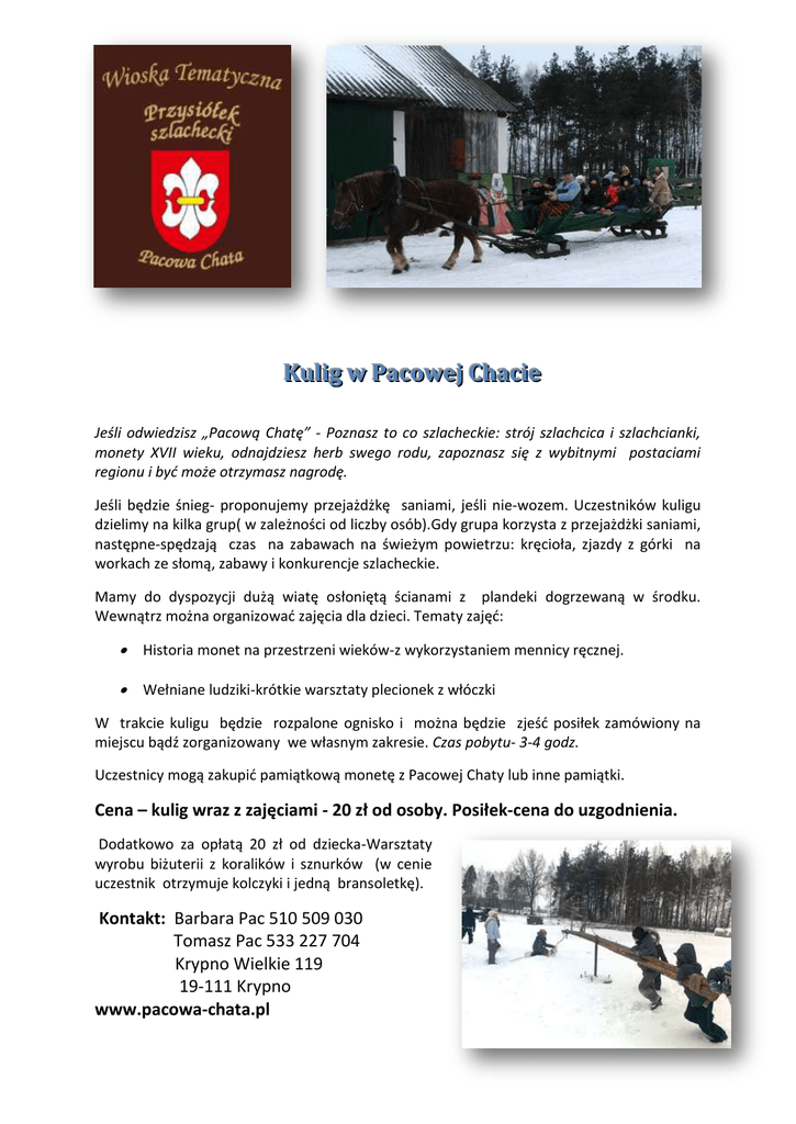 K Kuulliigg w wP Paaccoow weejj CChhaacciiee Jeśli odwiedzisz „Pacową Chatę” - Poznasz to co szlacheckie: strój szlachcica i szlachcianki, monety XVII wieku, odnajdziesz herb swego rodu, zapoznasz się z wybitnymi postaciami regionu i być może otrzymasz nagrodę. Jeśli będzie śnieg- proponujemy przejażdżkę saniami, jeśli nie-wozem. Uczestników kuligu dzielimy na kilka grup( w zależności od liczby osób).Gdy grupa korzysta z przejażdżki saniami, następne-spędzają czas na zabawach na świeżym powietrzu: kręcioła, zjazdy z górki na workach ze słomą, zabawy i konkurencje szlacheckie. Mamy do dyspozycji dużą wiatę osłoniętą ścianami z plandeki dogrzewaną w środku. Wewnątrz można organizować zajęcia dla dzieci. Tematy zajęć:  Historia monet na przestrzeni wieków-z wykorzystaniem mennicy ręcznej.  Wełniane ludziki-krótkie warsztaty plecionek z włóczki W trakcie kuligu będzie rozpalone ognisko i można będzie zjeść posiłek zamówiony na miejscu bądź zorganizowany we własnym zakresie. Czas pobytu- 3-4 godz. Uczestnicy mogą zakupić pamiątkową monetę z Pacowej Chaty lub inne pamiątki. Cena – kulig wraz z zajęciami - 20 zł od osoby. Posiłek-cena do uzgodnienia. Dodatkowo za opłatą 20 zł od dziecka-Warsztaty wyrobu biżuterii z koralików i sznurków (w cenie uczestnik otrzymuje kolczyki i jedną bransoletkę). Kontakt: Barbara Pac 510 509 030 Tomasz Pac 533 227 704 Krypno Wielkie 119 19-111 Krypno www.pacowa-chata.pl