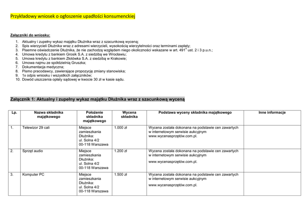 Przykładowy wniosek o ogłoszenie upadłości konsumenckiej Załączniki do wniosku: 1. 2. 3. 4. 5. 6. 7. 8. 9. 10. Aktualny i zupełny wykaz majątku Dłużnika wraz z szacunkową wyceną; Spis wierzycieli Dłużnika wraz z adresami wierzycieli, wysokością wierzytelności oraz terminami zapłaty; 4 Pisemne oświadczenie Dłużnika, że nie zachodzą względem niego okoliczności wskazane w art. 491 ust. 2 i 3 p.u.n.; Umowa kredytu z bankiem Grosik S.A. z siedzibą we Wrocławiu; Umowa kredytu z bankiem Złotówka S.A. z siedzibą w Krakowie; Umowa najmu ze spółdzielnią Gruszka; Dokumentacja medyczna; Pismo pracodawcy, zawierające propozycję zmiany stanowiska; 1x odpis wniosku i wszystkich załączników; Dowód uiszczenia opłaty sądowej w kwocie 30 zł w kasie sądu. Załącznik 1: Aktualny i zupełny wykaz majątku Dłużnika wraz z szacunkową wyceną Lp. Nazwa składnika majątkowego Położenie składnika majątkowego Wycena składnika Podstawa wyceny składnika majątkowego 1. Telewizor 29 cali Miejsce zamieszkania Dłużnika: ul. Solna 4/2 00-118 Warszawa 1.000 zł Wycena została dokonana na podstawie cen zawartych w internetowym serwisie aukcyjnym www.wycenasprzętów.com.pl. 2. Sprzęt audio Miejsce zamieszkania Dłużnika: ul. Solna 4/2 00-118 Warszawa 1.200 zł Wycena została dokonana na podstawie cen zawartych w internetowym serwisie aukcyjnym Miejsce zamieszkania Dłużnika: ul. Solna 4/2 00-118 Warszawa 1.500 zł 3. Komputer PC www.wycenasprzętów.com.pl. Wycena została dokonana na podstawie cen zawartych w internetowym serwisie aukcyjnym www.wycenasprzętów.com.pl. Inne informacje Przykładowy wniosek o ogłoszenie upadłości konsumenckiej 4. Drobny sprzęt kuchenny, pościel i inne urządzenia codziennej potrzeby Miejsce zamieszkania Dłużnika: 300zł ul. Solna 4/2 00-118 Warszawa 5. Gotówka Miejsce zamieszkania Dłużnika: ul. Solna 4/2 00-118 Warszawa ______________________ podpis 1500zł Wycena została dokonana według cen z serwisu internetowego www.uzywanewyposazenie.pl Przykładowy wniosek o ogłoszenie upadłości konsumenckiej Załącznik 2: Spis wierzycieli Dłużnika wraz z adresami wierzycieli, wysokością wierzytelności oraz terminami zapłaty Lp. Wierzyciel Adres wierzyciela Źródło powstania wierzytelności Wysokość wierzytelności 1. Grosik S.A. z siedzibą we Wrocławiu ul. Wejherowska 15 12345 Wrocław umowa kredytu nr 1324/32134 8.500 zł – (w tym 500 zł odsetek) stan na dzień 5 stycznia 2014 r. Złotówka S.A. z siedzibą w Krakowie ul. Reńska 68D 09-874 Kraków umowa kredytu nr 432421/3213213 5.500 zł – (w tym 500 zł odsetek) stan na dzień 5 stycznia 2014 r. Spółdzielnia Mieszkaniowa „Gruszka” ul. Kwaśnych Jabłek 3 12-356 Warszawa zobowiązania z czynszu najmu 3.300 zł – (w tym 300 zł odsetek) stan na dzień 5 stycznia 2014 r. 2. 3. ______________________ podpis Termin zapłaty i cząstkowa kwota zapłaty 20.04.2014. 800 zł 20.05.2014. 800 zł 20.06.2014. 800 zł 20.07.2014. 800 zł 20.08.2014. 800 zł 20.09.2014. 800 zł 20.10.2014. 800 zł 20.11.2014. 800 zł 20.12.2014. 800 zł 20.01.2015. 800 zł 07.06.2014. 1.000 zł 07.07.2014. 1.000 zł 07.08.2014. 1.000 zł 07.09.2014. 1.000 zł 07.10.2014. 1.000 zł 10.09.2014. 750 zł 10.10.2014. 750 zł 10.11.2014. 750 zł 10.12.2014. 750 zł Inne informacje Przykładowy wniosek o ogłoszenie upadłości konsumenckiej Załącznik 3: Pisemne oświadczenie Dłużnika, że nie zachodzą względem niego okoliczności wskazane w art. 491 4 ust. 2 i 3 p.u.n. Oświadczenie Dłużnika 4 Ja niżej podpisany Jan Gładki, oświadczam, że zapoznałem się z treścią art. 491 ust. 2 i 3 ustawy z dnia 28 lutego 2003 r. Prawo upadłościowe i naprawcze (Dz. U. z 2014 r., poz. 1626): 4 Art. 491 . 1. Sąd oddala wniosek o ogłoszenie upadłości, jeżeli dłużnik doprowadził do swojej niewypłacalności lub istotnie zwiększył jej stopień umyślnie lub wskutek rażącego niedbalstwa. 2. Sąd oddala wniosek o ogłoszenie upadłości, jeżeli w okresie dziesięciu lat przed dniem zgłoszenia wniosku: 1) w stosunku do dłużnika prowadzono postępowanie upadłościowe według przepisów tytułu niniejszego, jeżeli postępowanie to zostało umorzone z innych przyczyn niż na wniosek dłużnika, 20 2) ustalony dla dłużnika plan spłaty wierzycieli uchylono na podstawie przepisu art. 491 , 3) dłużnik, mając taki obowiązek, wbrew przepisom ustawy nie zgłosił w terminie wniosku o ogłoszenie upadłości, 4) czynność prawna dłużnika została prawomocnie uznana za dokonaną z pokrzywdzeniem wierzycieli chyba że przeprowadzenie postępowania jest uzasadnione względami słuszności lub względami humanitarnymi. 3. Sąd oddala wniosek o ogłoszenie upadłości, jeżeli w okresie dziesięciu lat przed dniem zgłoszenia wniosku w stosunku do dłużnika prowadzono postępowanie upadłościowe, w którym umorzono całość lub część jego zobowiązań, chyba że do niewypłacalności dłużnika lub zwiększenia jej stopnia doszło pomimo dochowania przez dłużnika należytej staranności lub przeprowadzenie postępowania jest uzasadnione względami słuszności lub względami humanitarnymi. 4. Sąd oddala wniosek o ogłoszenie upadłości, jeżeli dane podane przez dłużnika we wniosku są niezgodne z prawdą lub niezupełne, chyba że niezgodność lub niezupełność nie są istotne lub przeprowadzenie postępowania jest uzasadnione względami słuszności lub względami humanitarnymi. 4 i nie zachodzą względem mojej osoby okoliczności wymienione w art. 491 ust. 2 i 3 ustawy tej ustawy. Warszawa, dnia 7 stycznia 2015 r. ______________________ podpis