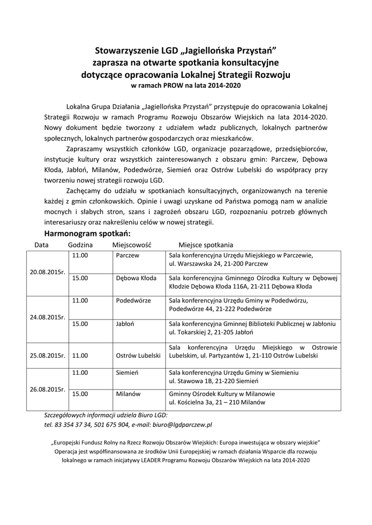 Stowarzyszenie LGD „Jagiellońska Przystań” zaprasza na otwarte spotkania konsultacyjne dotyczące opracowania Lokalnej Strategii Rozwoju w ramach PROW na lata 2014-2020 Lokalna Grupa Działania „Jagiellońska Przystań” przystępuje do opracowania Lokalnej Strategii Rozwoju w ramach Programu Rozwoju Obszarów Wiejskich na lata 2014-2020. Nowy dokument będzie tworzony z udziałem władz publicznych, lokalnych partnerów społecznych, lokalnych partnerów gospodarczych oraz mieszkańców. Zapraszamy wszystkich członków LGD, organizacje pozarządowe, przedsiębiorców, instytucje kultury oraz wszystkich zainteresowanych z obszaru gmin: Parczew, Dębowa Kłoda, Jabłoń, Milanów, Podedwórze, Siemień oraz Ostrów Lubelski do współpracy przy tworzeniu nowej strategii rozwoju LGD. Zachęcamy do udziału w spotkaniach konsultacyjnych, organizowanych na terenie każdej z gmin członkowskich. Opinie i uwagi uzyskane od Państwa pomogą nam w analizie mocnych i słabych stron, szans i zagrożeń obszaru LGD, rozpoznaniu potrzeb głównych interesariuszy oraz nakreśleniu celów w nowej strategii. Harmonogram spotkań: Data Godzina 20.08.2015r. 24.08.2015r. Miejsce spotkania 11.00 Parczew Sala konferencyjna Urzędu Miejskiego w Parczewie, ul. Warszawska 24, 21-200 Parczew 15.00 Dębowa Kłoda Sala konferencyjna Gminnego Ośrodka Kultury w Dębowej Kłodzie Dębowa Kłoda 116A, 21-211 Dębowa Kłoda 11.00 Podedwórze Sala konferencyjna Urzędu Gminy w Podedwórzu, Podedwórze 44, 21-222 Podedwórze 15.00 Jabłoń Sala konferencyjna Gminnej Biblioteki Publicznej w Jabłoniu ul. Tokarskiej 2, 21-205 Jabłoń 25.08.2015r. 11.00 26.08.2015r. Miejscowość Ostrów Lubelski Sala konferencyjna Urzędu Miejskiego w Ostrowie Lubelskim, ul. Partyzantów 1, 21-110 Ostrów Lubelski 11.00 Siemień Sala konferencyjna Urzędu Gminy w Siemieniu ul. Stawowa 1B, 21-220 Siemień 15.00 Milanów Gminny Ośrodek Kultury w Milanowie ul. Kościelna 3a, 21 – 210 Milanów Szczegółowych informacji udziela Biuro LGD: tel. 83 354 37 34, 501 675 904, e-mail: [email protected] „Europejski Fundusz Rolny na Rzecz Rozwoju Obszarów Wiejskich: Europa inwestująca w obszary wiejskie” Operacja jest współfinansowana ze środków Unii Europejskiej w ramach działania Wsparcie dla rozwoju lokalnego w ramach inicjatywy LEADER Programu Rozwoju Obszarów Wiejskich na lata 2014-2020