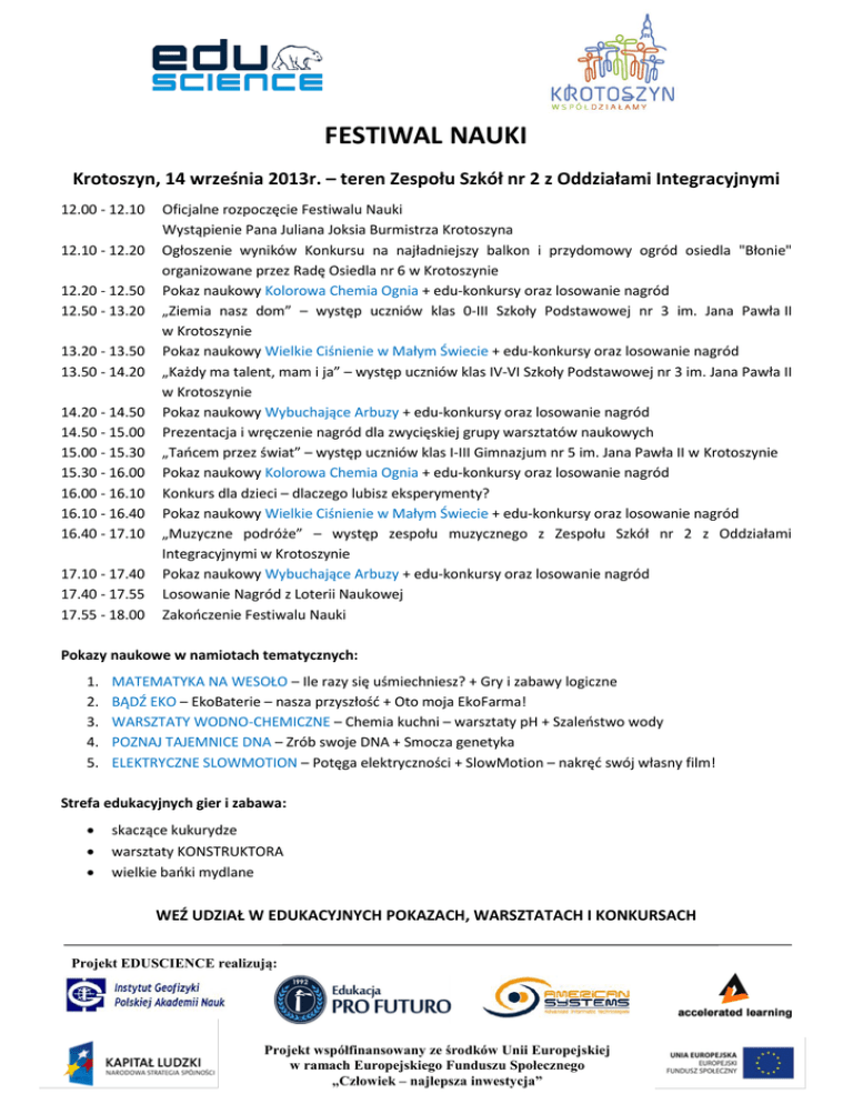 FESTIWAL NAUKI Krotoszyn, 14 września 2013r. – teren Zespołu Szkół nr 2 z Oddziałami Integracyjnymi 12.00 - 12.10 12.10 - 12.20 12.20 - 12.50 12.50 - 13.20 13.20 - 13.50 13.50 - 14.20 14.20 - 14.50 14.50 - 15.00 15.00 - 15.30 15.30 - 16.00 16.00 - 16.10 16.10 - 16.40 16.40 - 17.10 17.10 - 17.40 17.40 - 17.55 17.55 - 18.00 Oficjalne rozpoczęcie Festiwalu Nauki Wystąpienie Pana Juliana Joksia Burmistrza Krotoszyna Ogłoszenie wyników Konkursu na najładniejszy balkon i przydomowy ogród osiedla "Błonie" organizowane przez Radę Osiedla nr 6 w Krotoszynie Pokaz naukowy Kolorowa Chemia Ognia + edu-konkursy oraz losowanie nagród „Ziemia nasz dom” – występ uczniów klas 0-III Szkoły Podstawowej nr 3 im. Jana Pawła II w Krotoszynie Pokaz naukowy Wielkie Ciśnienie w Małym Świecie + edu-konkursy oraz losowanie nagród „Każdy ma talent, mam i ja” – występ uczniów klas IV-VI Szkoły Podstawowej nr 3 im. Jana Pawła II w Krotoszynie Pokaz naukowy Wybuchające Arbuzy + edu-konkursy oraz losowanie nagród Prezentacja i wręczenie nagród dla zwycięskiej grupy warsztatów naukowych „Tańcem przez świat” – występ uczniów klas I-III Gimnazjum nr 5 im. Jana Pawła II w Krotoszynie Pokaz naukowy Kolorowa Chemia Ognia + edu-konkursy oraz losowanie nagród Konkurs dla dzieci – dlaczego lubisz eksperymenty? Pokaz naukowy Wielkie Ciśnienie w Małym Świecie + edu-konkursy oraz losowanie nagród „Muzyczne podróże” – występ zespołu muzycznego z Zespołu Szkół nr 2 z Oddziałami Integracyjnymi w Krotoszynie Pokaz naukowy Wybuchające Arbuzy + edu-konkursy oraz losowanie nagród Losowanie Nagród z Loterii Naukowej Zakończenie Festiwalu Nauki Pokazy naukowe w namiotach tematycznych: 1. 2. 3. 4. 5. MATEMATYKA NA WESOŁO – Ile razy się uśmiechniesz? + Gry i zabawy logiczne BĄDŹ EKO – EkoBaterie – nasza przyszłość + Oto moja EkoFarma! WARSZTATY WODNO-CHEMICZNE – Chemia kuchni – warsztaty pH + Szaleństwo wody POZNAJ TAJEMNICE DNA – Zrób swoje DNA + Smocza genetyka ELEKTRYCZNE SLOWMOTION – Potęga elektryczności + SlowMotion – nakręć swój własny film! Strefa edukacyjnych gier i zabawa: skaczące kukurydze warsztaty KONSTRUKTORA wielkie bańki mydlane WEŹ UDZIAŁ W EDUKACYJNYCH POKAZACH, WARSZTATACH I KONKURSACH Projekt EDUSCIENCE realizują: Projekt współfinansowany ze środków Unii Europejskiej w ramach Europejskiego Funduszu Społecznego „Człowiek – najlepsza inwestycja”