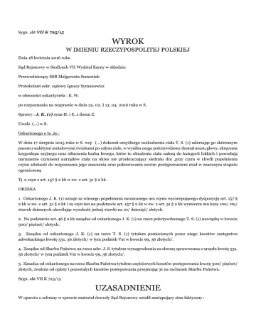 Sygn. akt VII K 725/15 WYROK W IMIENIU RZECZYPOSPOLITEJ POLSKIEJ Dnia 18 kwietnia 2016 roku Sąd Rejonowy w Siedlcach VII Wydział Karny w składzie: Przewodniczący SSR Małgorzata Semeniuk Protokolant sekr. sądowy Ignacy Symanowicz w obecności oskarżyciela : K. W. po rozpoznaniu na rozprawie w dniu 25. 02. I 13. 04. 2016 roku w S. Sprawy : J. K. (1) syna H. i E. z domu Z. Urodz. (...) w S. Oskarżonego o to ,że : W dniu 17 sierpnia 2015 roku w S. woj. (...) dokonał umyślnego uszkodzenia ciała T. S. (1) uderzając go skórzanym pasem z nabitymi metalowymi ćwiekami po całym ciele, w wyniku czego pokrzywdzony doznał urazu głowy, skręcenia kręgosłupa szyjnego oraz stłuczenia barku lewego, które to obrażenia ciała nalezą do kategorii lekkich i powodują naruszenie czynności narządów ciała na okres nie przekraczający siedmiu dni ,przy czym w chwili popełnienia czynu zdolność do rozpoznania jego znaczenia oraz pokierowania sowim postępowaniem miał w znacznym stopniu ograniczoną Tj. o czyn z art. 157 § 2 kk w zw. z art. 31 § 2 kk. ORZEKA 1. Oskarżonego J. K. (1) uznaje za winnego popełnienia zarzucanego mu czynu wyczerpującego dyspozycję art. 157 § 2 kk w zw. z art. 31 § 2 kk i za czyn ten na podstawie art. 157 § 2 kk w zw. z art. 31 § 2 kk wymierza mu karę 100/ stu/ stawek dziennych określając wysokość jednej stawki na 10/ dziesięć/ złotych. 2. Na podstawie art. 46 § 2 kk zasądza od oskarżonego J. K. (1) na rzecz pokrzywdzonego T. S. (1) nawiązkę w kwocie 500/ pięćset/ złotych. 3. Zasądza od oskarżonego J. K. (1) na rzecz T. S. (1) tytułem poniesionych przez niego kosztów zastępstwa adwokackiego kwotę 531, 36 złotych/ w tym podatek Vat w kwocie 99, 36 złotych/. 4. Zasądza od Skarbu Państwa na rzecz adw. J. S. tytułem wynagrodzenia za obronę sprawowana z urzędu kwotę 531, 36 złotych/ w tym podatek Vat w kwocie 99, 36 złotych/. 5. Zasadza od oskarżonego na rzecz Skarbu Państwa tytułem częściowych kosztów postępowania kwotę 500/ pięćset/ złotych, zwalnia od opłaty i pozostałych kosztów postepowania przejmując je na rachunek Skarbu Państwa. Sygn. akt VII K 725/15 UZASADNIENIE W oparciu o zebrany w sprawie materiał dowody Sąd Rejonowy ustalił następujący stan faktyczny : J. K. (1) i pokrzywdzony T. S. (1) mieszkają w jednym bloku przy ulicy (...) w S.. Pomiędzy mężczyznami istnieje od kilku lat konflikt dotyczący użytkowania pomieszczenia gospodarczego które znajduje się na tzw. półpiętrze bloku. W dniu 17 sierpnia 2015 roku T. S. (1) zauważył ,że zamek w drzwiach prowadzących do tego pomieszczenia jest uszkodzony ,wiec w godzinach południowych rozpoczął naprawę zamka. Gdy usłyszał to J. K. (1) wszedł na miejsce gdzie znajduje się pomieszczenie i zaczął w słowach wulgarnych kłócić się z T. S. (1) na temat użytkowania tego pomieszczenia. J. K. (1) wszedł na chwile do swego mieszkania i wyniósł stamtąd pas skórzanym z elementami metalowymi , zaczął uderzać nim T. S. (1) po górnych częściach ciała. T. S. (1) osłaniał się rękami, pobiegł do sąsiadki S. B. aby poprosić ją o pomoc i możliwość wezwania policji. W tym czasie J. K. (1) wyrzucił przez okno wiertarkę która pracował pokrzywdzony. T. S. (1) w wyniku zdarzenia doznał urazu głowy bez zewnętrznych śladów, skręcenia kręgosłupa szyjnego i stłuczenia barku lewego, które to obrażenia należą do kategorii lekkich. Powyższe ustalenia faktyczne poczyniono w oparciu o: częściowe wyjaśnienia J. K. (1) /k 40 -41v z ujawnionymi k 35/, zeznania T. S. (1) /k 41v-42 z ujawnionymi z k 2/,L. K. /k 42v-43 z ujawnionymi k 17-18/, S. B. /k 51/. Podstawę ustalenia stanu faktycznego stanowiły też następujące dowody : dokumentacja medyczna to. T. S. /k 5/, opinia sądowo lekarska M. R. /k 20 , 50v/, opinia sądowo- psychiatryczna dot. oskarżonego /k 49-54/, dane o osobie / k 40/, dane o karalności / k41-42/. Mniejsze znaczenie dla merytorycznego rozstrzygnięcia sprawy miały dokumenty złożone przez strony na rozprawie : wydruki „listów” jakie zostały pozostawione T. S. /k 25-33/, odpis umowy najmu /k 44/, pismo do (...)/ k 45/,pozew o eksmisje /k 46/, pismo J. K. do Prokuratury Rejonowej ze skargą na policję /k 47/, odpisy karty informacyjnej z Izby Przyjęć dot. J. K. /k 48/.odpis wyroku w sprawie VII W 1013/ 14/ k 34/. J. K. (1) w postępowaniu przygotowawczym jak i na rozprawie nie przyznał się do postawionego mu zarzutu, Wyjaśnił ,że w dniu zdarzenia usłyszał ,że jego sąsiad T. S. (1) wstawia zamek do pomieszczenia gospodarczego które znajduje się na półpiętrze. Zdenerwowało go to. Doszło pomiędzy nimi do sprzeczki w trakcie której uderzył S. przedłużaczem od wiertarki , po czym wiertarkę wyrzucił przez okno .Nie uderzył S. żądnym pasem z ćwiekami, chociaż w domu posiada obrożę dla psa która jest pasem z metalowymi ćwiekami. Jak wynika z opinii sądowo- psychiatrycznej -J. K. (1) jest osoba chorą psychicznie, lecz nie jest upośledzony umysłowo. W zakresie zarzucanego mu czynu zdolność do rozpoznania jego znaczenia i pokierowania swoim postępowaniem miał ograniczoną w stopniu znacznym. Sąd zważył co następuje : Wyjaśnienia J. K. (1) który nie przyznaje się do winy są w większości wiarygodne, gdyż nie kwestionuje on w swych zeznaniach tego ,że uderzył T. S. (1) ale zrobił to przy pomocy kabla od wiertarki. Tymczasem nie tylko zeznania T. S. (1) ale też zeznania świadka L. K. zgodnie wskazują ,że J. K. (1) posługiwał się paskiem który posiadał metalowe elementy. Takie narzędzie nie spowodowało jednak śladów w postaci ran czy podbiegnięć krwawych, ale spowodowały stłuczenie kręgosłupa , barku i urazu głowy / bez widocznych obrażeń zewnętrznych/, uderzenia były dla pokrzywdzonego na tyle dotkliwe, że zmuszony był zasięgnąć porady lekarskiej. T. S. (1) w swych zeznaniach wskazał ,że w dniu zdarzenia J. K