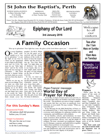 St John the Baptist's, Perth SUNDAY MASS in St JOHN’S 6.30pm (Saturday Vigil) & on Sunday 9am, 11am, 6.30pm WEEKDAYS Monday-Saturday at 10am, Tuesday 7pm MSZA ŚW. PO POLSKU Niedziela 5pm Pojednania 4.15pm RECONCILIATION in St John’s Saturday 5-6pm Priests: Very Rev. Martin Canon Drysdale STL VG, St John’s Presbytery, 20 Melville Street, Perth, PH1 5PY (01738 622241) Rev. Bogdan Palka SDS 16 Melville Street Perth PH1 5PY (01738 564182) Permanent Deacon: Rev. Len Moir (01738 451677) Epiphany of Our Lord 3rd January 2016 A Family Occasion “Rise up in splendour! Your light has come, the glory of the Lord shines upon you.” —Isaiah 60:1 O n every Epiphany, the Lord commands us to “rise up in splendour,” to put the light of our lives in Christ on the lampstand to give light to all in darkness (see Lk 8:16). We must let our “little light shine” and let the world know the true message of Christmas — that Jesus became a human being, was born, died on a cross, and rose from the dead to save us. Before we rise up, we must see two things. First, we must see what God has done for us, His glory shining on us (Is 60:2). Then, we must see what sin and Satan have done to the world, for “darkness covers the earth, and thick clouds cover the peoples” (Is 60:2). When we see the grace we’ve received and the deadly darkness of the world, we know we have the responsibility and the power to rise up. “For God, Who said, ‘Let light shine out of darkness,’ has shone in our hearts, that we in turn might make known the glory of God shining on the face of Christ” (2 Cor 4:6). To rise, we must see. To see, we must repent. On this greatest day of the Christmas season, let’s give Jesus three gifts — not gold, frankincense, and myrrh, but repentance, seeing, and rising. Jesus gave us the gift of His birth. May we give Him the gift of new birth for many in darkness. For this Sunday’s Mass Responsorial Psalm All nations shall fall prostrate before you, O Lord. Gospel Acclamation We saw his star as it rose and have come to do the Lord homage. Welcome to all our visitors Teas after the 11am Mass on Sunday and 10am Mass on Tuesdays Priests for Scotland A LIFE WORTH LIVING Pope Francis’ message World Day of Prayer for Peace Every day, we hear of issues such as war, poverty, or persecution that affect our brothers and sisters around the world. The problems can seem so large, complex, and remote that they can leave us paralysed, overwhelmed, or even numb. We may wonder, “What can I possibly do?” In his Message for the 49th World Day of Peace, to be celebrated on Jan. 1, 2016, Pope Francis urges us to overcome such challenges by replacing isolation with community, and indifference with solidarity. In our families, schools, and institutions, we must foster awareness about problems such as intolerance, religious persecution, slavery, war, and the plight of refugees. We must encounter our neighbours, engage in civil dialogue, cooperate, and build skills to together address these problems in meaningful ways. Working together, we can creatively overcome inaction and indifference and work toward peace and respect for the lives and dignity of all people. Diocese of Dunkeld - Scottish Charity No. SC001810 @StJohnRCPerth Prayers Please pray for the repose of the souls of Marie Melloy, Harry Marshall, Margaret McGrady, Sarah and James Campbell, Alex and Dan Campbell, Jenny and John Campbell, John O’Donnell, Mary Burke, Maureen and George Wallace, May and Allan Calder, the Baxter and Smith families, Bernie Sweeney, Walter Cunningham and Sean Sweeney and the souls of all the faithful departed. May their souls and the souls of all the faithful departed rest in peace. Amen. www.dunkelddiocese.org.uk NIEDZIELNA REFLEKSJA NAD SŁOWEM BOŻYM ... Z Błędne gwiazdy namy dobrze metodę działania zła, którą przedstawia nam dzisiejsza Ewangelia. Herod walczył z dobrem przy pomocy miecza. Przemoc to metoda, jaką zło posługuje się na przestrzeni wieków. Ofiarą tej metody był w Polsce ks. Jerzy Popiełuszko, czy niedawno beatyfikowani Polscy Franciszkanie w Ameryce Południowej. Obecnie zło zmienia metodę cztery ściany oddzielające i zaczyna coraz częściej rodzinę od świata, dające posługiwać się błędną poczucie bezpieczeństwa, gwiazdą. Metoda o wiele umożliwiające stworzenie groźniejsza. Gwiazda własnego świata, w którym bowiem jako światło, każdy może być sobą, winna prowadzić do w którym czuje się doprawdy. A jeśli odprow- brze. Same jednak ściany adza od niej, ukazuje nie czynią jeszcze domu. drogę wiodącą do trage- Betlejemska stajnia nie dii. zasługuje na miano mieszNikt z nich nie jest samot- kania, a jednak stała się ny. Każdy jest potrzebny; najszczęśliwszym domem Maryja Dziecku i mężowi; dla milionów ludzi na Józef żonie i Jezusowi, a świecie. Potrzebne jej były Niemowlę Matce i Józe- ściany dla odcięcia Tajemfowi. Oto sekret rodzin- nicy jej wnętrza od chłodu nego szczęścia. Każdy jest i ciemności nocy. Święta autentycznie potrzebny Rodzina w pierwszych lapozostałym członkom tach życia Jezusa kilkakwspólnoty rodzinnej. rotnie zmieniała miejsce Spróbujmy ustalić, jakie zamieszkania i ciągle tułała elementy są konieczne do się po cudzych kątach. budowy szczęścia rodz- Mimo to jednak była zawiny. Na pierwszy plan sze szczęśliwą rodziną. należy wysunąć spotkanie Tajemnica jej szczęścia przy stole. Stół gromadzi ukryta była we wnętrzu w jedno członków rodz- ich serc, w ich wzajemnej iny. Przy nim mogą sobie miłości. Jest jeszcze jeden spojrzeć w oczy, wymienić istotny element szczęścia uśmiechy, porozmawiać, rodzinnego – dziecko. podzielić się własnymi Ono otwiera rodzinę ku przeżyciami, wzajemnie przyszłości. Dziecko jest wysłuchać. Dla budowy żywą nadzieją całej rodzatmosfery rodzinnej spot- iny. Rodzice wychowujący kanie przy stole stanowi dziecko mają zawsze na jed