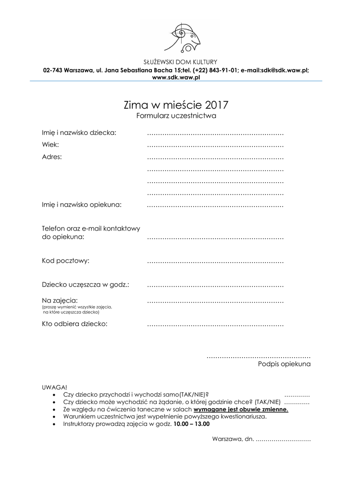 02-743 Warszawa, ul. Jana Sebastiana Bacha 15;tel. (+22) 843-91-01; e-mail:[email protected]; www.sdk.waw.pl Zima w mieście 2017 Formularz uczestnictwa Imię i nazwisko dziecka: ……………………………………………………… Wiek: ……………………………………………………… Adres: ……………………………………………………… ……………………………………………………… ……………………………………………………… ……………………………………………………… Imię i nazwisko opiekuna: ……………………………………………………… Telefon oraz e-mail kontaktowy do opiekuna: ……………………………………………………… Kod pocztowy: ……………………………………………………… Dziecko uczęszcza w godz.: ……………………………………………………… Na zajęcia: ……………………………………………………… (proszę wymienić wszystkie zajęcia, na które uczęszcza dziecko) Kto odbiera dziecko: ……………………………………………………… ………………………………………… Podpis opiekuna UWAGA! Czy dziecko przychodzi i wychodzi samo(TAK/NIE)? …………. Czy dziecko może wychodzić na żądanie, o której godzinie chce? (TAK/NIE) …………. Ze względu na ćwiczenia taneczne w salach wymagane jest obuwie zmienne. Warunkiem uczestnictwa jest wypełnienie powyższego kwestionariusza. Instruktorzy prowadzą zajęcia w godz. 10.00 – 13.00 Warszawa, dn. ……………………….