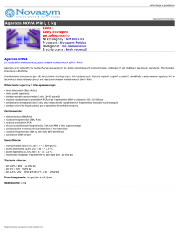Informacje o produkcie Utworzono 07-03-2017 Agaroza NOVA Mini, 1 kg Cena : Ceny dostępne po zalogowaniu Nr katalogowy : NM1001-01 Producent : Novazym Polska Dostępność : Na zamówienie Średnia ocena : brak recenzji Agaroza NOVA Do rozdziałów elektroforetycznych kwasów nukleinowych (DNA i RNA) Agaroza jest naturalnym polisacharyd izolowanym ze ścian komórkowych krasnorostów, należących do rodzajów Gelidium, Gelidella, Pterocladia, Gracillaria i Ahnfeltia. Standardowo stosowana jest do rozdziałów analitycznych lub badawczych. Bardzo wysoki stopień czystość umożliwia zastosowanie agarozy NV w technikach elektroforetycznych do rozdziału kwasów nukleinowych DNA i RNA. Właściwości agarozy / żelu agarozowego: ● ● ● ● ● ● brak obecności DNaz /RNaz niski punkt topnienia bardzo wysoka wytrzymałość żelu (1400 g/cm2) wysoka rozdzielczość produktów PCR oraz fragmentów DNA w zakresie 100 -10 000 pz zwiększona transparentność żelu oraz widoczność rozdzielanych fragmentów kwasów nukleinowych bardzo niskie tło fluorescencji przy barwieniu bromkiem etydyny Zastosowanie: ● ● ● ● ● ● ● elektroforeza DNA/RNA rozdział fragmentów DNA/ RNA analiza produktów PCR elucja rozdzielonych fragmentów DNA lub RNA z żelu agarozowego zastosowanie w metodzie Southern blot i Northern blot rozdział fragmentów DNA w zakresie 100-10 000 pz barwienie SYBR Green Specyfikacja: ● ● ● ● wytrzymałość żelu (3% żel) : >= 1400 g/cm2 punkt żelowania (1,5% żel) : 33 +/- 1,5 ºC punkt topnienia (1,5% żel) : 87 +/- 1,5 ºC możliwość rozdziału fragmentów w zakresie 100 -10 000 pz Stężenia robocze: ● ● ● żel 0,8% : 800 – 10 000 pz żel 1% : 400 – 8000 pz żel 1,5%: 200 – 4000 pz żel 2 %: 100 – 3000 pz Przechowywanie: temperatura pokojowa Opakowanie: 1 kg Wygenerowano w programie www.oscGold.com