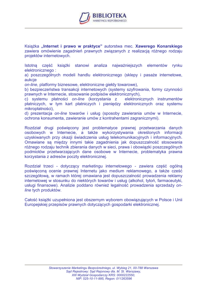 Książka „Internet i prawo w praktyce” autorstwa mec. Xawerego Konarskiego zawiera omówienie zagadnień prawnych związanych z realizacją różnego rodzaju projektów internetowych. Istotną część książki stanowi analiza najważniejszych elementów rynku elektronicznego : a) poszczególnych modeli handlu elektronicznego (sklepy i pasaże internetowe, aukcje on-line, platformy biznesowe, elektroniczne giełdy towarowe), b) bezpieczeństwa transakcji internetowych (systemy szyfrowania, formy czynności prawnych w Internecie, stosowanie podpisów elektronicznych), c) systemu płatności on-line (korzystania z elektronicznych instrumentów płatniczych, w tym kart płatniczych i pieniędzy elektronicznych oraz systemu mikropłatności), d) prezentacja on-line towarów i usług (sposoby zawierania umów w Internecie, ochrona konsumenta, zawieranie umów z kontrahentami zagranicznymi). Rozdział drugi poświęcony jest problematyce prawnej przetwarzania danych osobowych w Internecie, a także wykorzystywania określonych informacji uzyskiwanych przy okazji świadczenia usług telekomunikacyjnych i informacyjnych. Omawiane są między innymi takie zagadnienia jak dopuszczalność stosowania różnego rodzaju technik zbierania danych w sieci, prawa i obowiązki poszczególnych podmiotów przetwarzających dane osobowe w Internecie, problematyka prawna korzystania z adresów poczty elektronicznej. Rozdział trzeci - dotyczący marketingu internetowego - zawiera część ogólną poświęconą ocenie prawnej Internetu jako medium reklamowego, a także cześć szczegółową, w ramach której omawiana jest dopuszczalność prowadzenia reklamy internetowej w stosunku do niektórych towarów i usług (alkohol, tytoń, farmaceutyki, usługi finansowe). Analizie poddano również legalność prowadzenia sprzedaży online tych produktów. Całość książki uzupełniona jest obszernym wyborem obowiązujących w Polsce i Unii Europejskiej przepisów prawnych dotyczących gospodarki elektronicznej. Stowarzyszenie Marketingu Bezpośredniego, ul. Wybieg 21, 00-788 Warszawa Sąd Rejestrowy: Sąd Rejonowy dla. M. St. Warszawy, XIII Wydział Gospodarczy KRS: 0000222550, NIP: 525-10-11-995, Regon: 011263596