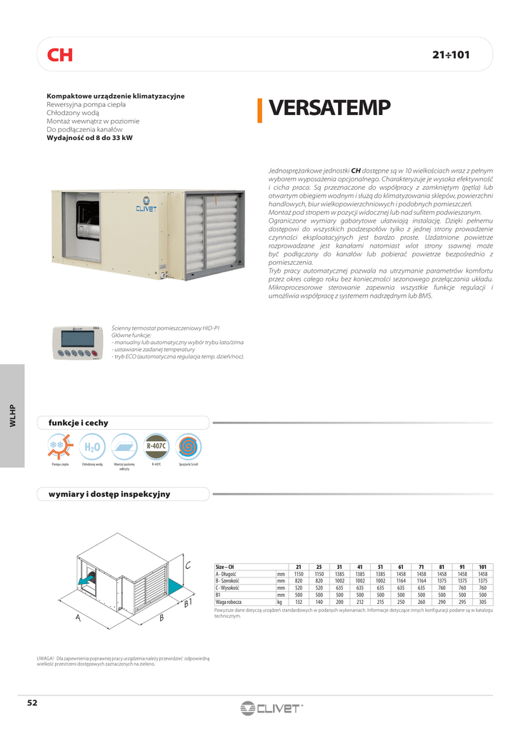CH 21÷101 Kompaktowe urządzenie klimatyzacyjne Rewersyjna pompa ciepła Chłodzony wodą Montaż wewnątrz w poziomie Do podłączenia kanałów Wydajność od 8 do 33 kW VERSATEMP Jednosprężarkowe jednostki CH dostępne są w 10 wielkościach wraz z pełnym wyborem wyposażenia opcjonalnego. Charakteryzuje je wysoka efektywność i cicha praca. Są przeznaczone do współpracy z zamkniętym (pętla) lub otwartym obiegiem wodnym i służą do klimatyzowania sklepów, powierzchni handlowych, biur wielkopowierzchniowych i podobnych pomieszczeń. Montaż pod stropem w pozycji widocznej lub nad sufitem podwieszanym. Ograniczone wymiary gabarytowe ułatwiają instalację. Dzięki pełnemu dostępowi do wszystkich podzespołów tylko z jednej strony prowadzenie czynności eksploatacyjnych jest bardzo proste. Uzdatnione powietrze rozprowadzane jest kanałami natomiast wlot strony ssawnej może być podłączony do kanałów lub pobierać powietrze bezpośrednio z pomieszczenia. Tryb pracy automatycznej pozwala na utrzymanie parametrów komfortu przez okres całego roku bez konieczności sezonowego przełączania układu. Mikroprocesorowe sterowanie zapewnia wszystkie funkcje regulacji i umożliwia współpracę z systemem nadrzędnym lub BMS. WLHP Ścienny termostat pomieszczeniowy HID-P1 Główne funkcje: - manualny lub automatyczny wybór trybu lato/zima - ustawianie zadanej temperatury - tryb ECO (automatyczna regulacja temp. dzień/noc). funkcje i cechy H2O Pompa ciepła Chłodzony wodą R-407C Montaż poziomy odkryty R-407C Sprężarki Scroll wymiary i dostęp inspekcyjny C A B1 B UWAGA! Dla zapewnienia poprawnej pracy urządzenia należy przewidzieć odpowiedną wielkość przestrzeni dostępowych zaznaczonych na zielono. 52 Size – CH A - Długość B - Szerokość C - Wysokość B1 Waga robocza mm mm mm mm kg 21 1150 820 520 500 132 25 1150 820 520 500 140 31 1385 1002 635 500 200 41 1385 1002 635 500 212 51 1385 1002 635 500 215 61 1458 1164 635 500 250 71 1458 1164 635 500 260 81 1458 1375 760 500 290 91 1458 1375 760 500 295 101 1458 1375 760 500 305 Powyższe dane dotyczą urządzeń standardowych w podanych wykonaniach. Informacje dotyczące innych konfiguracji podane są w katalogu technicznym. wersje i konfiguracje G ZASTOSOWANIE: Pompa ciepła w pętli wodnej (Standard) PW W otwartej wodnej instalacji przelewowej W Woda geotermalna dane techniczne Wielkość – CH Moc chłodnicza Moc jawna Pobór mocy sprężarki Moc grzewcza Pobór mocy sprężarki Ilość obiegów chłodniczych Ilość sprężarek Typ sprężarek Przepływ powietrza nawiewanego Typ wentylatora nawiewnego Ilość wentylatorów nawiewnych Maks. spręż dyspozycyjny (nawiew) Przepływ wody (Strona źródła) Standardowe napięcie zasilania Poziom ciśnienia akustycznego (1) (1) (1) (2) (3) (4) kW kW kW kW kW Nr Nr l/s Nr Pa l/s V dB(A) 21 8,10 6,10 1,70 9,20 1,70 1 1 Scroll 486 CFG 1 150 0,40 400/3/50 55 Uwagi (1) Temp. wewnętrzna 27°C/19.5 TM; Temperatura wod w wymienniku 29°C/35°C (2) Temp. wewnętrzna 20°C; Wyjściowa temperatura wody z wymiennika 10°C (3) CFG = wentylator promieniowy 25 9,60 6,60 2,00 10,7 2,10 1 1 Scroll 583 CFG 1 150 0,50 400/3/50 57 31 11,3 7,60 2,40 13,2 2,40 1 1 Scroll 694 CFG 1 150 0,60 400/3/50 55 41 14,2 9,40 3,00 16,0 2,90 1 1 Scroll 847 CFG 1 150 0,70 400/3/50 58 51 17,0 11,0 4,10 19,2 3,70 1 1 Scroll 1028 CFG 1 150 0,80 400/3/50 61 61 20,4 13,2 4,30 23,2 4,50 1 1 Scroll 1236 CFG 1 150 1,00 400/3/50 57 71 22,4 14,3 4,70 25,8 5,10 1 1 Scroll 1389 CFG 1 150 1,10 400/3/50 59 81 26,4 16,9 5,80 30,6 6,00 1 1 Scroll 1556 CFG 1 150 1,30 400/3/50 56 91 28,8 18,5 6,60 33,7 6,80 1 1 Scroll 1722 CFG 1 150 1,40 400/3/50 58 101 32,7 20,4 7,10 38,9 8,10 1 1 Scroll 1944 CFG 1 150 1,60 400/3/50 59 (4) Dane akustyczne dla pracy z pełnym obciążeniem w warunkach nominalnych. Poziom ciśnienia akustycznego w odległości 1 m od zewnętrznej powierzchni urządzenia pracującego w swobodnym polu dźwiękowym. wyposażenie opcjonalne Wentylatory z silnikami o podwyższonej mocy Presostat zabrudzenia filtra IVW Zawór wodny z siłownikiem IVMW Zawór wodny z siłownikiem z płynną regulacją VHPRE Konfiguracja dla zaworu z siłownikiem IHMA Manualny zawór odcinający ■• BPH2OX Zawór odcinający na obejściu (strona wody) IFW Stalowy siatkowy filtr wody PSAF PTAI SP1 CLSE ACIE PBLC1X PBLC2X ■• PRMX ■• ■• Czujnik temperatury powietrza powrotnego Port szeregowy RS485 Styki bezpotencjałowe do sygnalizacji alarmu Grzałka przeciwzamrożeniowa wymiennika wodnego Klawiatura serwisowa (przewód o długości 1,5 m) Lokalna przenośna klawiatura z przewodem o długości 20 m Skrzynka rozprężna powietrza WLHP MMFM Oznaczenia symboli i uwagi: ■• Wyposażenie dostarczane oddzielnie. 53