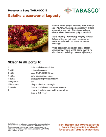Przepisy z Sosy TABASCO ® Sałatka z czerwonej kapusty W dużej misce połącz szalotkę, ocet, zielony sos TABASCO®, sok pomarańczowy, skórkę pomarańczową i sól. Stopniowo dodawaj oliwę z oliwek i dokładnie połącz składniki. Dodaj kapustę i wymieszaj. Przykryj i wstaw do lodówki na co najmniej 1 godzinę, by smaki się połączyły, od czasu do czasu mieszając. Przed podaniem, do sałatki dodaj cząstki pomarańczy. Talerz wyłóż liśćmi cykorii, na wierzchu ułóż sałatkę z czerwonej kapusty. Składniki dla porcji 6: 1 3 łyżki 3 łyżki 1 łyżka 1 łyżka 1/4 łyżeczki 1/3 szklanki 1 główka 2 duża posiekana szalotka octu malinowego sosu TABASCO® Green soku pomarańczowego startej skórki pomarańczowej soli oliwy z oliwek extra virgin drobno posiekanej czerwonej kapusty obrane i pocięte na cząstki pomarańcze liście z 1-2 cykorii TABASCO® is a registered trademark for sauces and other goods and services; TABASCO®, the TABASCO® bottle design and label designs are the exclusive property of McIlhenny Company, Avery Island, Louisiana, USA 70513. www.TABASCO.com Mehr Rezepte auf www.tabasco.de News, Gewinnspiele und mehr: facebook.de/TabascoDeutschland