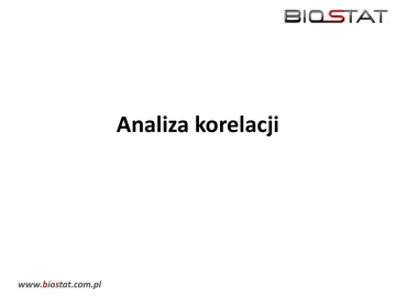 Analiza korelacji www.biostat.com.pl Zakres szkolenia • • • • • • Wstęp Podstawowe pojęcia korelacji Współczynnik korelacji liniowej Pearsona Współczynnik korelacji rang Spearmana Test istotności Zadania www.biostat.com.pl 2 Wstęp Do czego służy korelacja: „rak płuc powiązany jest z paleniem papierosów” „zawał serca powiązany jest z otyłości” „spłacenie kredytu uzależnione jest od wysokości zarobków” Im więcej jednego tym więcej drugiego Badanie stopnia i kierunku zależności różnych zjawisk www.biostat.com.pl 3 Rodzaje korelacji • • • • Korelacja liniowa dodatnia (rys 1.) Korelacja liniowa ujemna (rys 2.) Brak korelacji (rys 3.) Korelacja krzywoliniowa (rys 4.) • Zależność liniowa (rys 1 i 2.) • Zależność krzywoliniowa (rys 4.) www.biostat.com.pl 4 Korelacja liniowa dodatnia www.biostat.com.pl 5 Korelacja liniowa ujemna www.biostat.com.pl 6 Brak korelacji www.biostat.com.pl 7 Korelacja krzywoliniowa www.biostat.com.pl 8 Współczynnik korelacji liniowej Pearsona rxy = cov( x, y ) S ( x) S ( y ) Współczynnik korelacji jest liczbą, która wskazuje w jakim stopniu dwa zjawiska są ze sobą powiązane i z jaką siłą jedno zjawisko wywołuje zmianę drugiego. Współczynnik korelacji Pearsona służy do ustalenia zależności (związku) między dwoma cechami mierzalnymi (ilościowymi). Innymi słowy współczynnik korelacji liniowej Pearsona, jest miernikiem siły związku między dwiema zmiennymi, cechami ilościowymi. • • • Współczynnik ten przyjmuje wartości z przedziału [-1,1]. Jest miernikiem siły związku prostoliniowego między dwiema cechami mierzalnymi. Znak współczynnika korelacji informuje o kierunku korelacji natomiast jego bezwzględna wartość o sile związku www.biostat.com.pl 9 Siła korelacji |rxy|= 0 0 < |rxy| < 0,1 0,1 ≤ |rxy| < 0,3 0,3 ≤ |rxy| < 0,5 0,5 ≤ |rxy| < 0,7 0,7 ≤ |rxy| < 0,9 0,9 ≤ |rxy|<1 brak korelacji korelacja niska korelacja słaba korelacja przeciętna korelacja wysoka korelacja bardzo wysoka korelacja prawie pełna Interpretując współczynnik korelacji należy pamiętać o: • • • istotności korelacji. wartość współczynnika bliska 0 nie zawsze oznacza brak zależności, a jedynie brak zależności liniowej. wielkość współczynnika podlega wpływom wartości skrajnych i odstających. www.biostat.com.pl 10 Współczynnik korelacji rang Spearmana Alternatywnym miernikiem siły zależności jest współczynnik korelacji rang Spearmana (Spearman’s rho) Współczynnik ten należy stosować dla zmiennych mierzonych na skalach słabszych, a takimi skalami są odpowiedzi na pytania np. stenowe. n rs = 1 − 6 × ∑ di 2 i =1 2 n(n − 1) Gdzie di są różnicami między kolejnymi numerami nadawanymi osobno dla każdej cechy. www.biostat.com.pl 11 Test istotności współczynnika W celu zbadania istotności obliczonego współczynnika należy przeprowadzić test istotności współczynnika korelacji. Hipotezą zerową jest hipoteza o braku zależności. Natomiast hipoteza alternatywna to hipoteza o istotności współczynnika korelacji. Zakłada się że poziom istotności (poziom p, p-value lub Sig.) mniejszy od 0,05 pozwala na twierdzenie iż zależność występuje. Często zakłada się również gorszy poziom istotności a mianowicie poziom 0,1. Alternatywną metodą określania siły związku na podstawie obliczonego współczynnika korelacji jest skorzystanie z gotowych przedziałów. www.biostat.com.pl 12 Zadania Zadanie 1. Korzystając z danych w arkuszu wyznacz współczynnik korelacji liniowej Pearsona pomiędzy wiekiem a osiąganymi dochodami. Wyznacz wartość współczynnika determinacji. Uwagi: wyznacz współczynnik za pomocą dodatku Analiza Danych a następnie za pomocą funkcji statystycznych Zadanie 2. Korzystając z danych w arkuszu CRF wyznacz współczynnik korelacji liniowej Pearsona pomiędzy: • wiekiem a wynikami pomiarów Hb na każdej wizycie • wiekiem a Ferrytyną na każdej wizycie • stosowaną dawką leku a poziomem Hb • Stosowaną dawką leku a poprawą poziomu Hb Wyznacz wartość współczynników determinacji. Zadanie 3. Korzystając z danych w arkuszu wyznacz współczynnik korelacji liniowej Pearsona pomiędzy wiekiem wynikami Ca na wizycie 1 i na wizycie 2. www.biostat.com.pl 13