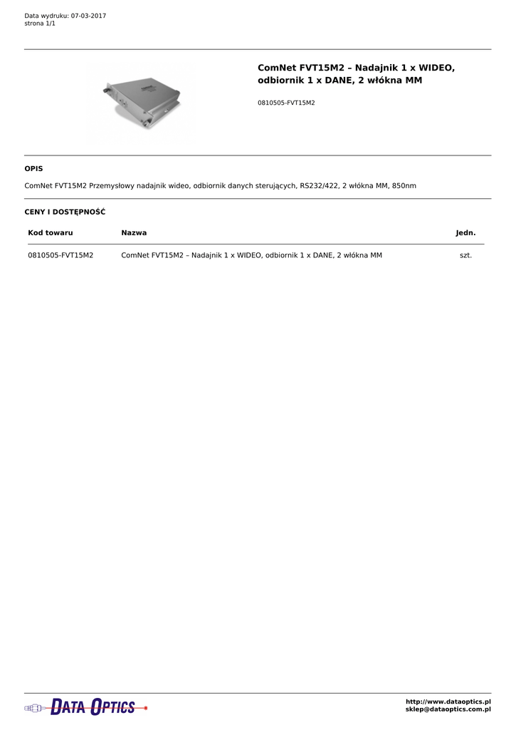 Data wydruku: 07-03-2017 strona 1/1 ComNet FVT15M2 – Nadajnik 1 x WIDEO, odbiornik 1 x DANE, 2 włókna MM 0810505-FVT15M2 OPIS ComNet FVT15M2 Przemysłowy nadajnik wideo, odbiornik danych sterujących, RS232/422, 2 włókna MM, 850nm CENY I DOSTĘPNOŚĆ Kod towaru Nazwa 0810505-FVT15M2 ComNet FVT15M2 – Nadajnik 1 x WIDEO, odbiornik 1 x DANE, 2 włókna MM Jedn. szt. http://www.dataoptics.pl [email protected] Powered by TCPDF (www.tcpdf.org)