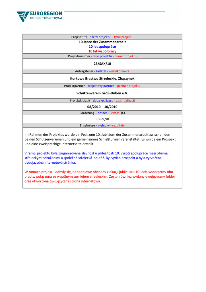 Projekttitel - název projektu - tytuł projektu 10 Jahre der Zusammenarbeit 10 let spolupráce 10 lat współpracy Projektnummer - číslo projektu - numer projektu 23/SAX/10 Antragsteller - žadatel - wnioskodawca Kurkowe Bractwo Strzeleckie, Zbąszynek Projektpartner - projektový partner – partner projektu Schützenverein Groß-Düben e.V. Projektlaufzeit - doba realizace - czas realizacji 08/2010 – 10/2010 Förderung - dotace - kwota (€) 5.959,98 Ergebnisse - výsledky - rezultaty Im Rahmen des Projektes wurde ein Fest zum 10. Jubiläum der Zusammenarbeit zwischen den beiden Schützenvereinen und ein gemeinsames Schießturnier veranstaltet. Es wurde ein Prospekt und eine zweisprachige Internetseite erstellt. V rámci projektu byla zorganizována slavnost u příležitosti 10. výročí spolupráce mezi oběma střeleckými sdruženími a společná střelecká soutěž. Byl vydán prospekt a byla vytvořena dvoujazyčná internetová stránka. W ramach projektu odbyły się jednodniowe obchody z okazji jubileuszu 10-lecia współpracy obu bractw połączona ze wspólnym turniejem strzeleckim. Został również wydany dwujęzyczny folder oraz utworzona dwujęzyczna strona internetowa.