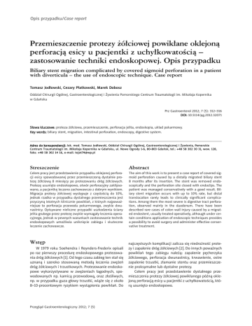 Opis przypadku/Case report Przemieszczenie protezy żółciowej powikłane oklejoną perforacją esicy u pacjentki z uchyłkowatością – zastosowanie techniki endoskopowej. Opis przypadku Biliary stent migration complicated by covered sigmoid perforation in a patient with diverticula – the use of endoscopic technique. Case report Tomasz Jodłowski, Cezary Płatkowski, Marek Dobosz Oddział Chirurgii Ogólnej, Gastroenterologicznej i Żywienia Pomorskiego Centrum Traumatologii im. Mikołaja Kopernika w Gdańsku Prz Gastroenterol 2012; 7 (5): 312–316 DOI: 10.5114/pg.2012.32071 Słowa kluczowe: proteza żółciowa, przemieszczenie, perforacja jelita, endoskopia, układ pokarmowy. Key words: biliary stent, migration, intestinal perforation, endoscopy, digestive system. A dres d o korespond enc ji : lek. med. Tomasz Jodłowski, Oddział Chirurgii Ogólnej, Gastroenterologicznej i Żywienia, Pomorskie Centrum Traumatologii im. Mikołaja Kopernika w Gdańsku, ul. Nowe Ogrody 1-6, 80-803 Gdańsk, tel.: +48 58 302 30 31, wew. 128, faks: +48 58 302 14 16, e-mail: [email protected] Streszczenie Abstract Celem pracy jest przedstawienie przypadku oklejonej perforacji esicy spowodowanej przez przemieszczoną dystalnie protezę żółciową 8 miesięcy po protezowaniu dróg żółciowych. Protezę usunięto endoskopowo, otwór perforacyjny zaklipsowano, a pacjentkę leczono zachowawczo z dobrym wynikiem. Migracja protezy żółciowej występuje z częstością do 10%, jednak rzadko w przypadku dystalnego przemieszczenia jest przyczyną istotnych klinicznie powikłań, z których najpoważniejsze to perforacja przewodu pokarmowego, zwykle dwunastnicy. Opisywane nieliczne przypadki uszkodzenia ściany jelita grubego przez protezę zwykle wymagały leczenia operacyjnego, jednak w pewnych warunkach zastosowanie technik endoskopowych umożliwia uniknięcie zabiegu i skuteczne leczenie zachowawcze. The aim of this work is to present a case report of covered sigmoid perforation caused by a distally migrated biliary stent 8 months after its insertion. The stent was removed endoscopically and the perforation site closed with endoclips. The patient was managed conservatively with a good result. Biliary stent migration occurs with up to 10% rate, but distal translocation rarely leads to clinically significant complications. Among them the most severe is digestive tract perforation, observed mainly in the duodenum. There have been described rare cases of colon wall injury caused by a migrated endostent, usually treated operatively, although under certain conditions application of endoscopic techniques provides a possibility to avoid surgery and administer effective conservative treatment. Wstęp W 1979 roku Soehendra i Reynders-Frederix opisali po raz pierwszy procedurę endoskopowego protezowania dróg żółciowych [1]. Od tego czasu zabieg ten stał się uznaną i szeroko stosowaną metodą leczenia zwężeń dróg żółciowych i trzustkowych. Protezowanie endoskopowe wykorzystywane w zwężeniach łagodnych, spowodowanych np. kamicą przewodową, oraz złośliwych, np. w przypadku guza głowy trzustki, wiąże się z około 8–10-procentowym ryzykiem wystąpienia powikłań. Do Przegląd Gastroenterologiczny 2012; 7 (5) najczęstszych komplikacji zalicza się niedrożność protezy i zapalenie dróg żółciowych [2]. Do innych poważnych powikłań tego zabiegu należą: zapalenie pęcherzyka żółciowego, perforacja dwunastnicy, krwawienie, ostre zapalenie trzustki, złamanie stentu oraz przemieszczenie proksymalne lub dystalne protezy. Celem pracy jest przedstawienie dystalnego przemieszczenia protezy żółciowej powikłanego późną oklejoną perforacją esicy u pacjentki z uchyłkowatością, którą usunięto endoskopowo. Przemieszczenie protezy żółciowej powikłane perforacją esicy – opis przypadku Opis przypadku Chora, lat 78, z powodu dolegliwości bólowych lewego podbrzusza i stanów podgorączkowych trwających od 2 dni została przyjęta do szpitala w trybie ostrodyżurowym. W wywiadzie odnotowano przebycie cholecystektomii z powodu kamicy żółciowej przed 6 laty, endoskopową cholangiopankreatografię wsteczną (ECPW) z protezowaniem przewodu żółciowego wspólnego (PŻW) z powodu kamicy przewodowej (złogów nie udało się usunąć endoskopowo) przed 8 miesiącami oraz rewizję dróg żółciowych z ewakuacją złogu i zespoleniem przewodowo-jelitowym sposobem Roux. Pacjentka nie zgłosiła się na proponowany po protezowaniu PŻW elektywny zabieg. Operację wykonano w trybie przyspieszonym z powodu nawrotu żółtaczki 4 miesiące przed obecnym przyjęciem. Wówczas w przedoperacyjnej ultrasonografii jamy brzusznej nie uwidoczniono protezy w drogach żółciowych, nie odnaleziono jej również śródoperacyjnie. Ponadto u pacjentki odnotowano cukrzycę typu 2, nadciśnienie, torbiele nerek i łuszczycę. W badaniu przedmiotowym stwierdzono wyczuwalny tkliwy opór w lewym dolnym kwadrancie jamy brzusznej, bez obecności objawów otrzewnowych, natomiast w badaniach laboratoryjnych podwyższone parametry stanu zapalnego [stężenie białka C-reaktywnego (C-reactive protein – CRP) 358 mg/l, leukocytoza 13,5 G/l]. W ultrasonografii jamy brzusznej poza torbielami nerek uwidoczniono w lewym dole biodrowym pogrubiałą na odcinku 8–10 cm ścianę jelita z przylegającym zbiornikiem płynu o średnicy do 34 mm z obecnością pęcherzyków gazu i cechami nacieku tkanki tłuszczowej, natomiast w radiogramie przeglądowym jamy brzusznej nie wykazano istotnej patologii. Ustalono wstępne rozpoznanie zapalenia uchyłków okrężnicy i włączono leczenie zachowawcze, w tym antybiotykoterapię. W 2. dobie hospitalizacji pacjentce wykonano tomografię komputerową (TK) jamy brzusznej, w której opisano obecność ciała obcego (protezy) w dystalnej części zstępnicy, z podejrzeniem oklejonej perforacji, oraz uchyłki odcinka esiczo-zstępniczego (ryc. 1.). W kolejnej dobie pacjentk