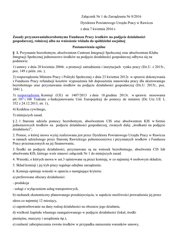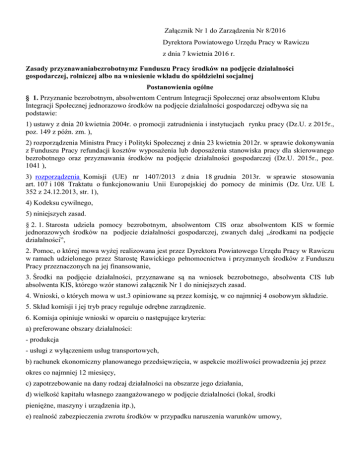 Załącznik Nr 1 do Zarządzenia Nr 8/2016 Dyrektora Powiatowego Urzędu Pracy w Rawiczu z dnia 7 kwietnia 2016 r. Zasady przyznawaniabezrobotnymz Funduszu Pracy środków na podjęcie działalności gospodarczej, rolniczej albo na wniesienie wkładu do spółdzielni socjalnej Postanowienia ogólne § 1. Przyznanie bezrobotnym, absolwentom Centrum Integracji Społecznej oraz absolwentom Klubu Integracji Społecznej jednorazowo środków na podjęcie działalności gospodarczej odbywa się na podstawie: 1) ustawy z dnia 20 kwietnia 2004r. o promocji zatrudnienia i instytucjach rynku pracy (Dz.U. z 2015r., poz. 149 z późn. zm. ), 2) rozporządzenia Ministra Pracy i Polityki Społecznej z dnia 23 kwietnia 2012r. w sprawie dokonywania z Funduszu Pracy refundacji kosztów wyposażenia lub doposażenia stanowiska pracy dla skierowanego bezrobotnego oraz przyznawania środków na podjęcie działalności gospodarczej (Dz.U. 2015r., poz. 1041 ), 3) rozporządzenia Komisji (UE) nr 1407/2013 z dnia 18 grudnia 2013r. w sprawie stosowania art. 107 i 108 Traktatu o funkcjonowaniu Unii Europejskiej do pomocy de minimis (Dz. Urz. UE L 352 z 24.12.2013, str. 1), 4) Kodeksu cywilnego, 5) niniejszych zasad. § 2. 1. Starosta udziela pomocy bezrobotnym, absolwentom CIS oraz absolwentom KIS w formie jednorazowych środków na podjecie działalności gospodarczej, zwanych dalej „środkami na podjęcie działalności”, 2. Pomoc, o której mowa wyżej realizowana jest przez Dyrektora Powiatowego Urzędu Pracy w Rawiczu w ramach udzielonego przez Starostę Rawickiego pełnomocnictwa i przyznanych środków z Funduszu Pracy przeznaczonych na jej finansowanie, 3. Środki na podjęcie działalności, przyznawane są na wniosek bezrobotnego, absolwenta CIS lub absolwenta KIS, którego wzór stanowi załącznik Nr 1 do niniejszych zasad. 4. Wnioski, o których mowa w ust.3 opiniowane są przez komisję, w co najmniej 4 osobowym składzie. 5. Skład komisji i jej tryb pracy reguluje odrębne zarządzenie. 6. Komisja opiniuje wnioski w oparciu o następujące kryteria: a) preferowane obszary działalności: - produkcja - usługi z wyłączeniem usług transportowych, b) rachunek ekonomiczny planowanego przedsięwzięcia, w aspekcie możliwości prowadzenia jej przez okres co najmniej 12 miesięcy, c) zapotrzebowanie na dany rodzaj działalności na obszarze jego działania, d) wielkość kapitału własnego zaangażowanego w podjęcie działalności (lokal, środki pieniężne, maszyny i urządzenia itp.), e) realność zabezpieczenia zwrotu środków w przypadku naruszenia warunków umowy, f) sytuacja bezrobotnego na rynku pracy. § 3. 1. Wnioski rozpatrywane są według kolejności ich składania albo w trybie konkursowym. 2. O przyznaniu lub odmowie przyznania pomocy Dyrektor Powiatowego Urzędu Pracy w Rawiczu powiadamia wnioskodawcę w formie pisemnej, w okresie nie przekraczającym 30 dni od daty złożenia wniosku i innych niezbędnych do jego rozpatrzenia dokumentów. 3. Wysokość przyznanych bezrobotnemu środków na podjęcie działalności nie może przekraczać 6krotnego przeciętnego wynagrodzenia. W przypadku, gdy działalności jest podejmowana na zasadach określonych dla spółdzielni socjalnych w rozumieniu przepisów prawa spółdzielczego, wysokość przyznanych bezrobotnemu środków nie może przekraczać 4-krotnego przeciętnego wynagrodzenia na jednego członka założyciela spółdzielni oraz 3-krotnego przeciętnego wynagrodzenia na jednego członka przystępującego do niej po założeniu spółdzielni. 4. Pod pojęciem „przeciętne wynagrodzenie” rozumie się przeciętne miesięczne wynagrodzenie w poprzednim kwartale, od pierwszego dnia następnego miesiąca po ogłoszeniu przez Prezesa Głównego Urzędu statystycznego w Dzienniku Urzędowym Rzeczypospolitej Polskiej „Monitor Polski”, na podstawie art.20 pkt 2 ustawy z dnia 17.12.1998r. o emeryturach i rentach z Funduszu Ubezpieczeń Społecznych (Dz.U. 2015r., poz.748). Wysokość przeciętnego wynagrodzenia, o którym mowa w ustępie 3 jest przyjmowana na dzień zawarcia umowy. 5. Umowy o udzielenie pomocy, o której mowa w § 2 ust. 1 niniejszych Zasad, zawierane są w formie pisemnej pod rygorem nieważności. Zmiana warunków umowy wymaga również formy pisemnej pod rygorem nieważności i może mieć miejsce na wniosek każdej ze stron. 6. Dyrektor Powiatowego Urzędu Pracy w Rawiczu może dokonać kontroli wstępnej w miejscu, w którym ma być prowadzona działalność gospodarcza, przed przyznaniem środków na jej podjęcie przez bezrobotnego oraz kontroli w zakresie wykorzystania tych środków zgodnie z celem określonym w umowie. 7. Przekazanie środków na podjęcie działalności następuje na konto bankowe bezrobotnego w dniu podpisania umowy lub w innym dniu wskazanym przez strony w umowie. 8. Przyznane bezrobotnemu, absolwentowi CIS lub absolwentowi KIS środki z Funduszu Pracy, o których mowa w § 2 ust. 1 niniejszych zasad stanowią pomoc de minimis w rozumieniu rozporządzenia Komisji (UE) nr 1407/2013 z dnia 18 grudnia 2013r. w sprawie stosowania art. 107 i 108 Traktatu o funkcjonowaniu Unii Europejskiej do pomocy de minimis (Dz. Urz. UE L 352 z 24.12.2013., str. 1) i są udzielane zgodnie z przepisami tego rozporządzenia, z wyłączeniem środków przyznawanych w zakresie krajowego transportu osób taksówkami. Warunki przyznawania bezrobotnym, absolwentom CIS lub absolwentom KIS jednorazowo środków na podjęcie działalności gospodarczej § 4. 1. Ubiegający się o uzyskanie środków na podjęcie działalności składa w Powiatowym Urzędzie Pracy w Rawiczu wniosek określający: 1) imię i nazwisko bezrobotnego, absolwenta CIS lub absolwenta KIS, 2) adres miejsca zamieszkania bezrobotnego, absolwenta CIS lub absolwenta KIS, 3) numer PESEL bezrobotnego, absolwenta CIS lub absolwenta KIS, 4) kwotę wnioskowanych środków, 5) rodzaj działalności gospodarczej, w rozumieniu przepisów o swobodz
