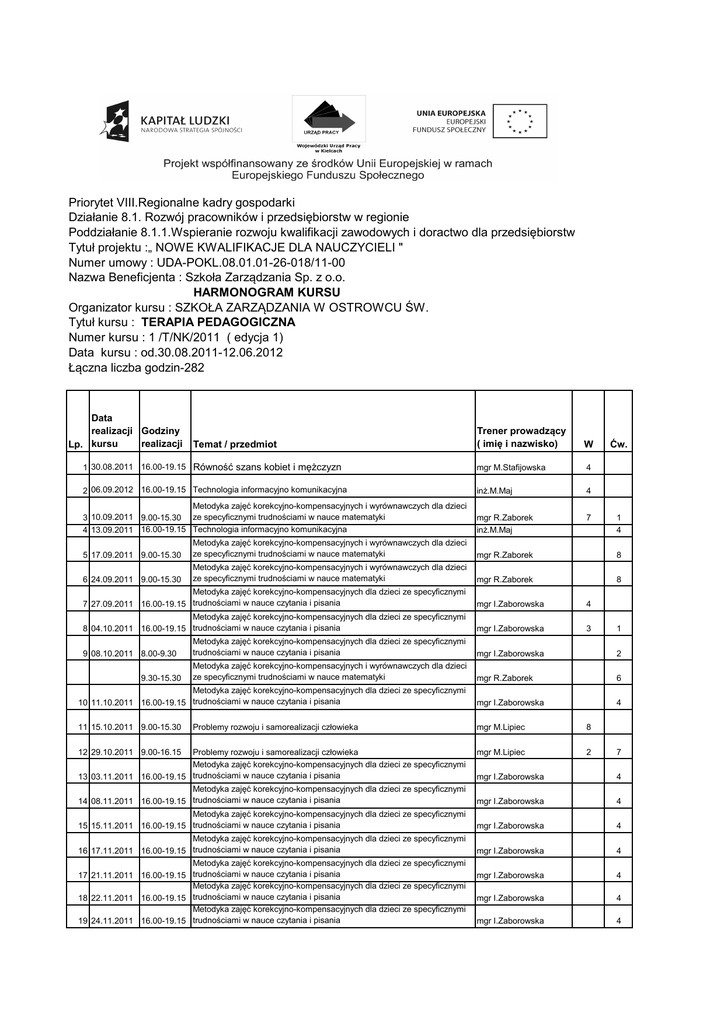 Priorytet VIII.Regionalne kadry gospodarki Działanie 8.1. Rozwój pracowników i przedsiębiorstw w regionie Poddziałanie 8.1.1.Wspieranie rozwoju kwalifikacji zawodowych i doractwo dla przedsiębiorstw Tytuł projektu :„ NOWE KWALIFIKACJE DLA NAUCZYCIELI " Numer umowy : UDA-POKL.08.01.01-26-018/11-00 Nazwa Beneficjenta : Szkoła Zarządzania Sp. z o.o. HARMONOGRAM KURSU Organizator kursu : SZKOŁA ZARZĄDZANIA W OSTROWCU ŚW. Tytuł kursu : TERAPIA PEDAGOGICZNA Numer kursu : 1 /T/NK/2011 ( edycja 1) Data kursu : od.30.08.2011-12.06.2012 Łączna liczba godzin-282 Data realizacji Godziny realizacji Lp. kursu Trener prowadzący ( imię i nazwisko) W 1 30.08.2011 16.00-19.15 Równość szans kobiet i mężczyzn mgr M.Stafijowska 4 2 06.09.2012 16.00-19.15 Technologia informacyjno komunikacyjna inż.M.Maj 4 mgr R.Zaborek inż.M.Maj 7 Temat / przedmiot Metodyka zajęć korekcyjno-kompensacyjnych i wyrównawczych dla dzieci 3 10.09.2011 9.00-15.30 ze specyficznymi trudnościami w nauce matematyki 4 13.09.2011 16.00-19.15 Technologia informacyjno komunikacyjna Metodyka zajęć korekcyjno-kompensacyjnych i wyrównawczych dla dzieci 5 17.09.2011 9.00-15.30 ze specyficznymi trudnościami w nauce matematyki 6 24.09.2011 9.00-15.30 Metodyka zajęć korekcyjno-kompensacyjnych i wyrównawczych dla dzieci ze specyficznymi trudnościami w nauce matematyki Metodyka zajęć korekcyjno-kompensacyjnych dla dzieci ze specyficznymi 7 27.09.2011 16.00-19.15 trudnościami w nauce czytania i pisania Metodyka zajęć korekcyjno-kompensacyjnych dla dzieci ze specyficznymi 8 04.10.2011 16.00-19.15 trudnościami w nauce czytania i pisania Metodyka zajęć korekcyjno-kompensacyjnych dla dzieci ze specyficznymi trudnościami w nauce czytania i pisania 9 08.10.2011 8.00-9.30 Metodyka zajęć korekcyjno-kompensacyjnych i wyrównawczych dla dzieci 9.30-15.30 ze specyficznymi trudnościami w nauce matematyki Metodyka zajęć korekcyjno-kompensacyjnych dla dzieci ze specyficznymi 10 11.10.2011 16.00-19.15 trudnościami w nauce czytania i pisania 11 15.10.2011 9.00-15.30 Problemy rozwoju i samorealizacji człowieka 12 29.10.2011 9.00-16.15 Problemy rozwoju i samorealizacji człowieka Metodyka zajęć korekcyjno-kompensacyjnych dla dzieci ze specyficznymi 13 03.11.2011 16.00-19.15 trudnościami w nauce czytania i pisania Metodyka zajęć korekcyjno-kompensacyjnych dla dzieci ze specyficznymi 14 08.11.2011 16.00-19.15 trudnościami w nauce czytania i pisania Metodyka zajęć korekcyjno-kompensacyjnych dla dzieci ze specyficznymi 15 15.11.2011 16.00-19.15 trudnościami w nauce czytania i pisania 16 17.11.2011 17 21.11.2011 18 22.11.2011 19 24.11.2011 Metodyka zajęć korekcyjno-kompensacyjnych dla dzieci ze specyficznymi 16.00-19.15 trudnościami w nauce czytania i pisania Metodyka zajęć korekcyjno-kompensacyjnych dla dzieci ze specyficznymi 16.00-19.15 trudnościami w nauce czytania i pisania Metodyka zajęć korekcyjno-kompensacyjnych dla dzieci ze specyficznymi 16.00-19.15 trudnościami w nauce czytania i pisania Metodyka zajęć korekcyjno-kompensacyjnych dla dzieci ze specyficznymi 16.00-19.15 trudnościami w nauce czytania i pisania Ćw. 1 4 mgr R.Zaborek 8 mgr R.Zaborek 8 mgr I.Zaborowska 4 mgr I.Zaborowska 3 1 mgr I.Zaborowska 2 mgr R.Zaborek 6 mgr I.Zaborowska 4 mgr M.Lipiec 8 mgr M.Lipiec 2 7 mgr I.Zaborowska 4 mgr I.Zaborowska 4 mgr I.Zaborowska 4 mgr I.Zaborowska 4 mgr I.Zaborowska 4 mgr I.Zaborowska 4 mgr I.Zaborowska 4 Metodyka zajęć korekcyjno-kompensacyjnych dla dzieci ze specyficznymi 20 29.11.2011 16.00-19.15 trudnościami w nauce czytania i pisania mgr I.Zaborowska 4 21 01.12.2011 16.00-20.00 Problemy rozwoju i samorealizacji człowieka Metodyka zajęć korekcyjno-kompensacyjnych dla dzieci ze specyficznymi 22 06.12.2011 16.00-19.15 trudnościami w nauce czytania i pisania mgr M.Lipiec 5 mgr I.Zaborowska 4 23 08.12.2011 16.00-19.15 Problemy rozwoju i samorealizacji człowieka mgr M.Lipiec 4 24 13.12.2011 16.00-19.15 Problemy rozwoju i samorealizacji człowieka mgr M.Lipiec 4 25 15.01.2012 9.00-15.30 Wybrane zagadnienia z psychologii rozwojowej, wychowawczej i klinicznej mgr M.Lipiec 8 26 22.01.2012 9.00-15.30 Wybrane zagadnienia z psychologii rozwojowej, wychowawczej i klinicznej mgr M.Lipiec 8 27 29.01.2012 9.00-15.30 Wybrane zagadnienia z psychologii rozwojowej, wychowawczej i klinicznej mgr M.Lipiec 4 4 28 07.02.2012 16.00-19.15 Wybrane zagadnienia z psychologii rozwojowej, wychowawczej i klinicznej mgr M.Lipiec 4 29 09.02.2012 16.00-19.15 Wybrane zagadnienia z psychologii rozwojowej, wychowawczej i klinicznej mgr M.Lipiec 4 30 11.02.2012 9.00-15.30 Wybrane zagadnienia z psychologii rozwojowej, wychowawczej i klinicznej mgr M.Lipiec 8 31 18.02.2012 9.00-15.30 Wybrane zagadnienia z metodyki edukacji elementarnej 32 25.02.2012 9.00-14.45 Wybrane zagadnienia z metodyki edukacji elementarnej Metodyka zajęć terapeutycznych dla dzieci z zaburzeniami rozwoju 14.45-15.30 emocjonalnego i społecznego mgr D.Kapsa 8 mgr D.Kapsa 2 mgr D.Kapsa 1 4 33 26.02.2012 9.00-15.30 Metodyka zajęć terapeutycznych dla dzieci z zaburzeniami rozwoju emocjonalnego i społecznego mgr D.Kapsa 34 03.03.2012 9.00-11.15 Metodyka zajęć terapeutycznych dla dzieci z zaburzeniami rozwoju emocjonalnego i społecznego mgr D.Kapsa 11.15-15.30 Organizacja procesu terapeutycznego 5 4 3 mgr I.Zaborowska 5 5 35 04.03.2012 9.00-15.30 Organizacja procesu terapeutycznego mgr I.Zaborowska 36 18.03.2012 9.00-15.30 Organizacja procesu terapeutycznego mgr I.Zaborowska 8 37 31.03.2012 9.00-12.15 Organizacja procesu terapeutycznego mgr I.Zaborowska 4 Metodyka zajęć korekcyjno-kompensacyjnych i wyrównawczych dla dzieci 12.15-15.30 z zaburzeniami rozwoju ruchowego mgr I.Zaborowska 4 Metodyka zajęć korekcyjno-kompensacyjnych i wyrównawczych dla dzieci z zaburzeniami rozwoju ruchowego mgr I.Zaborowska 6 38 15.04.2012 9.00-15.30 39 21.04.2012 9.00-15.30 40 22.04.2012 9.00-15.30 Metodyka zajęć korekcyjno-kompensacyjnych i wyrównawczych dla
