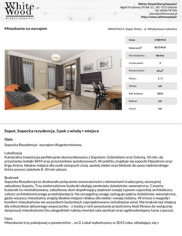 White Wood Nieruchomości Armii Krajowej 24 lok 11 , 81-372 Gdynia tel: 604678700 [email protected] http://www.whitewood.pl/ Mieszkanie na wynajem WH694651 Sopot Dolny , ul. Władysława Łokietka Cena: 3 500 PLN Cena za m2: 50,72 PLN Stan budynku: idealny Liczba pokoi: 3 Powierzchnia: 69 m2 Piętro: 1/3 Winda: tak Rok budowy: 2013 Balkon: tak Garaż: tak Sopot, Sopocka rezydencja, 3 pok z windą + miejsce Opis: Sopocka Rezydencja- wynajem długoterminowy. Lokalizacja Kameralna inwestycja perfekcyjnie skomunikowana z Sopotem, Gdańskiem oraz Gdynią. 10 min. do przystanku kolejki SKM oraz przystanków autobusowych. W pobliżu znajduje się sopocki Hipodrom oraz Ergo Arena. Idealne miejsce dla osób ceniących ciszę, spokój zieleń oraz bliskość do pasa nadmorskiego która wynosi zaledwie 8-10 min pieszo. Budynek Sopocka Rezydencja to doskonałe połączenie nowoczesności z elementami tradycyjnej, secesyjnej zabudowy Sopotu. Trzy wielorodzinne budynki okalają zamknięty dziedziniec wewnętrzny. Czwarty budynek to rewitalizowany, zabytkowy dom dopełniający pięknem swojej typowo sopockiej architektury, całości architektonicznego przedsięwzięcia. Na szczególną uwagę zasługuje piękny dziedziniec wewnętrzny, gdzie wszyscy mieszkańcy znajdą idealne miejsce relaksu dla siebie i swojej rodziny. W trosce o wygodę i komfort mieszkańców we wszystkich budynkach zaprojektowano cichobieżne wind. Nie braknie też miejsca dla miłośników aktywnego wypoczynku - z myślą o nich powstanie przestronny klub fitness do wyłącznej dyspozycji mieszkańców Do udogodnień należą również sala spotkań oraz ogólnodostępny taras z jacuzzi. Opis: Mieszkanie trzy pokojowej o powierzchni …m/2. Lokal wykończony w 2015 roku, składający się z White Wood Nieruchomości Armii Krajowej 24 lok 11 , 81-372 Gdynia tel: 604678700 [email protected] http://www.whitewood.pl/ obszernego salonu z wyjściem na słoneczny taras, z aneksu kuchennego, dwóch sypialni (wyjątkowo obszernych) oraz przestronne łazienki. Nieruchomość ciekawa pod względem rozkładu, okien które są wyjątkowo duże. Na podłodze parkiet dębowy idealnie współgrający z jasną kuchnią. Do lokalu przynależy miejsce postojowe w hali garażowej-oraz komórka dodatkowo płatne 250 PLN. Czynsz najmu (administracyjnego średnio wynosi xxxx PLN) Paweł Podbielski +48-604-678-700 Paweł Podbielski +48-604-678-700 White Wood Nieruchomości Paweł Podbielski Armii Krajowej 24 lok 11 , 81-372 Gdynia +48-604-678-700 [email protected] http://www.whitewood.pl/