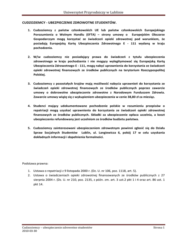 Uniwersytet Przyrodniczy w Lublinie CUDZOZIEMCY - UBEZPIECZENIE ZDROWOTNE STUDENTÓW. 1. Cudzoziemcy z państw członkowskich UE lub państw członkowskich Europejskiego Porozumienia o Wolnym Handlu (EFTA) – strony umowy o Europejskim Obszarze Gospodarczym mogą korzystać ze świadczeń opieki zdrowotnej pod warunkiem, że posiadają Europejską Kartę Ubezpieczenia Zdrowotnego E - 111 wydaną w kraju pochodzenia. 2. W/w cudzoziemcy nie posiadający prawa do świadczeń z tytułu ubezpieczenia zdrowotnego w kraju pochodzenia i nie mogący wylegitymować się Europejską Kartą Ubezpieczenia Zdrowotnego E - 111, mogą nabyć uprawnienia do korzystania ze świadczeń opieki zdrowotnej finansowych ze środków publicznych na terytorium Rzeczypospolitej Polskiej. 3. Cudzoziemcy z pozostałych krajów mają możliwość nabycia uprawnień do korzystania ze świadczeń opieki zdrowotnej finansowych ze środków publicznych poprzez zawarcie umowy o dobrowolne ubezpieczenie zdrowotne z Narodowym Funduszem Zdrowia. Zawarcie umowy wiążę się z wykupieniem ubezpieczenia w cenie 38,80 zł za miesiąc. 4. Studenci mający udokumentowane pochodzenie polskie w rozumieniu przepisów o repatriacji mogą uzyskać uprawnienia do korzystania ze świadczeń opieki zdrowotnej finansowych ze środków publicznych. Składki za ubezpieczenie opłaca uczelnia, a koszt ubezpieczenia refundowany jest uczelniom ze środków budżetu państwa. 5. Cudzoziemcy zainteresowani ubezpieczeniem zdrowotnym powinni zgłosić się do Działu Spraw Socjalnych Studentów Lublin, ul. Langiewicza 6, pokój 17 w celu uzyskania dokładnych informacji i dopełnienia formalności. Podstawa prawna: 1. Ustawa o repatriacji z 9 listopada 2000 r. (Dz. U. nr 106, poz. 1118, art. 5). 2. Ustawa o świadczeniach opieki zdrowotnej finansowanych ze środków publicznych z 27 sierpnia 2004 r. (Dz. U. nr 210, poz. 2135, z późn. zm. art. 3 ust.2 pkt 1 i 4 oraz art. 86 ust. 1 pkt 14. Cudzoziemcy – ubezpieczenie zdrowotne studentów 2010-03-30 Strona 1