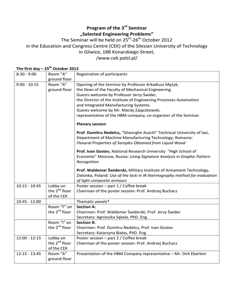 Program of the 3rd Seminar „Selected Engineering Problems” The Seminar will be held on 25th-26th October 2012 in the Education and Congress Centre (CEK) of the Silesian University of Technology in Gliwice, 18B Konarskiego Street, /www.cek.polsl.pl/ The first day – 25th October 2012 8:30 - 9:00 Room “A” Registration of participants ground floor 9:00 - 10:15 Room “A” Opening of the Seminar by Professor Arkadiusz Mężyk, ground floor the Dean of the Faculty of Mechanical Engineering. Guests welcome by Professor Jerzy Świder, the Director of the Institute of Engineering Processes Automation and Integrated Manufacturing Systems. Guests welcome by Mr. Maciej Zajączkowski, representative of the HBM company, co-organizer of the Seminar. Plenary session Prof. Dumitru Nedelcu, “Gheorghe Asachi” Technical University of Iasi, Department of Machine Manufacturing Technology, Romania: Flexural Properties of Samples Obtained from Liquid Wood Prof. Ivan Gostev, National Research University “High School of Economic” Moscow, Russia: Using Signature Analysis in Graphic Pattern Recognition Prof. Waldemar Świderski, Military Institute of Armament Technology, Zielonka, Poland: Use of the lock-in IR thermography method for evaluation of light composite armours Poster session – part 1 / Coffee break Chairman of the poster session: Prof. Andrzej Buchacz 10:15 - 10:45 Lobby on the 2nd floor of the CEK 10:45 - 12:00 Thematic panels* Room “F” on Section A: the 2nd floor Chairmen: Prof. Waldemar Świderski, Prof. Jerzy Świder Secretary: Agnieszka Sękala, PhD. Eng. Room “I” on Section B: the 2nd floor Chairmen: Prof. Dumitru Nedelcu, Prof. Ivan Gostev Secretary: Katarzyna Białas, PhD. Eng. Lobby on Poster session – part 2 / Coffee break nd the 2 floor Chairman of the poster session: Prof. Andrzej Buchacz of the CEK Room “A” Presentation of the HBM Company representative – Mr. Dirk Eberlein ground floor 12:00 - 12:15 12:15 - 13:45 13:45 - 14:30 14:30 - 15:00 15:10 Lobby on the 2nd floor of the CEK Room “J” on the 2nd floor Lunch break Presentation of virtual reality Social events: 1. Gliwice Radio Station http://www.radiostacjagliwicka.republika.pl/foldery/Gliwice_Radio_EN.pdf 2. Black Trout Adit in Tarnowskie Góry http://www.kopalniasrebra.pl/EN/sztolnia/sztolnia.php / It is necessary to inform the Organizing Committee during the registration about willingness to participate, the price is 25PLN / Approx. 19:00 Friendship meeting – Gliwice (for information contact with Organizing Committee) * individual visits in laboratories of the Institute for the HBM company guests during panels The second day – 26th October 2012 10:00 - 10:15 Room “I” on the The award ceremony 2nd floor Workshop conducted by Mr. Dirk Eberlein – representative of the HBM 10:15 - 11:45 Room “I” on the nd Company: 2 floor Fast data acquisition with Genesis Highspeed Part 1 nd 11:45 - 12:15 Lobby on the 2 Coffee break floor of the CEK 12:15 - 14:00 Room “I” on the Workshop conducted by Mr. Dirk Eberlein – representative of the HBM nd 2 floor Company: Fast data acquisition with Genesis Highspeed Part 2 Presented works Section A Chairmen: Secretary: Prof. Waldemar Świderski, Prof. Jerzy Świder Agnieszka Sękala, PhD. Eng. 1. Andrzej Katunin Institute of Fundamentals of Machinery Design, Faculty of Mechanical Engineering, Silesian University of Technology, Gliwice, Poland Reduction of boundary effect during structural damage identification using wavelet transform 2. Marcin Zemczak Institute of Engineering Process Automation and Integrated Manufacturing Systems, Silesian University of Technology, Gliwice, Poland Computer aided simulation of a multiassortment and multiversion production system 3. Łukasz Maliński, Institute of Automatic Control, Faculty of Automatic Control, Electronics and Computer Science, Silesian University of Technology, Gliwice, Poland On difficulties in identification of simple linear-bilinear time-series modules using memetic algorithm 4. Weronika Huss Institute of Machine Design and Operation, Department of Mechanical Engineering, Wrocław University of Technology, Wrocław, Poland A use of statistical tools for identification of bucket wheel excavators' transient vibrations during random loadings 5. Jan Matyga, Stanisław Kajzer, Magdalena Pająk GASKET Sp. z o.o. Bielsko Biała, Poland Intelligent wheel with a polyurethane tread PUGA® for extremely loaded mining suspended queue 6. Piotr Krauze Institute of Automatic Control, Faculty of Automatic Control, Electronics and Computer Science, Silesian University of Technology, Gliwice, Poland Adaptive tracking of road vehicle engine speed based on acceleration measurements Section B Chairmen: Secretary: Prof. Dumitru Nedelcu, Prof. Ivan Gostev Katarzyna Białas, PhD. Eng. 1. Iwona Paprocka Institute of Engineering Process Automation and Integrated Manufacturing Systems, Silesian University of Technology, Gliwice, Poland Comparison of estimation methods of reliability characteristics: MTTF and MTTR, numerical example 2. Arkadiusz Mężyk, Edyta Krzystała, Sławomir Kciuk Department of theoretical and applied mechanics, Silesian University of Technology, Gliwice, Poland Experimental mine blast tests of wheeled military vehicle 3. Krzysztof Jamroziak Gen. Tadeusz Kościuszko Military Academy of Land Forces, Wrocław, Poland The identification of degenerate systems described by equations of energy and power balance in the process of impact energy dissipation 4. Maja Baier, Rafał Bogucki, Andrzej Baier Institute of Engineering Process Automation and Integrated Manufacturing Systems, Silesian University of Technology, Gliwice, Poland Reverse engineering as a tool in process of gear reconstruction 5. Piotr Sakiewicz, Ryszard Nowosielski, Katarzyna Cesarz, Wirginia Pilarczyk Institute of Engineering Materials and Biomaterials, Silesian University of Technology, Gliwice, Poland: Planned obsolescence – today’s en