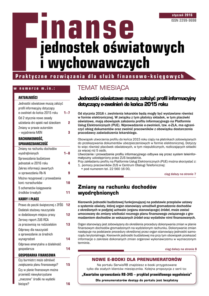 F inanse jednostek oświatowych styczeń 201612 ISSN 2299-9698 i wychowawczych Praktyczne rozwiązania dla służb finansowo-księgowych TEMAT MIESIĄCA w numerze m.in.: AKTUALNOŚCI Jednostki oświatowe muszą założyć profil informacyjny dotyczący e-zwolnień do końca 2015 roku 1–7 Od 2 stycznia nowe zasady udzielania dni opieki nad dzieckiem 2 Zmiany w prawie autorskim – wyjaśnienia MEN 3 RACHUNKOWOŚĆ, SPRAWOZDAWCZOŚĆ Zmiany na rachunku dochodów wyodrębnionych 1–8 Sprawozdania budżetowe jednostek w 2016 roku 4 Zakres informacji zawartych w sprawozdaniu Rb-N 9 Można rezygnować z prowadzenia kont rozrachunków 10 5 schematów księgowania środków trwałych 11 KADRY I PŁACE Prawo do paczki świątecznej z ZFŚS Dodatek stażowy nauczyciela w dodatkowym miejscu pracy Zerowy raport ZUS RCA za pracownicę na rodzicielskim Odprawy dla nauczycieli a sprawozdanie ze średnich wynagrodzeń Odprawa emerytalna a działalność gospodarcza 12 12 13 14 14 GOSPODARKA FINANSOWA Czy burmistrz może odmówić zwiększenia planu finansowego? Czy w planie finansowym można przenieść niewykorzystane „znaczone” środki na wydatki bieżące? Jednostki oświatowe muszą założyć profil informacyjny dotyczący e-zwolnień do końca 2015 roku Od stycznia 2016 r. zwolnienia lekarskie będą mogły być wystawiane również w formie elektronicznej. W związku z tym płatnicy składek, w tym placówki oświatowe, mają obowiązek założenia profilu informacyjnego na Platformie Usług Elektronicznych (PUE). Wprowadzenie e-zwolnień, tzw. e-ZLA, ma ograniczyć obieg dokumentów oraz zwolnić pracowników z obowiązku dostarczenia pracodawcy zaświadczenia lekarskiego. Obowiązek utworzenia profilu do końca 2015 roku ciąży na płatnikach zobowiązanych do przekazywania dokumentów ubezpieczeniowych w formie elektronicznej. Dotyczy to więc również placówek oświatowych, w tym niepublicznych, rozliczających składki za więcej niż 5 osób. Utworzenie i prowadzenie profilu informacyjnego odbywa się przez system teleinformatyczny udostępniony przez ZUS bezpłatnie. Przy zakładaniu profilu na Platformie Usług Elektronicznych (PUE) można skorzystać z: 1. pomocy pracowników ZUS w Centrum Obsługi Telefonicznej: •pod numerem tel. 22 560 16 00, ciąg dalszy na stronie 7 Zmiany na rachunku dochodów wyodrębnionych Kierownik jednostki budżetowej funkcjonującej na podstawie przepisów ustawy o systemie oświaty, której organ stanowiący umożliwił gromadzenie dochodów z określonych w podjętej uchwale (organu stanowiącego) źródeł, może zostać umocowany do zmiany wielkości rocznego planu finansowego związanego z gromadzeniem dochodów ze wskazanych źródeł oraz wydatków nimi finansowanych. Organ stanowiący jest zobowiązany do określenia procedury dokonywania zmian w planie finansowym dochodów gromadzonych na wydzielonym rachunku. Dokonywanie zmian następuje na podstawie procedury określonej przez organ stanowiący jednostki samorządu terytorialnego. Kierownik jednostki budżetowej ma przy tym obowiązek przekazać informacje o zakresie dokonanych zmian organowi wykonawczemu w wyznaczonym terminie. ciąg dalszy na stronie 8 NOWE E-BOOKI DLA PRENUMERATORÓW 15 Na portalu SerwisRB znajdziesz e-booki przygotowane tylko dla stałych klientów miesięcznika. Kolejna propozycja z serii to: „Kwartalne sprawozdania RB-34S – przykład prawidłowego wypełnienia” 16 Dla prenumeratorów dostęp do portalu jest bezpłatny Aktualności Od 2 stycznia nowe zasady udzielania dni opieki nad dzieckiem Od nowego roku pracownikowi wychowującemu przynajmniej jedno dziecko w wieku do 14 lat będzie przysługiwało w ciągu roku kalendarzowego zwolnienie od pracy w wymiarze 16 godzin albo 2 dni, z zachowaniem prawa do wynagrodzenia. O sposobie wykorzystania w danym roku kalendarzowym zwolnienia decydować będzie pracownik w pierwszym wniosku o udzielenie takiego zwolnienia złożonym w danym roku kalendarzowym. Zwolnienie od pracy udzielane w wymiarze godzinowym pracownikowi zatrudnionemu w niepełnym wymiarze czasu pracy będzie ustalane proporcjonalnie do wymiaru czasu pracy tego pracownika. Niepełną godzinę zwolnienia od pracy zaokrągla się przy tym w górę do pełnej godziny (art. 1 pkt 22 ustawy z 24 lipca 2015 r. o zmianie ustawy Kodeks pracy oraz o zmianie niektórych innych ustaw). Uprawnienie to zarówno obecnie, jak i po zmianach dotyczyć będzie również nauczycieli. Nauczyciel może wnioskować o zwolnienie tylko w godzinach, w których prowadzi zajęcia Ustawodawca, nie wprowadzając odmiennych zasad udzielania przedmiotowego zwolnienia nauczycielom, przyznał tej grupie uprzywilejowaną pozycję. Wybierając zwolnienie godzinowe, nauczyciel zyska bowiem więcej czasu wolnego, gdyż rozliczeniu podlegają jedynie godziny zajęć dydaktycznych, wychowawczych lub opiekuńczych realizowanych bezpośrednio z uczniami lub wychowankami oraz dodatkowe godziny (tzw. godziny karciane) (art. 42 ust. 7 i 7a Karty Nauczyciela). Jeżeli zatem nauczyciel złoży wniosek o udzielenie zwolnienia od pracy w wymiarze godzinowym, wskazując jedynie na godziny pensum, które ma do zrealizowania danego dnia, to dyrektor szkoły zobowiązany będzie ten wniosek uwzględnić. Godziny opieki będą przy tym rozliczane w godzinach zegarowych, a nie według czasu trwania zajęć dydaktycznych. Jeśli nauczyciel zatrudniony w pełnym wymiarze prowadzi zajęcia z uczniami i na ich rzecz (pensum i godziny karciane) wg grafiku: w poniedziałek: 3 godziny; wtorek: 3 godziny, środa: 6 godzin, czwartek: 4 godzin, piątek: 4 godziny, to od 2 stycznia 2016 r., jeśli wybierze godzinowy sposób wykorzystywania dni opieki nad dzieckiem, będzie mógł zwolnić się z prowadzenia zajęć np. 4 razy w piątek 4 4 godziny = 16 godzin). PODSTAWA PRAWNA: Ustawa z 24 lipca 2015 r. o zmianie ustawy Kodeks pracy oraz o zmianie niektórych innych ustaw (Dz.U. 2015 r. poz. 1268) – art. 1 pkt 2