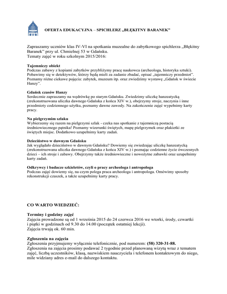 OFERTA EDUKACYJNA – SPICHLERZ „BŁĘKITNY BARANEK” Zapraszamy uczniów klas IV-VI na spotkania muzealne do zabytkowego spichlerza „Błękitny Baranek” przy ul. Chmielnej 53 w Gdańsku. Tematy zajęć w roku szkolnym 2015/2016: Tajemniczy obiekt Podczas zabawy z kopiami zabytków przybliżymy pracę naukowca (archeologa, historyka sztuki). Pobawimy się w detektywów, którzy będą mieli za zadanie zbadać, opisać „tajemniczy przedmiot”. Poznamy różne ciekawe pojęcia: zabytek, muzeum itp. oraz zwiedzimy wystawę „Gdańsk w świecie Hanzy”. Gdańsk czasów Hanzy Serdecznie zapraszamy na wędrówkę po starym Gdańsku. Zwiedzimy uliczkę hanzeatycką (zrekonstruowana uliczka dawnego Gdańska z końca XIV w.), obejrzymy stroje, naczynia i inne przedmioty codziennego użytku, poznamy dawne zawody. Na zakończenie zajęć wypełnimy karty pracy. Na pielgrzymim szlaku Wybierzemy się razem na pielgrzymi szlak - czeka nas spotkanie z tajemniczą postacią średniowiecznego pątnika! Poznamy wizerunki świętych, mapę pielgrzymek oraz plakietki ze świętych miejsc. Dodatkowo uzupełnimy karty zadań. Dzieciństwo w dawnym Gdańsku Jak wyglądało dzieciństwo w dawnym Gdańsku? Dowiemy się zwiedzając uliczkę hanzeatycką (zrekonstruowana uliczka dawnego Gdańska z końca XIV w.) i poznając codzienne życie ówczesnych dzieci – ich stroje i zabawy. Obejrzymy także średniowieczne i nowożytne zabawki oraz uzupełnimy karty zadań. Odkrywcy i badacze szkieletów, czyli o pracy archeologa i antropologa Podczas zajęć dowiemy się, na czym polega praca archeologa i antropologa. Omówimy sposoby rekonstrukcji czaszek, a także uzupełnimy karty pracy. CO WARTO WIEDZIEĆ: Terminy i godziny zajęć Zajęcia prowadzone są od 1 września 2015 do 24 czerwca 2016 we wtorki, środy, czwartki i piątki w godzinach od 9.30 do 14.00 (początek ostatniej lekcji). Zajęcia trwają ok. 60 min. Zgłoszenia na zajęcia Zgłoszenia przyjmujemy wyłącznie telefonicznie, pod numerem: (58) 320-31-88. Zgłoszenia na zajęcia prosimy podawać 2 tygodnie przed planowaną wizytą wraz z tematem zajęć, liczbą uczestników, klasą, nazwiskiem nauczyciela i telefonem kontaktowym do niego, mile widziany adres e-mail do dalszego kontaktu. Koszt zajęć: grupy do 20 osób – 40 zł (stała opłata edukacyjna) + 8 zł od każdego dziecka (ulgowy bilet wstępu) grupy do 30 osób – 50 zł (stała opłata edukacyjna) + 8 zł od każdego dziecka (ulgowy bilet wstępu) Opiekunowie wchodzą bezpłatnie i są zobowiązani pozostawać z grupą przez cały czas pobytu w Muzeum. Liczba uczestników W zajęciach może brać udział maksymalnie 30 osób. Informacje dodatkowe W przypadku rezygnacji z zamówionej lekcji prosimy o wcześniejszy kontakt telefoniczny. Prosimy o punktualne przychodzenie na zajęcia - grupa spóźniona ponad 15 minut może nie zostać przyjęta! Wszelkie inne dodatkowe informacje można uzyskać pod numerem telefonu (58) 320-31-88 lub na adres: [email protected], [email protected] Kontakt: Spichlerz „Błękitny Baranek” Oddział Muzeum Archeologicznego w Gdańsku ul. Chmielna 53, 80-748 Gdańsk tel. (58) 320-31-88 [email protected], [email protected] ZAPRASZAMY! www.archeologia.pl
