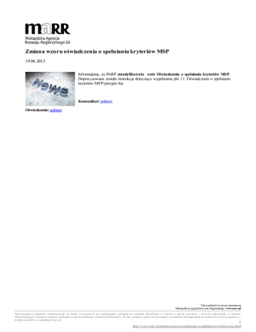 Zmiana wzoru oświadczenia o spełnianiu kryteriów MSP 19.06.2013 Informujemy, że PARP zmodyfikowała wzór Oświadczenia o spełnieniu kryteriów MSP. Doprecyzowana została instrukcja dotycząca wypełniania pkt 11 Oświadczenia o spełnieniu kryteriów MSP (przypis 4a). Komunikat: pobierz Oświadczenie: pobierz Tekst pochodzi ze strony internetowej Małopolskiej Agencji Rozwoju Regionalnego: www.marr.pl Wykorzystanie m ateriałów zam ieszczonych na stronie www.m arr.pl jest dopuszczalne wyłącznie na zasadach określonych w Ustawie o prawie autorskim i prawach pokrewnych, w zakresie odpowiadającym własnem u użytkowi osobistem u oraz dozwolonem u użytkowi publicznem u. W celu uzyskania zgody na korzystanie z m ateriałów udostępnionych na stronie www.m arr.pl, prosim y o kontakt e-m ailowy: m arketing@m arr.pl. 1 http://www.marr.pl/zmiana-wzoru-oswiadczenia--o-spelnianiu-kryteriow-msp.html