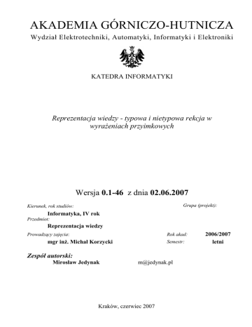 AKADEMIA GÓRNICZO-HUTNICZA Wydział Elektrotechniki, Automatyki, Informatyki i Elektroniki KATEDRA INFORMATYKI Reprezentacja wiedzy - typowa i nietypowa rekcja w wyraŜeniach przyimkowych Wersja 0.1-46 z dnia 02.06.2007 Grupa (projekt): Kierunek, rok studiów: Informatyka, IV rok Przedmiot: Reprezentacja wiedzy Prowadzący zajęcia: Rok akad: mgr inŜ. Michał Korzycki Semestr: Zespół autorski: Mirosław Jedynak [email protected] Kraków, czerwiec 2007 2006/2007 letni Mirosław Jedynak Niniejsze opracowanie powstało w trakcie i jako rezultat zajęć dydaktycznych z przedmiotu wymienionego na stronie tytułowej, prowadzonych w Akademii Górniczo-Hutniczej w Krakowie (AGH) przez osobę (osoby) wymienioną (wymienione) po słowach "Prowadzący zajęcia" i nie moŜe być wykorzystywane w jakikolwiek sposób i do jakichkolwiek celów, w całości lub części, w szczególności publikowane w jakikolwiek sposób i w jakiejkolwiek formie, bez uzyskania uprzedniej, pisemnej zgody tej osoby (tych osób) lub odpowiednich władz AGH. Copyright © 2007 Akademia Górniczo-Hutnicza (AGH) w Krakowie Spis treści 1. Opis problemu ______________________________________________________________________ 3 2. Implementacja ______________________________________________________________________ 3 2.1. Tokenizacja ___________________________________________________________________3 2.2. Tagowanie tokenów ____________________________________________________________4 2.3. Analiza _______________________________________________________________________5 2.4. Podsumowanie ogólnych zasad ___________________________________________________5 3. Wnioski ____________________________________________________________________________ 6 3.1. ZałoŜenia początkowe___________________________________________________________6 3.2. Obserwacje ___________________________________________________________________6 3.2.1. Błędy językowe _______________________________________________________________7 3.2.2. Biblioteka CLP _______________________________________________________________7 3.3. Wyniki _______________________________________________________________________7 3.3.1. Przyimek „dla” _______________________________________________________________7 3.3.2. Przyimek „do” _______________________________________________________________8 3.3.3. Przyimek „na” _______________________________________________________________8 3.3.4. Przyimek „od” _______________________________________________________________8 3.3.5. Przyimek „po” _______________________________________________________________9 3.3.6. Przyimek „przed” _____________________________________________________________9 3.3.7. Przyimek „przy” ______________________________________________________________9 3.3.8. Przyimek „w” ________________________________________________________________9 4. Podusumowanie ____________________________________________________________________ 10 Plik: Dokumentacja.doc Wersja: 0.1-46 z dnia 02.06.2007 Copyright © 2007 Akademia Górniczo-Hutnicza Stron: 10 Długość: 307 kB Prowadzenie zajęć: mgr inŜ. Michał Korzycki 2 Mirosław Jedynak 1. Opis problemu Za Kopalińskim: rekcja – składnia rządu, powiązanie dwu członów wypowiedzi, w którym człon nadrzędny wyznacza określoną formę podrzędnego. W językach fleksyjnych (takich jak np. język polski) istnieje silny związek pomiędzy syntaksą a fleksją. Najbardziej klasycznym takim związkiem jest wiązanie przypadku rzeczownika z przyimkiem (dla wyraŜenia “w lesie”- przyimek “w” narzuca tu wyrazowi “las” miejscownik). Typowa rekcja w wyraŜeniach przyimkowych to pary przyimek oraz przypadek, z którym najczęściej występują. Nietypowa rekcja w wyraŜeniach przyimkowych ma miejsce, kiedy przyimek łączy się z rzeczownikiem w danym przypadku tylko dla niewielkiej grupy wyrazów. Przykładem nietypowej rekcji jest zwrot „poszły ogary w las” – tutaj przyimek w łączy się z rzeczownikiem w bierniku. RozróŜnienie czy dana rekcja jest typowa czy nietypowa moŜe mieć miejsce tylko na podstawie statystycznej ilości wystąpień danego powiązania przyimek-przypadek. 2. Implementacja W czasie implementacji proces analizy został podzielony na 3 fazy: • tokenizacja tekstu – podziała na wyrazy oraz zdania • tagowanie - wstępne wczytanie i określenie części mowy dla danego słowa, a dla rzeczowników równieŜ przypadku. • 2.1. analiza występowania danych par przyimek-rzeczownik Tokenizacja W czasie tokenizacji wykorzystano model pull-parser tzn. następny moduł (tagger) pytał się tokenizatora o podanie kolejnego zdania. Model tokenizatora zakładał pewne uproszczenia – zdanie kończy się kropką a wyrazy rozdzielane są znakami białymi i niealfanumerycznymi. Wynikiem działania parsera były ciągi tokenów, które zostały zaklasyfikowane jako słowo (word) lub separator (separator). Zbudowanie „Ulepszonego parsera” było innym projektem, dlatego w tej części skupiłem się na funkcjonalności koniecznej do realizacji zadania związanego z rekcją. Przykładowo niektóre słowa zostały inaczej traktowanie w czasie procesu tokenizacji: na stale zostały określone skróty, które nie kończą zdania (np. „ok.”) a maja formę taką jak niektóre rzeczownik (od „oko”), niemoŜliwą do rozróŜnienia bez dokładnej analizy zdania, co wykracza poza zakres projektu. Rozpoznawane przyimki to: • dla Plik: Dokumentacja.doc Wersja: 0.1-46 z dnia 02.06.2007 Copyright © 2007 Akademia Górniczo-Hutnicza Stron: 10 Długość: 307 kB Prowadzenie zajęć: mgr inŜ. Michał Korzycki 3 Mirosław Jedynak • do • na • od • po • przed • przy • w 2.2. Tagowanie tokenów W etapie tagowania tokenów wybierane były pary słów w których pierwszy z nich był przyimkiem a drugi rzeczownikiem. Określenie części mowy dla danego słowa odbywało się z wykorzystaniem biblioteki CLP. W przypadku