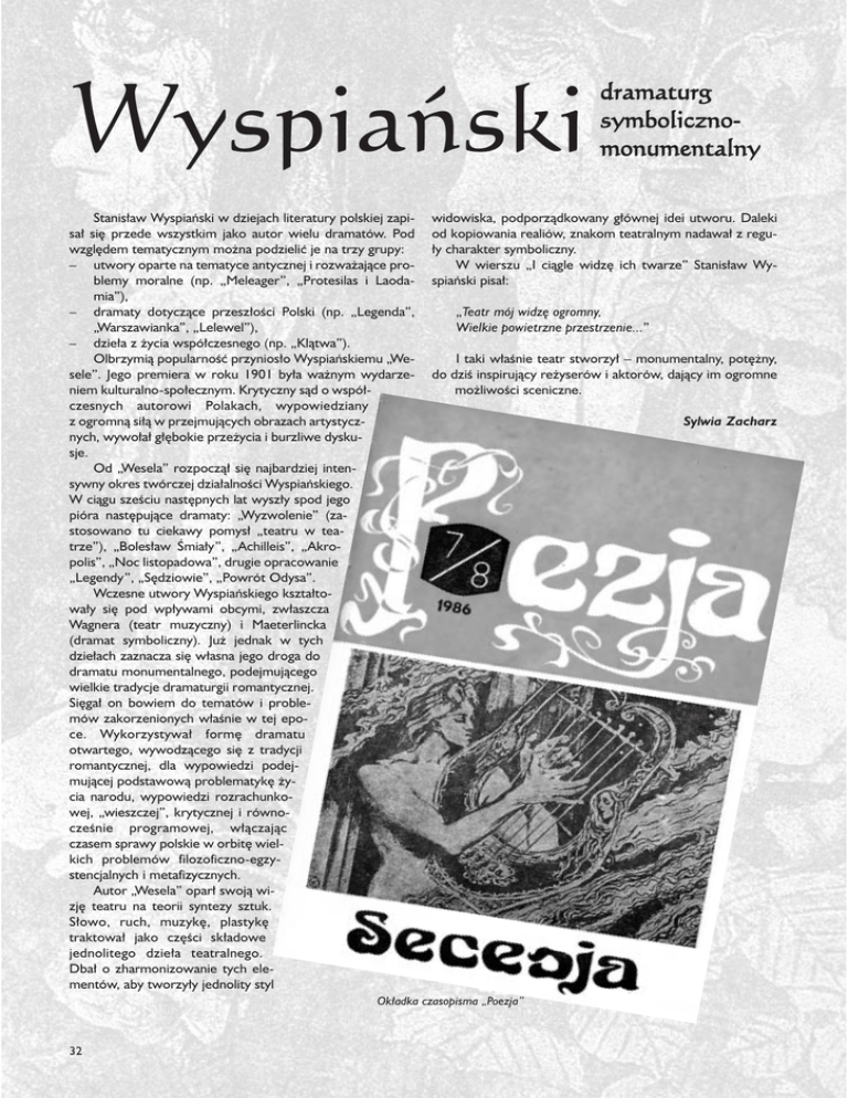 Wyspiañski Stanis³aw Wyspiañski w dziejach literatury polskiej zapisa³ siê przede wszystkim jako autor wielu dramatów. Pod wzglêdem tematycznym mo¿na podzieliæ je na trzy grupy: – utwory oparte na tematyce antycznej i rozwa¿aj¹ce problemy moralne (np. „Meleager”, „Protesilas i Laodamia”), – dramaty dotycz¹ce przesz³oœci Polski (np. „Legenda”, „Warszawianka”, „Lelewel”), – dzie³a z ¿ycia wspó³czesnego (np. „Kl¹twa”). Olbrzymi¹ popularnoœæ przynios³o Wyspiañskiemu „Wesele”. Jego premiera w roku 1901 by³a wa¿nym wydarzeniem kulturalno-spo³ecznym. Krytyczny s¹d o wspó³czesnych autorowi Polakach, wypowiedziany z ogromn¹ si³¹ w przejmuj¹cych obrazach artystycznych, wywo³a³ g³êbokie prze¿ycia i burzliwe dyskusje. Od „Wesela” rozpocz¹³ siê najbardziej intensywny okres twórczej dzia³alnoœci Wyspiañskiego. W ci¹gu szeœciu nastêpnych lat wysz³y spod jego pióra nastêpuj¹ce dramaty: „Wyzwolenie” (zastosowano tu ciekawy pomys³ „teatru w teatrze”), „Boles³aw Œmia³y”, „Achilleis”, „Akropolis”, „Noc listopadowa”, drugie opracowanie „Legendy”, „Sêdziowie”, „Powrót Odysa”. Wczesne utwory Wyspiañskiego kszta³towa³y siê pod wp³ywami obcymi, zw³aszcza Wagnera (teatr muzyczny) i Maeterlincka (dramat symboliczny). Ju¿ jednak w tych dzie³ach zaznacza siê w³asna jego droga do dramatu monumentalnego, podejmuj¹cego wielkie tradycje dramaturgii romantycznej. Siêga³ on bowiem do tematów i problemów zakorzenionych w³aœnie w tej epoce. Wykorzystywa³ formê dramatu otwartego, wywodz¹cego siê z tradycji romantycznej, dla wypowiedzi podejmuj¹cej podstawow¹ problematykê ¿ycia narodu, wypowiedzi rozrachunkowej, „wieszczej”, krytycznej i równoczeœnie programowej, w³¹czaj¹c czasem sprawy polskie w orbitê wielkich problemów filozoficzno-egzystencjalnych i metafizycznych. Autor „Wesela” opar³ swoj¹ wizjê teatru na teorii syntezy sztuk. S³owo, ruch, muzykê, plastykê traktowa³ jako czêœci sk³adowe jednolitego dzie³a teatralnego. Dba³ o zharmonizowanie tych elementów, aby tworzy³y jednolity styl widowiska, podporz¹dkowany g³ównej idei utworu. Daleki od kopiowania realiów, znakom teatralnym nadawa³ z regu³y charakter symboliczny. W wierszu „I ci¹gle widzê ich twarze” Stanis³aw Wyspiañski pisa³: „Teatr mój widzê ogromny, Wielkie powietrzne przestrzenie...” I taki w³aœnie teatr stworzy³ – monumentalny, potê¿ny, do dziœ inspiruj¹cy re¿yserów i aktorów, daj¹cy im ogromne mo¿liwoœci sceniczne. Ok³adka czasopisma „Poezja” 32 dramaturg symbolicznomonumentalny Sylwia Zacharz