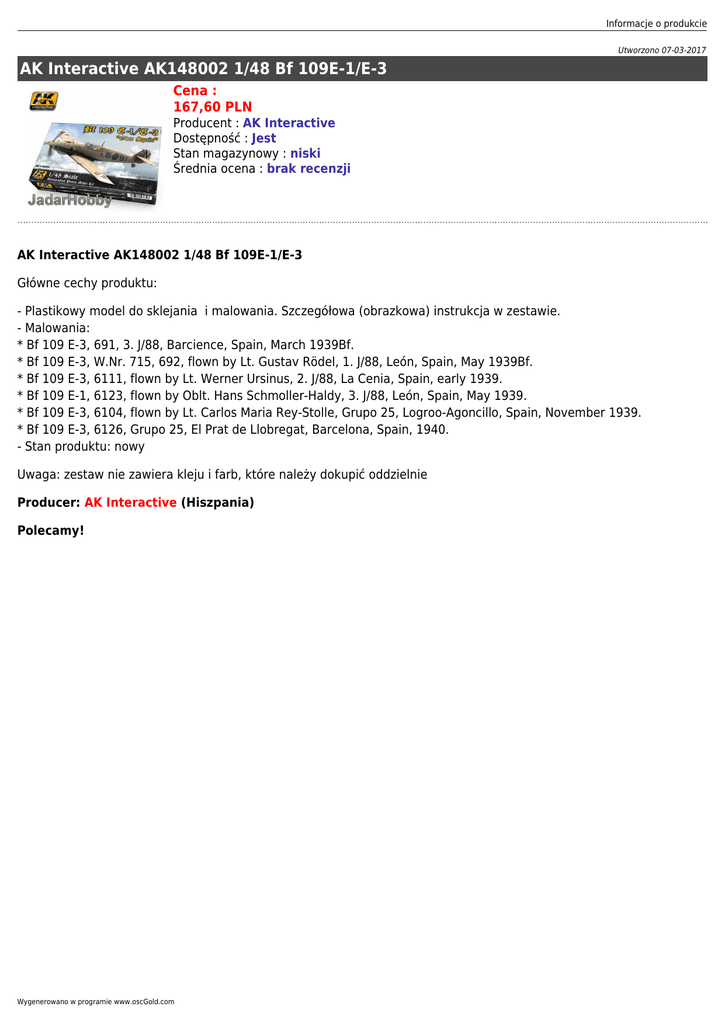 Informacje o produkcie Utworzono 07-03-2017 AK Interactive AK148002 1/48 Bf 109E-1/E-3 Cena : 167,60 PLN Producent : AK Interactive Dostępność : Jest Stan magazynowy : niski Średnia ocena : brak recenzji AK Interactive AK148002 1/48 Bf 109E-1/E-3 Główne cechy produktu: - Plastikowy model do sklejania i malowania. Szczegółowa (obrazkowa) instrukcja w zestawie. - Malowania: * Bf 109 E-3, 691, 3. J/88, Barcience, Spain, March 1939Bf. * Bf 109 E-3, W.Nr. 715, 692, flown by Lt. Gustav Rödel, 1. J/88, León, Spain, May 1939Bf. * Bf 109 E-3, 6111, flown by Lt. Werner Ursinus, 2. J/88, La Cenia, Spain, early 1939. * Bf 109 E-1, 6123, flown by Oblt. Hans Schmoller-Haldy, 3. J/88, León, Spain, May 1939. * Bf 109 E-3, 6104, flown by Lt. Carlos Maria Rey-Stolle, Grupo 25, Logroo-Agoncillo, Spain, November 1939. * Bf 109 E-3, 6126, Grupo 25, El Prat de Llobregat, Barcelona, Spain, 1940. - Stan produktu: nowy Uwaga: zestaw nie zawiera kleju i farb, które należy dokupić oddzielnie Producer: AK Interactive (Hiszpania) Polecamy! Wygenerowano w programie www.oscGold.com Informacje o produkcie Wygenerowano w programie www.oscGold.com Informacje o produkcie Wygenerowano w programie www.oscGold.com