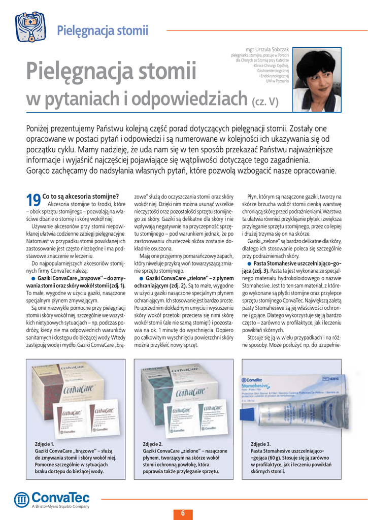 Pielęgnacja stomii mgr Urszula Sobczak Pielęgnacja stomii pielęgniarka stomijna, pracuje w Poradni dla Chorych ze Stomią przy Katedrze i Klinice Chirurgii Ogólnej, Gastroenterologicznej i Endokrynologicznej UM w Poznaniu w pytaniach i odpowiedziach (cz. V) Poniżej prezentujemy Państwu kolejną część porad dotyczących pielęgnacji stomii. Zostały one opracowane w postaci pytań i odpowiedzi i są numerowane w kolejności ich ukazywania się od początku cyklu. Mamy nadzieję, że uda nam się w ten sposób przekazać Państwu najważniejsze informacje i wyjaśnić najczęściej pojawiające się wątpliwości dotyczące tego zagadnienia. Gorąco zachęcamy do nadsyłania własnych pytań, które pozwolą wzbogacić nasze opracowanie. 19 Co to są akcesoria stomijne? Akcesoria stomijne to środki, które – obok sprzętu stomijnego – pozwalają na właściwe dbanie o stomię i skórę wokół niej. Używanie akcesoriów przy stomii niepowikłanej ułatwia codzienne zabiegi pielęgnacyjne. Natomiast w przypadku stomii powikłanej ich zastosowanie jest często niezbędne i ma podstawowe znaczenie w leczeniu. Do najpopularniejszych akcesoriów stomijnych firmy ConvaTec należą: Gaziki ConvaCare „brązowe” – do zmywania stomii oraz skóry wokół stomii (zdj. 1). To małe, wygodne w użyciu gaziki, nasączone specjalnym płynem zmywającym. Są one niezwykle pomocne przy pielęgnacji stomii i skóry wokół niej, szczególnie we wszystkich nietypowych sytuacjach – np. podczas podróży, kiedy nie ma odpowiednich warunków sanitarnych i dostępu do bieżącej wody. Wtedy zastępują wodę i mydło. Gaziki ConvaCare „brą- zowe” służą do oczyszczania stomii oraz skóry wokół niej. Dzięki nim można usunąć wszelkie nieczystości oraz pozostałości sprzętu stomijnego ze skóry. Gaziki są delikatne dla skóry i nie wpływają negatywnie na przyczepność sprzętu stomijnego – pod warunkiem jednak, że po zastosowaniu chusteczek skóra zostanie dokładnie osuszona. Mają one przyjemny pomarańczowy zapach, który niweluje przykrą woń towarzyszącą zmianie sprzętu stomijnego. Gaziki ConvaCare „zielone” – z płynem ochraniającym (zdj. 2). Są to małe, wygodne w użyciu gaziki nasączone specjalnym płynem ochraniającym. Ich stosowanie jest bardzo proste. Po uprzednim dokładnym umyciu i wysuszeniu skóry wokół przetoki przeciera się nimi skórę wokół stomii (ale nie samą stomię!) i pozostawia na ok. 1 minutę do wyschnięcia. Dopiero po całkowitym wyschnięciu powierzchni skóry można przykleić nowy sprzęt. Płyn, którym są nasączone gaziki, tworzy na skórze brzucha wokół stomii cienką warstwę chroniącą skórę przed podrażnieniami. Warstwa ta ułatwia również przyklejanie płytek i zwiększa przyleganie sprzętu stomijnego, przez co lepiej i dłużej trzyma się on na skórze. Gaziki „zielone” są bardzo delikatne dla skóry, dlatego ich stosowanie poleca się szczególnie przy podrażnieniach skóry. Pasta Stomahesive uszczelniająco-gojąca (zdj. 3). Pasta ta jest wykonana ze specjalnego materiału hydrokoloidowego o nazwie Stomahesive. Jest to ten sam materiał, z którego wykonane są płytki stomijne oraz przylepce sprzętu stomijnego ConvaTec. Największą zaletą pasty Stomahesiwe są jej właściwości ochronne i gojące. Dlatego wykorzystuje się ją bardzo często – zarówno w profilaktyce, jak i leczeniu powikłań skórnych. Stosuje się ją w wielu przypadkach i na różne sposoby. Może posłużyć np. do uzupełnie- Zdjęcie 1. Gaziki ConvaCare „brązowe” – służą do zmywania stomii i skóry wokół niej. Pomocne szczególnie w sytuacjach braku dostępu do bieżącej wody. Zdjęcie 2. Gaziki ConvaCare „zielone” – nasączone płynem, tworzącym na skórze wokół stomii ochronną powłokę, która poprawia także przyleganie sprzętu. Zdjęcie 3. Pasta Stomahesive uszczelniająco-gojąca (60 g). Stosuje się ją zarówno w profilaktyce, jak i leczeniu powikłań skórnych stomii. 6 nia wszystkich nierówności i blizn na skórze wokół stomii – wtedy wyciska się ją z tubki na skórę wokół stomii i pokrywa się nią część skóry – tam gdzie są blizny, fałdy i nierówności. Następnie zwilżonym wodą palcem ugniata się ją i rozprowadza na skórze. Płytkę przykleja się dopiero po chwili, gdy powierzchnia pasty nieco przeschnie. Pasta ta ma lepką konsystencję i doskonale nadaje się także do uszczelniania przestrzeni pomiędzy brzegiem otworu płytki lub przylepca a stomią. Należy wtedy utworzyć „wianuszek” z pasty Stomahesive wokół przetoki i dopiero wtedy przykleić płytkę na skórę. Zapobiega to podciekaniu treści jelitowej pod płytkę. Ze względu na właściwości gojące pasty, które zawdzięcza obecnym w niej hydrokoloidom, stosuje się ją także do leczenia wszelkiego typu podrażnień, uszkodzeń i zapalenia skóry wokół stomii. Wtedy należy nią pokryć zmiany zapalne występujące na skórze, rozprowadzić zwilżonym palcem, odczekać kilkanaście sekund, aż jej powierzchnia nieco przeschnie, i przykleić na nią sprzęt stomijny. Podczas nakładania pasty na uszkodzoną skórę odczuwa się lekkie pieczenie a czasami nawet ból. Jest to zjawisko normalne i ustępuje po kilkunastu sekundach. Dodatkowo można w takich przypadkach zastosować „wianuszek” z pasty wokół stomii. Pasta przedłuża czas noszenia sprzętu. Poprawia jego szczelność i przyleganie do skóry. Zalecana jest do pielęgnacji każdego typu stomii. Szczególnie zaleca się ją przy ileostomii i urostomii, aby przedłużyć czas noszenia płytki, nawet jeżeli skóra wokół stomii nie wykazuje jakichkolwiek zmian zapalnych. Jest bardzo wygodna w użyciu. Pasta Stomahesive gojąca (zdj. 4). Ma silne właściwości gojące. Jej stosowanie jest proste – wyciska się ją z tubki na zmienioną chorobowo skórę, a następnie (za pomocą zwilżonego palca) delikatnie 