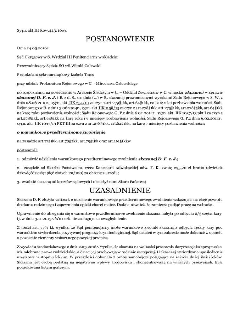 Sygn. akt III Kow.443/16wz POSTANOWIENIE Dnia 24.05.2016r. Sąd Okręgowy w S. Wydział III Penitencjarny w składzie: Przewodniczący Sędzia SO wS.Witold Galewski Protokolant sekretarz sądowy Izabela Tates przy udziale Prokuratora Rejonowego w C. - Mirosława Orłowskiego po rozpoznaniu na posiedzeniu w Areszcie Śledczym w C. – Oddział Zewnętrzny w C. wniosku skazanej w sprawie skazanej D. F. c. J. i B. z d. S., ur. dnia (...) w S., skazanej prawomocnymi wyrokami Sądu Rejonowego w S. W. z dnia 08.06.2010r., sygn. akt IIK 254/10 za czyn z art.279§1kk, art.64§1kk, na karę 2 lat pozbawienia wolności, Sądu Rejonowego w R. z dnia 3.06.2014r., sygn. akt IIK 1158/13 za czyn z art.278§1kk, art.275§1kk, art.278§5kk, art.64§1kk na karę roku pozbawienia wolności; Sądu Rejonowego G. P.z dnia 6.02.2014r., sygn. akt IIK 1037/13 pkt I za czyn z art.278§1kk, art.64§1kk na karę roku i 6 miesięcy pozbawienia wolności, Sądu Rejonowego G. P.z dnia 6.02.2014r., sygn. akt IIK 1037/13 PKT III za czyn z art.278§1kk, art.64§1kk, na karę 7 miesięcy pozbawienia wolności; o warunkowe przedterminowe zwolnienie na zasadzie art.77§1kk, art.78§2kk, art.79§1kk oraz art.161§1kkw postanowił: 1. odmówić udzielenia warunkowego przedterminowego zwolnienia skazanej D. F. c. J.; 2. zasądzić od Skarbu Państwa na rzecz Kancelarii Adwokackiej adw. F. K. kwotę 295,20 zł brutto (dwieście dziewięćdziesiąt pięć złotych 20/100) za obronę z urzędu; 3. zwolnić skazaną od kosztów sądowych i obciążyć nimi Skarb Państwa; UZASADNIENIE Skazana D. F. złożyła wniosek o udzielenie warunkowego przedterminowego zwolnienia wskazując, na chęć powrotu do domu rodzinnego i zapewnienia opieki chorej matce. Dodała również, że zamierza podjąć pracę na wolności. Uprawnienie do ubiegania się o warunkowe przedterminowe zwolnienie skazana nabyła po odbyciu 2/3 części kary, tj. w dniu 3.11.2015r. Wniosek nie zasługuje na uwzględnienie. Z treści art. 77§1 kk wynika, że Sąd penitencjarny może warunkowo zwolnić skazaną z odbycia reszty kary pod warunkiem stwierdzenia pozytywnej prognozy kryminologicznej. Sąd ustaleń w tym zakresie może dokonać w oparciu o pozostałe elementy wskazanego powyżej przepisu. Z wywiadu środowiskowego z dnia 2.03.2016r. wynika, że skazana na wolności pracowała dorywczo jako sprzątaczka. Ma odebrane prawa rodzicielskie, a dzieci jej przebywają w rodzinie zastępczej. U skazanej stwierdzono upośledzenie umysłowe w stopniu lekkim. W przeszłości dokonała 2 próby samobójcze polegające na zażyciu dużej ilości leków. Skazana jest osobą podatną na negatywne wpływy środowiska i skoncentrowaną na własnych przeżyciach. Była poszukiwana listem gończym. Z opinii sądowo-psychiatrycznej sporządzonej w sprawie 3 Ds. 2567/98 wynika, że u wskazanej rozpoznano upośledzenie umysłowe w stopniu lekkim. Stwierdzić należy, że właściwości i warunki osobiste skazanej nie przemawiają za uwzględnieniem wniosku. Należy także dokonać oceny zachowania skazanej podczas pobytu w warunkach izolacji tj. w miejscu w którym jest poddana rygorom i obowiązkom wynikającym z regulaminu wykonywania kary pozbawienia wolności oraz porządku dnia. Z opinii Dyrektora AŚ C. wynika, że skazana była 20-krotnie nagradzana regulaminowo. Wobec przełożonych prezentuje regulaminową postawę. W relacjach ze współosadzonymi jest zgodna. W okresie od 23.02.2015r. do 3.03.2015r. brała udział w programie resocjalizacyjnym M. Klub Pracy. Aktywnie uczestniczyła również w zajęciach readaptacyjnych Być Damą, Żyj w grupie. Jednak mimo uzyskania licznych wniosków nagrodowych postawy skazanej nie można uznać za wyróżniającą. Skazana popełniła szereg przekroczeń dyscyplinarnych i została 8 razy ukarana. To oznacza, że skazana nie potrafiła w pełni zaakceptować norm i obowiązków jakim została poddana w związku z odbywaniem kary pozbawienia wolności. Zatem, w świetle tak zgromadzonych informacji, nie budzi wątpliwości to, że zachowanie skazanej należy ocenić jako zmienne z przewagą poprawnego. W ocenie Sądu nie można pominąć tego, że wobec skazanej mimo odbywania kary w warunkach zakładu karnego typu otwartego nie dokonano sprawdzenia jej zachowania poza jednostką np. w systemie przepustkowym bez nadzoru ze strony funkcjonariuszy Służby Więziennej. To oznacza, że Administracja Aresztu Śledczego w C., gdzie skazana obecnie przebywa, dotychczas nie znalazła podstaw do zaufania skazanej, do tego stopnia, aby umożliwić jej wykazanie, iż podczas krótkiego pobytu na wolności jest w stanie przestrzegać zasad porządku prawnego. W tym miejscu należy się odwołać do postanowienia z dnia 19.12.2006r. SA w Krakowie w którym stwierdzono, że bez sprawdzenia zachowania skazanej poza zakładem karnym nie powinno jej udzielać się warunkowego zwolnienia z reszty kary. Podkreślić trzeba, że podobne stanowisko w zakresie konieczności sprawdzenia zachowania skazanej na wolności zajął Sąd Apelacyjny w Gdańsku w postanowieniach: z dnia 10.02.2014r. sygn. II AKzw 138/14, z dnia 17.02.2014r. sygn. II K AKzw. 196/14, z dnia 6.10.2014r. sygn. II AKzw 1947/14, z dnia 23.12.2014r. sygn. II AKzw 2550/14, z dnia 29.12.2014r. sygn. II AKzw 2617/14, z dnia 13.01.2015r. sygn. II AKzw 2691/14, z dnia 13.01.2015r. sygn. 2691/14, z dnia 9.03.2015r. sygn. II AKzw 407/15, z dnia 24.03.2015r. sygn. II AKzw 551/15 oraz z dnia 14.04.2015r. sygn. II AKzw 723/15. Przechodząc do okoliczności popełnienia przez skazaną przestępstwa podnieść należy, że o tyle mają one znaczenie dla negatywnej prognozy, a w konsekwencji i dla negatywnej decyzji w przedmiocie warunkowego zwolnienia, o ile wskazują na takie cechy skazanej, które mogą być przyczyną popełnienia przez nią kolejnego przestępstwa ( vide : postanowienie z dnia 21.10.2004r. S.A. we W. sygn. II AKzw 709/04). Z załączonych do akt ewidencyjnych odpisów wyrok