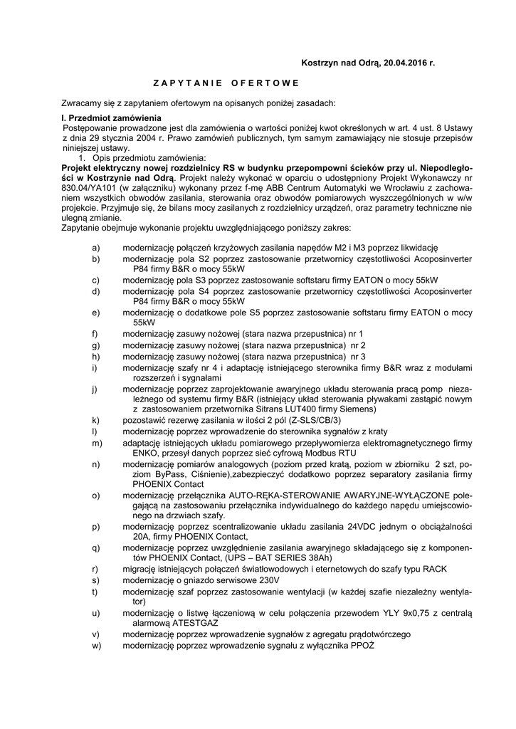 Kostrzyn nad Odrą, 20.04.2016 r. ZAPYTANIE OFERTOWE Zwracamy się z zapytaniem ofertowym na opisanych poniżej zasadach: I. Przedmiot zamówienia Postępowanie prowadzone jest dla zamówienia o wartości poniżej kwot określonych w art. 4 ust. 8 Ustawy z dnia 29 stycznia 2004 r. Prawo zamówień publicznych, tym samym zamawiający nie stosuje przepisów niniejszej ustawy. 1. Opis przedmiotu zamówienia: Projekt elektryczny nowej rozdzielnicy RS w budynku przepompowni ścieków przy ul. Niepodległości w Kostrzynie nad Odrą. Projekt należy wykonać w oparciu o udostępniony Projekt Wykonawczy nr 830.04/YA101 (w załączniku) wykonany przez f-mę ABB Centrum Automatyki we Wrocławiu z zachowaniem wszystkich obwodów zasilania, sterowania oraz obwodów pomiarowych wyszczególnionych w w/w projekcie. Przyjmuje się, że bilans mocy zasilanych z rozdzielnicy urządzeń, oraz parametry techniczne nie ulegną zmianie. Zapytanie obejmuje wykonanie projektu uwzględniającego poniższy zakres: a) b) c) d) e) f) g) h) i) j) k) l) m) n) o) p) q) r) s) t) u) v) w) modernizację połączeń krzyżowych zasilania napędów M2 i M3 poprzez likwidację modernizację pola S2 poprzez zastosowanie przetwornicy częstotliwości Acoposinverter P84 firmy B&R o mocy 55kW modernizację pola S3 poprzez zastosowanie softstaru firmy EATON o mocy 55kW modernizację pola S4 poprzez zastosowanie przetwornicy częstotliwości Acoposinverter P84 firmy B&R o mocy 55kW modernizację o dodatkowe pole S5 poprzez zastosowanie softstaru firmy EATON o mocy 55kW modernizację zasuwy nożowej (stara nazwa przepustnica) nr 1 modernizację zasuwy nożowej (stara nazwa przepustnica) nr 2 modernizację zasuwy nożowej (stara nazwa przepustnica) nr 3 modernizację szafy nr 4 i adaptację istniejącego sterownika firmy B&R wraz z modułami rozszerzeń i sygnałami modernizację poprzez zaprojektowanie awaryjnego układu sterowania pracą pomp niezależnego od systemu firmy B&R (istniejący układ sterowania pływakami zastąpić nowym z zastosowaniem przetwornika Sitrans LUT400 firmy Siemens) pozostawić rezerwę zasilania w ilości 2 pól (Z-SLS/CB/3) modernizację poprzez wprowadzenie do sterownika sygnałów z kraty adaptację istniejących układu pomiarowego przepływomierza elektromagnetycznego firmy ENKO, przesył danych poprzez sieć cyfrową Modbus RTU modernizację pomiarów analogowych (poziom przed kratą, poziom w zbiorniku 2 szt, poziom ByPass, Ciśnienie),zabezpieczyć dodatkowo poprzez separatory zasilania firmy PHOENIX Contact modernizację przełącznika AUTO-RĘKA-STEROWANIE AWARYJNE-WYŁĄCZONE polegającą na zastosowaniu przełącznika indywidualnego do każdego napędu umiejscowionego na drzwiach szafy. modernizację poprzez scentralizowanie układu zasilania 24VDC jednym o obciążalności 20A, firmy PHOENIX Contact, modernizację poprzez uwzględnienie zasilania awaryjnego składającego się z komponentów PHOENIX Contact, (UPS – BAT SERIES 38Ah) migrację istniejących połączeń światłowodowych i eternetowych do szafy typu RACK modernizację o gniazdo serwisowe 230V modernizację szaf poprzez zastosowanie wentylacji (w każdej szafie niezależny wentylator) modernizację o listwę łączeniową w celu połączenia przewodem YLY 9x0,75 z centralą alarmową ATESTGAZ modernizację poprzez wprowadzenie sygnałów z agregatu prądotwórczego modernizację poprzez wprowadzenie sygnału z wyłącznika PPOŻ 2. Do zadań projektanta należy uzgadnianie z Zamawiającym wszelkich zmian i doboru komponentów w rozwiązaniach opisanych w pkt. 1. 3. Zaprojektowany system nie może kolidować z istniejącymi urządzeniami pracującymi na obiekcie Zamawiającego. Wymagane jest, aby zachować zgodność opisów projektowanych szaf sterowniczych z istniejącymi urządzeniami. 4. Zakres zamówienia obejmuje: 4.1. sporządzenie dokumentacji w trzech egzemplarzach w wersji papierowej oraz jednego egzemplarza w wersji elektronicznej, zawierającej opis techniczny oraz zalecenia dotyczące robót montażowych z uwzględnieniem zasad BHP, 4.2. sporządzenie kosztorysu inwestorskiego, 4.3. uzyskanie akceptacji projektu w Dziale Automatyki i Utrzymania Ruchu w MZK Sp. z o.o. 5. Wymagane jest, aby przed sporządzeniem oferty, dla potrzeb wykonania zamówienia Wykonawca dokonał wizji lokalnej zakresu objętego projektem potwierdzonej przez zamawiającego. W celu ustalenia terminu przeprowadzenia wizji powinien skontaktować się z Pawłem Suroniem, tel 508 359 747, wskazanym jako osoba do kontaktów ze strony Zamawiającego. 6. Wykonawca projektu zobowiązuje się do bezpłatnego wyjaśniania niejasności i wątpliwości przy realizacji projektu. 7. Zamawiający nie dopuszcza udziału podwykonawców w realizacji zamówienia. II. Termin realizacji – wymagany jest termin do 2 m-cy od udzielenia zamówienia. III. Zamawiający poza zaoferowaną ceną wskazaną w ofercie, będzie sugerował się przy wyborze również doświadczeniem wykonawcy w zakresie wykonania projektów o charakterze jak w przedmiotowym zamówieniu. IV. Istotne warunki prowadzenia postępowania: 1. Wykonawca może zwracać się do Zamawiającego z zapytaniami do niniejszego zamówienia, w formie pisemnej, pocztą elektroniczną lub faksem. 2. Ceny należy podać w PLN. 3. W ofercie należy podać cenę netto, podatek VAT oraz cenę brutto za wykonanie przedmiotu zamówienia. 4. Otwarcie ofert odbędzie się bez udziału oferentów. 5. Zamawiający zastrzega sobie możliwość unieważnienia postępowania bez podania przyczyny i wyboru żadnej z ofert. 6. Jeżeli do Zamawiającego wpłyną dwie lub więcej ofert z taką samą najniższą ceną, Zamawiający będzie miał prawo prosić o oferty dodatkowe z ceną nie wyższą niż cena w ofercie pierwotnej. 7. Zamawiający może zwracać się do wykonawców o uzupełnienie dokumentów składających się na ofertę oraz może zwracać się o wyjaśnienie treści złożonych ofert. 8. Okres ważności ofer