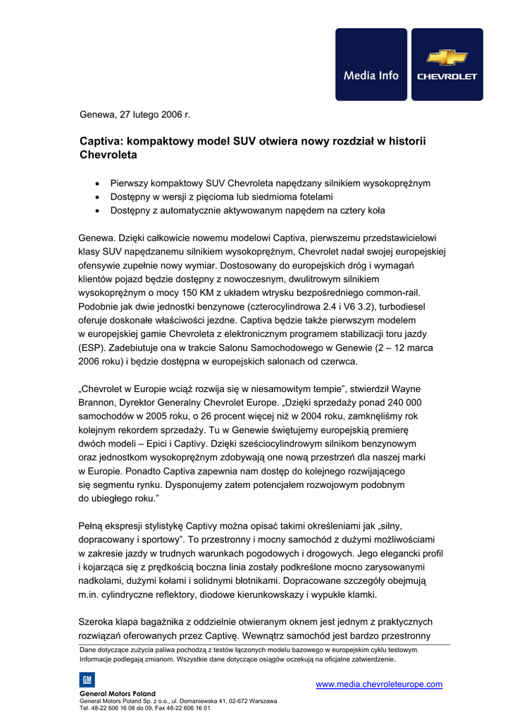 Genewa, 27 lutego 2006 r. Captiva: kompaktowy model SUV otwiera nowy rozdział w historii Chevroleta • • • Pierwszy kompaktowy SUV Chevroleta napędzany silnikiem wysokoprężnym Dostępny w wersji z pięcioma lub siedmioma fotelami Dostępny z automatycznie aktywowanym napędem na cztery koła Genewa. Dzięki całkowicie nowemu modelowi Captiva, pierwszemu przedstawicielowi klasy SUV napędzanemu silnikiem wysokoprężnym, Chevrolet nadał swojej europejskiej ofensywie zupełnie nowy wymiar. Dostosowany do europejskich dróg i wymagań klientów pojazd będzie dostępny z nowoczesnym, dwulitrowym silnikiem wysokoprężnym o mocy 150 KM z układem wtrysku bezpośredniego common-rail. Podobnie jak dwie jednostki benzynowe (czterocylindrowa 2.4 i V6 3.2), turbodiesel oferuje doskonałe właściwości jezdne. Captiva będzie także pierwszym modelem w europejskiej gamie Chevroleta z elektronicznym programem stabilizacji toru jazdy (ESP). Zadebiutuje ona w trakcie Salonu Samochodowego w Genewie (2 – 12 marca 2006 roku) i będzie dostępna w europejskich salonach od czerwca. „Chevrolet w Europie wciąż rozwija się w niesamowitym tempie”, stwierdził Wayne Brannon, Dyrektor Generalny Chevrolet Europe. „Dzięki sprzedaży ponad 240 000 samochodów w 2005 roku, o 26 procent więcej niż w 2004 roku, zamknęliśmy rok kolejnym rekordem sprzedaży. Tu w Genewie świętujemy europejskią premierę dwóch modeli – Epici i Captivy. Dzięki sześciocylindrowym silnikom benzynowym oraz jednostkom wysokoprężnym zdobywają one nową przestrzeń dla naszej marki w Europie. Ponadto Captiva zapewnia nam dostęp do kolejnego rozwijającego się segmentu rynku. Dysponujemy zatem potencjałem rozwojowym podobnym do ubiegłego roku.” Pełną ekspresji stylistykę Captivy można opisać takimi określeniami jak „silny, dopracowany i sportowy”. To przestronny i mocny samochód z dużymi możliwościami w zakresie jazdy w trudnych warunkach pogodowych i drogowych. Jego elegancki profil i kojarząca się z prędkością boczna linia zostały podkreślone mocno zarysowanymi nadkolami, dużymi kołami i solidnymi błotnikami. Dopracowane szczegóły obejmują m.in. cylindryczne reflektory, diodowe kierunkowskazy i wypukłe klamki. Szeroka klapa bagażnika z oddzielnie otwieranym oknem jest jednym z praktycznych rozwiązań oferowanych przez Captivę. Wewnątrz samochód jest bardzo przestronny Dane dotyczące zużycia paliwa pochodzą z testów łączonych modelu bazowego w europejskim cyklu testowym. Informacje podlegają zmianom. Wszystkie dane dotyczące osiągów oczekują na oficjalne zatwierdzenie. www.media.chevroleteurope.com General Motors Poland General Motors Poland Sp. z o.o., ul. Domaniewska 41, 02-672 Warszawa Tel. 48-22 606 16 08 do 09, Fax 48-22 606 16 01 -2- i oferuje przestrzeń dla pięciu, a opcjonalnie nawet dla siedmiu osób. Wymiary nowego kompaktowego przedstawiciela segmentu SUV to 4635/1850/1720 mm (długość/szerokość/wysokość), a rozstaw osi wynosi 2705 mm. W konfiguracji pięcioosobowej samochód oferuje 405 litrów (metoda pomiarowa VDA) przestrzeni bagażowej. Wszystkie fotele, w tym fotel przedniego pasażera, składają się do przodu i w dół, tworząc płaską powierzchnię. Zgodnie z tradycją Chevroleta samochód oferuje rozmaite schowki, w tym szeroką siatkę pod panelem instrumentów. Sam panel instrumentów oddzielony jest od konsoli centralnej, co ułatwia przechodzenie na drugą stronę samochodu Dzięki zastosowaniu doskonałej jakości materiałów i wysokiemu poziomowi dopasowania i wykończenia elementów, stylistyka wnętrza charakteryzuje się stylem i funkcjonalnością. Zestaw wskaźników obejmuje łatwe w odczycie, półkoliste zegary z przypominającymi aluminium obramowaniami. Elegancki, centralnie umieszczony na konsoli środkowej system audio-informacyjny ma na celu zapewnienie pasażerom rozrywki najwyższej klasy. System ten obejmuje zestaw ośmiu głośników, wzmacniacz o mocy wyjściowej 4 x 45 W i zamocowaną w desce rozdzielczej zmieniarkę płyt CD z funkcją odtwarzania plików MP3. Dostępny jest także system informacyjny dla kierowcy, przekazujący dane dotyczące systemu kontroli klimatyzacji, temperaturę zewnętrzną, wskazania kompasu, średnie zużycie paliwa, średnią prędkość jazdy oraz dystans, jaki można pokonać na pozostałym w baku paliwie. Wszechstronne wyposażenie związane z bezpieczeństwem obejmuje dwie poduszki powietrzne z przodu, kurtyny powietrzne, podkładki na wysokości kolan oraz napinacze pasów bezpieczeństwa i ograniczniki siły ich działania z przodu. Klienci mogą wybierać pomiędzy wersją z napędem na przednią oś lub na cztery koła. Ten drugi wariant wyposażony jest w aktywny system automatycznego włączania napędu na cztery koła. W sytuacji pogorszenia się warunków jazdy tylna oś zostaje błyskawicznie włączona poprzez elektronicznie sterowane elektro-magnetyczne sprzęgło, co ma na celu zapewnienie maksymalnej przyczepności. System współpracuje również z układami ESP i ABS, polepszając kontrolę sprawowaną nad pojazdem i przyczyniając się do podwyższenia poziomu bezpieczeństwa. Sam układ ESP posiada dodatkowe funkcje, jak hydrauliczne wspomaganie hamulców (HBA), system kontroli zjazdu ze zbocza (HDC), system aktywnego zabezpieczenia przed dachowaniem (ARP), system wspomagania osłabionych hamulców (FBS) oraz program stabilizacji toru jazdy przyczepy (TSA). -3- Początkowo w Captivie dostępne będą trzy wersje silnika. Obejmują one całkowicie nową, wysokoprężną jednostkę GM z systemem wtrysku bezpośredniego common rail, skonstruowaną wspólnie przez GM Daewoo Auto & Technology Company i GM Powertrain.16-zaworowy silnik oferuje moc 110 kW (150 KM) przy 4 000 obr. na min. i maksymalny moment obrotowy 320 Nm przy 2 000 obr. na min. W łączonym teście spalanie paliwa wyniosło 7,6 l na 100 km. To pierwszy silnik wysokoprężny, który będ