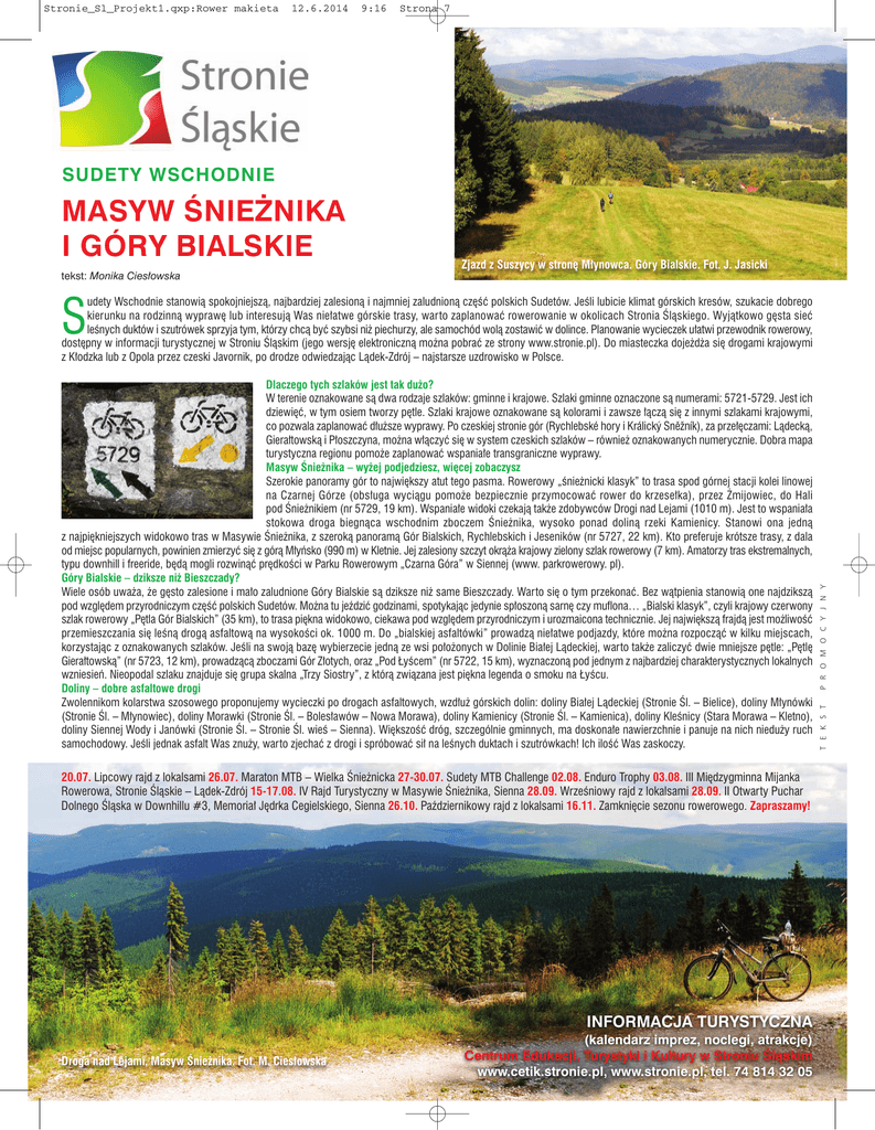 Stronie_Sl_Projekt1.qxp:Rower makieta 12.6.2014 9:16 Strona 7 SUDETY WSCHODNIE MASYW ŚNIEŻNIKA I GÓRY BIALSKIE tekst: Monika Ciesłowska Zjazd z Suszycy w stronę Młynowca. Góry Bialskie. Fot. J. Jasicki S 20.07. Lipcowy rajd z lokalsami 26.07. Maraton MTB – Wielka Śnieżnicka 27-30.07. Sudety MTB Challenge 02.08. Enduro Trophy 03.08. III Międzygminna Mijanka Rowerowa, Stronie Śląskie – Lądek-Zdrój 15-17.08. IV Rajd Turystyczny w Masywie Śnieżnika, Sienna 28.09. Wrześniowy rajd z lokalsami 28.09. II Otwarty Puchar Dolnego Śląska w Downhillu #3, Memoriał Jędrka Cegielskiego, Sienna 26.10. Październikowy rajd z lokalsami 16.11. Zamknięcie sezonu rowerowego. Zapraszamy! INFORMACJA TURYSTYCZNA Droga nad Lejami, Masyw Śnieżnika. Fot. M. Ciesłowska (kalendarz imprez, noclegi, atrakcje) Centrum Edukacji, Turystyki i Kultury w Stroniu Śląskim www.cetik.stronie.pl, www.stronie.pl, tel. 74 814 32 05 T E K S T Dlaczego tych szlaków jest tak dużo? W terenie oznakowane są dwa rodzaje szlaków: gminne i krajowe. Szlaki gminne oznaczone są numerami: 5721-5729. Jest ich dziewięć, w tym osiem tworzy pętle. Szlaki krajowe oznakowane są kolorami i zawsze łączą się z innymi szlakami krajowymi, co pozwala zaplanować dłuższe wyprawy. Po czeskiej stronie gór (Rychlebské hory i Králický Sněžník), za przełęczami: Lądecką, Gierałtowską i Płoszczyna, można włączyć się w system czeskich szlaków – również oznakowanych numerycznie. Dobra mapa turystyczna regionu pomoże zaplanować wspaniałe transgraniczne wyprawy. Masyw Śnieżnika – wyżej podjedziesz, więcej zobaczysz Szerokie panoramy gór to największy atut tego pasma. Rowerowy „śnieżnicki klasyk” to trasa spod górnej stacji kolei linowej na Czarnej Górze (obsługa wyciągu pomoże bezpiecznie przymocować rower do krzesełka), przez Żmijowiec, do Hali pod Śnieżnikiem (nr 5729, 19 km). Wspaniałe widoki czekają także zdobywców Drogi nad Lejami (1010 m). Jest to wspaniała stokowa droga biegnąca wschodnim zboczem Śnieżnika, wysoko ponad doliną rzeki Kamienicy. Stanowi ona jedną z najpiękniejszych widokowo tras w Masywie Śnieżnika, z szeroką panoramą Gór Bialskich, Rychlebskich i Jeseników (nr 5727, 22 km). Kto preferuje krótsze trasy, z dala od miejsc popularnych, powinien zmierzyć się z górą Młyńsko (990 m) w Kletnie. Jej zalesiony szczyt okrąża krajowy zielony szlak rowerowy (7 km). Amatorzy tras ekstremalnych, typu downhill i freeride, będą mogli rozwinąć prędkości w Parku Rowerowym „Czarna Góra” w Siennej (www. parkrowerowy. pl). Góry Bialskie – dziksze niż Bieszczady? Wiele osób uważa, że gęsto zalesione i mało zaludnione Góry Bialskie są dziksze niż same Bieszczady. Warto się o tym przekonać. Bez wątpienia stanowią one najdzikszą pod względem przyrodniczym część polskich Sudetów. Można tu jeździć godzinami, spotykając jedynie spłoszoną sarnę czy muflona… „Bialski klasyk”, czyli krajowy czerwony szlak rowerowy „Pętla Gór Bialskich” (35 km), to trasa piękna widokowo, ciekawa pod względem przyrodniczym i urozmaicona technicznie. Jej największą frajdą jest możliwość przemieszczania się leśną drogą asfaltową na wysokości ok. 1000 m. Do „bialskiej asfaltówki” prowadzą niełatwe podjazdy, które można rozpocząć w kilku miejscach, korzystając z oznakowanych szlaków. Jeśli na swoją bazę wybierzecie jedną ze wsi położonych w Dolinie Białej Lądeckiej, warto także zaliczyć dwie mniejsze pętle: „Pętlę Gierałtowską” (nr 5723, 12 km), prowadzącą zboczami Gór Złotych, oraz „Pod Łyścem” (nr 5722, 15 km), wyznaczoną pod jednym z najbardziej charakterystycznych lokalnych wzniesień. Nieopodal szlaku znajduje się grupa skalna „Trzy Siostry”, z którą związana jest piękna legenda o smoku na Łyścu. Doliny – dobre asfaltowe drogi Zwolennikom kolarstwa szosowego proponujemy wycieczki po drogach asfaltowych, wzdłuż górskich dolin: doliny Białej Lądeckiej (Stronie Śl. – Bielice), doliny Młynówki (Stronie Śl. – Młynowiec), doliny Morawki (Stronie Śl. – Bolesławów – Nowa Morawa), doliny Kamienicy (Stronie Śl. – Kamienica), doliny Kleśnicy (Stara Morawa – Kletno), doliny Siennej Wody i Janówki (Stronie Śl. – Stronie Śl. wieś – Sienna). Większość dróg, szczególnie gminnych, ma doskonałe nawierzchnie i panuje na nich nieduży ruch samochodowy. Jeśli jednak asfalt Was znuży, warto zjechać z drogi i spróbować sił na leśnych duktach i szutrówkach! Ich ilość Was zaskoczy. P R O M O C Y J N Y udety Wschodnie stanowią spokojniejszą, najbardziej zalesioną i najmniej zaludnioną część polskich Sudetów. Jeśli lubicie klimat górskich kresów, szukacie dobrego kierunku na rodzinną wyprawę lub interesują Was niełatwe górskie trasy, warto zaplanować rowerowanie w okolicach Stronia Śląskiego. Wyjątkowo gęsta sieć leśnych duktów i szutrówek sprzyja tym, którzy chcą być szybsi niż piechurzy, ale samochód wolą zostawić w dolince. Planowanie wycieczek ułatwi przewodnik rowerowy, dostępny w informacji turystycznej w Stroniu Śląskim (jego wersję elektroniczną można pobrać ze strony www.stronie.pl). Do miasteczka dojeżdża się drogami krajowymi z Kłodzka lub z Opola przez czeski Javornik, po drodze odwiedzając Lądek-Zdrój – najstarsze uzdrowisko w Polsce.
