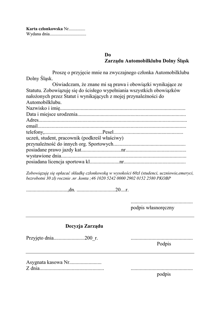 Karta członkowska Nr............... Wydana dnia................................. Do Zarządu Automobilklubu Dolny Śląsk Proszę o przyjęcie mnie na zwyczajnego członka Automobilklubu Dolny Śląsk. Oświadczam, że znane mi są prawa i obowiązki wynikające ze Statutu. Zobowiązuję się do ścisłego wypełniania wszystkich obowiązków nałożonych przez Statut i wynikających z mojej przynależności do Automobilklubu. Nazwisko i imię................................................................................................. Data i miejsce urodzenia.................................................................................... Adres................................................................................................................... email................................................................................................................... telefony,.............................................Pesel...................................................... uczeń, student, pracownik (podkreśl właściwy) przynależność do innych org. Sportowych........................................................ posiadane prawo jazdy kat...............................nr............................................... wystawione dnia................................................................................................. posiadana licencja sportowa kl.......................nr................................................ Zobowiązuję się opłacać składkę członkowską w wysokości 60zł (studenci, uczniowie,emeryci, bezrobotni 30 zł) rocznie .nr .konta ;46 1020 5242 0000 2902 0152 2580 PKOBP ................................,dn. ..............................20....r. ................................................ podpis własnoręczny Decyzja Zarządu Przyjęto dnia........................200_r. Asygnata kasowa Nr......................... Z dnia.................................................. ................................................ Podpis ................................................ podpis