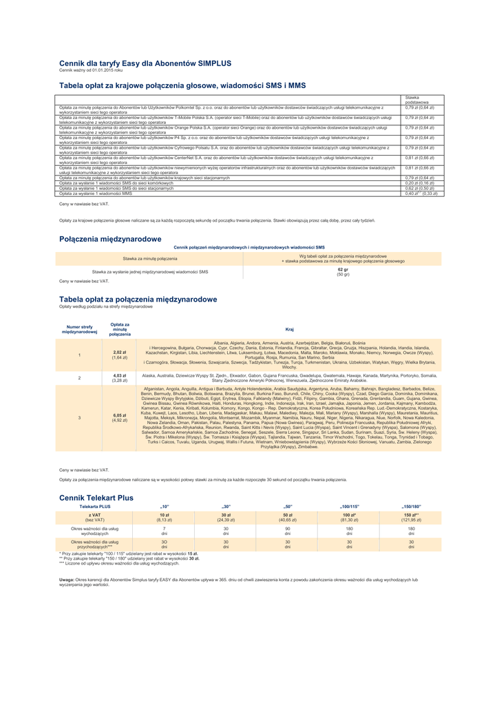 Cennik dla taryfy Easy dla Abonentów SIMPLUS Cennik ważny od 01.01.2015 roku Tabela opłat za krajowe połączenia głosowe, wiadomości SMS i MMS Stawka podstawowa 0,79 zł (0,64 zł) Opłata za minutę połączenia do Abonentów lub Użytkowników Polkomtel Sp. z o.o. oraz do abonentów lub użytkowników dostawców świadczących usługi telekomunikacyjne z wykorzystaniem sieci tego operatora Opłata za minutę połączenia do abonentów lub użytkowników T-Mobile Polska S.A. (operator sieci T-Mobile) oraz do abonentów lub użytkowników dostawców świadczących usługi telekomunikacyjne z wykorzystaniem sieci tego operatora Opłata za minutę połączenia do abonentów lub użytkowników Orange Polska S.A. (operator sieci Orange) oraz do abonentów lub użytkowników dostawców świadczących usługi telekomunikacyjne z wykorzystaniem sieci tego operatora Opłata za minutę połączenia do abonentów lub użytkowników P4 Sp. z o.o. oraz do abonentów lub użytkowników dostawców świadczących usługi telekomunikacyjne z wykorzystaniem sieci tego operatora Opłata za minutę połączenia do abonentów lub użytkowników Cyfrowego Polsatu S.A. oraz do abonentów lub użytkowników dostawców świadczących usługi telekomunikacyjne z wykorzystaniem sieci tego operatora Opłata za minutę połączenia do abonentów lub użytkowników CenterNet S.A. oraz do abonentów lub użytkowników dostawców świadczących usługi telekomunikacyjne z wykorzystaniem sieci tego operatora Opłata za minutę połączenia do abonentów lub użytkowników niewymienionych wyżej operatorów infrastrukturalnych oraz do abonentów lub użytkowników dostawców świadczących usługi telekomunikacyjne z wykorzystaniem sieci tego operatora Opłata za minutę połączenia do abonentów lub użytkowników krajowych sieci stacjonarnych Opłata za wysłanie 1 wiadomości SMS do sieci komórkowych Opłata za wysłanie 1 wiadomości SMS do sieci stacjonarnych Opłata za wysłanie 1 wiadomości MMS 0,79 zł (0,64 zł) 0,79 zł (0,64 zł) 0,79 zł (0,64 zł) 0,79 zł (0,64 zł) 0,81 zł (0,66 zł) 0,81 zł (0,66 zł) 0,79 zł (0,64 zł) 0,20 zł (0,16 zł) 0,62 zł (0,50 zł) 0,40 zł3,7 (0,33 zł) Ceny w nawiasie bez VAT. Opłaty za krajowe połączenia głosowe naliczane są za każdą rozpoczętą sekundę od początku trwania połączenia. Stawki obowiązują przez całą dobę, przez cały tydzień. Połączenia międzynarodowe Cennik połączeń międzynarodowych i międzynarodowych wiadomości SMS Stawka za minutę połączenia Wg tabeli opłat za połączenia międzynarodowe + stawka podstawowa za minutę krajowego połączenia głosowego Stawka za wysłanie jednej międzynarodowej wiadomości SMS 62 gr (50 gr) Ceny w nawiasie bez VAT. Tabela opłat za połączenia międzynarodowe Opłaty według podziału na strefy międzynarodowe Numer strefy międzynarodowej Opłata za minutę połączenia Kraj 1 2,02 zł (1,64 zł) Albania, Algieria, Andora, Armenia, Austria, Azerbejdżan, Belgia, Białoruś, Bośnia i Hercegowina, Bułgaria, Chorwacja, Cypr, Czechy, Dania, Estonia, Finlandia, Francja, Gibraltar, Grecja, Gruzja, Hiszpania, Holandia, Irlandia, Islandia, Kazachstan, Kirgistan, Libia, Liechtenstein, Litwa, Luksemburg, Łotwa, Macedonia, Malta, Maroko, Mołdawia, Monako, Niemcy, Norwegia, Owcze (Wyspy), Portugalia, Rosja, Rumunia, San Marino, Serbia i Czarnogóra, Słowacja, Słowenia, Szwajcaria, Szwecja, Tadżykistan, Tunezja, Turcja, Turkmenistan, Ukraina, Uzbekistan, Watykan, Węgry, Wielka Brytania, Włochy. 2 4,03 zł (3,28 zł) Alaska, Australia, Dziewicze Wyspy St. Zjedn., Ekwador, Gabon, Gujana Francuska, Gwadelupa, Gwatemala, Hawaje, Kanada, Martynika, Portoryko, Somalia, Stany Zjednoczone Ameryki Północnej, Wenezuela, Zjednoczone Emiraty Arabskie. 6,05 zł (4,92 zł) Afganistan, Angola, Anguilla, Antigua i Barbuda, Antyle Holenderskie, Arabia Saudyjska, Argentyna, Aruba, Bahamy, Bahrajn, Bangladesz, Barbados, Belize, Benin, Bermudy, Bhutan, Boliwia, Botswana, Brazylia, Brunei, Burkina Faso, Burundi, Chile, Chiny, Cooka (Wyspy), Czad, Diego Garcia, Dominika, Dominikana, Dziewicze Wyspy Brytyjskie, Dżibuti, Egipt, Erytrea, Etiopia, Falklandy (Malwiny), Fidżi, Filipiny, Gambia, Ghana, Grenada, Grenlandia, Guam, Gujana, Gwinea, Gwinea Bissau, Gwinea Równikowa, Haiti, Honduras, Hongkong, Indie, Indonezja, Irak, Iran, Izrael, Jamajka, Japonia, Jemen, Jordania, Kajmany, Kambodża, Kamerun, Katar, Kenia, Kiribati, Kolumbia, Komory, Kongo, Kongo - Rep. Demokratyczna, Korea Południowa, Koreańska Rep. Lud.-Demokratyczna, Kostaryka, Kuba, Kuwejt, Laos, Lesotho, Liban, Liberia, Madagaskar, Makau, Malawi, Malediwy, Malezja, Mali, Mariany (Wyspy), Marshalla (Wyspy), Mauretania, Mauritius, Majotta, Meksyk, Mikronezja, Mongolia, Montserrat, Mozambik, Myanmar, Namibia, Nauru, Nepal, Niger, Nigeria, Nikaragua, Niue, Norfolk, Nowa Kaledonia, Nowa Zelandia, Oman, Pakistan, Palau, Palestyna, Panama, Papua (Nowa Gwinea), Paragwaj, Peru, Polinezja Francuska, Republika Południowej Afryki, Republika Środkowo-Afrykańska, Reunion, Rwanda, Saint Kitts i Nevis (Wyspy), Saint Lucia (Wyspa), Saint Vincent i Grenadyny (Wyspa), Salomona (Wyspy), Salwador, Samoa Amerykańskie, Samoa Zachodnie, Senegal, Seszele, Sierra Leone, Singapur, Sri Lanka, Sudan, Surinam, Suazi, Syria, Św. Heleny (Wyspa), Św. Piotra i Mikelona (Wyspy), Św. Tomasza i Książęca (Wyspa), Tajlandia, Tajwan, Tanzania, Timor Wschodni, Togo, Tokelau, Tonga, Trynidad i Tobago, Turks i Caicos, Tuvalu, Uganda, Urugwaj, Wallis i Futuna, Wietnam, Wniebowstąpienia (Wyspy), Wybrzeże Kości Słoniowej, Vanuatu, Zambia, Zielonego Przylądka (Wyspy), Zimbabwe. 3 Ceny w nawiasie bez VAT. Opłaty za połączenia międzynarodowe naliczane są w wysokości połowy stawki za minutę za każde rozpoczęte 30 sekund od początku trwania połączenia. Cennik Telekart Plus Telekarta PLUS „10” „30” „50” „100/115” „150/180” z VAT (bez VAT) 10 