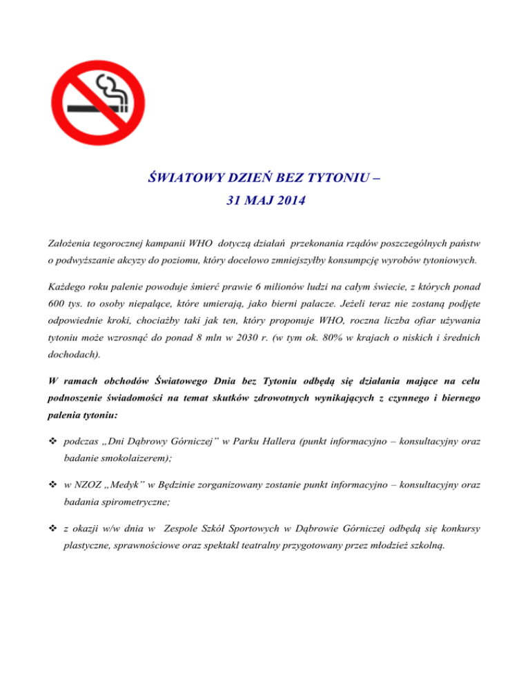 ŚWIATOWY DZIEŃ BEZ TYTONIU – 31 MAJ 2014