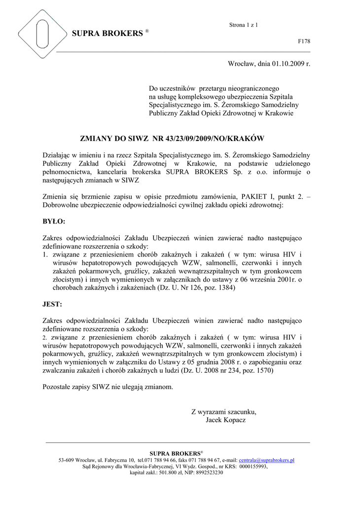 Strona 1 z 1 SUPRA BROKERS ® F178 _____________________________________________________________________________ Wrocław, dnia 01.10.2009 r. Do uczestników przetargu nieograniczonego na usługę kompleksowego ubezpieczenia Szpitala Specjalistycznego im. S. Żeromskiego Samodzielny Publiczny Zakład Opieki Zdrowotnej w Krakowie ZMIANY DO SIWZ NR 43/23/09/2009/NO/KRAKÓW Działając w imieniu i na rzecz Szpitala Specjalistycznego im. S. Żeromskiego Samodzielny Publiczny Zakład Opieki Zdrowotnej w Krakowie, na podstawie udzielonego pełnomocnictwa, kancelaria brokerska SUPRA BROKERS Sp. z o.o. informuje o następujących zmianach w SIWZ Zmienia się brzmienie zapisu w opisie przedmiotu zamówienia, PAKIET I, punkt 2. – Dobrowolne ubezpieczenie odpowiedzialności cywilnej zakładu opieki zdrowotnej: BYŁO: Zakres odpowiedzialności Zakładu Ubezpieczeń winien zawierać nadto następująco zdefiniowane rozszerzenia o szkody: 1. związane z przeniesieniem chorób zakaźnych i zakażeń ( w tym: wirusa HIV i wirusów hepatotropowych powodujących WZW, salmonelli, czerwonki i innych zakażeń pokarmowych, gruźlicy, zakażeń wewnątrzszpitalnych w tym gronkowcem złocistym) i innych wymienionych w załącznikach do ustawy z 06 września 2001r. o chorobach zakaźnych i zakażeniach (Dz. U. Nr 126, poz. 1384) JEST: Zakres odpowiedzialności Zakładu Ubezpieczeń winien zawierać nadto następująco zdefiniowane rozszerzenia o szkody: 2. związane z przeniesieniem chorób zakaźnych i zakażeń ( w tym: wirusa HIV i wirusów hepatotropowych powodujących WZW, salmonelli, czerwonki i innych zakażeń pokarmowych, gruźlicy, zakażeń wewnątrzszpitalnych w tym gronkowcem złocistym) i innych wymienionych w załączniku do Ustawy z 05 grudnia 2008 r. o zapobieganiu oraz zwalczaniu zakażeń i chorób zakaźnych u ludzi (Dz. U. 2008 nr 234, poz. 1570) Pozostałe zapisy SIWZ nie ulegają zmianom. Z wyrazami szacunku, Jacek Kopacz SUPRA BROKERS® 53-609 Wrocław, ul. Fabryczna 10, tel.071 788 94 66, faks 071 788 94 67, e-mail: [email protected] Sąd Rejonowy dla Wrocławia-Fabrycznej, VI Wydz. Gospod., nr KRS: 0000155993, kapitał zakł.: 501.800 zł, NIP: 8992523230