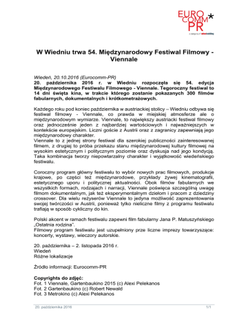 W Wiedniu trwa 54. Międzynarodowy Festiwal Filmowy Viennale Wiedeń, 20.10.2016 (Eurocomm-PR) 20. października 2016 r. w Wiedniu rozpoczęła się 54. edycja Międzynarodowego Festiwalu Filmowego - Viennale. Tegoroczny festiwal to 14 dni święta kina, w trakcie którego zostanie pokazanych 300 filmów fabularnych, dokumentalnych i krótkometrażowych. Każdego roku pod koniec października w austriackiej stolicy – Wiedniu odbywa się festiwal filmowy - Viennale, co prawda w miejskiej atmosferze ale o międzynarodowym wymiarze. Viennale, to największy austriacki festiwal filmowy oraz jednocześnie jeden z najbardziej wartościowych i najważniejszych w kontekście europejskim. Liczni goście z Austrii oraz z zagranicy zapewniają jego międzynarodowy charakter. Viennale to z jednej strony festiwal dla szerokiej publiczności zainteresowanej filmem, z drugiej to próba przekazu stanu międzynarodowej kultury filmowej na wysokim estetycznym i politycznym poziomie oraz dyskusja nad jego kondycją. Taka kombinacja tworzy niepowtarzalny charakter i wyjątkowość wiedeńskiego festiwalu. Coroczny program główny festiwalu to wybór nowych prac filmowych, produkcje krajowe, po części też międzynarodowe, przykłady żywej kinematografii, estetycznego uporu i politycznej aktualności. Obok filmów fabularnych we wszystkich formach, rodzajach i narracji, Viennale poświęca szczególną uwagę filmom dokumentalnym, jak też eksperymentalnym dziełom i pracom z dziedziny crossover. Dla wielu reżyserów Viennale to jedyna możliwość zaprezentowania swojej twórczości w Austrii, ponieważ tylko nieliczne filmy z programu festiwalu trafiają w sposób cykliczny do kin. Polski akcent w ramach festiwalu zapewni film fabularny Jana P. Matuszyńskiego „Ostatnia rodzina”. Filmowy program festiwalu jest uzupełniony prze liczne imprezy towarzyszące: koncerty, wystawy, wieczory autorskie. 20. października – 2. listopada 2016 r. Wiedeń Różne lokalizacje Źródło informacji: Eurocomm-PR Copyrights do zdjęć: Fot. 1 Viennale, Gartenbaukino 2015 (c) Alexi Pelekanos Fot. 2 Gartenbaukino (c) Robert Newald Fot. 3 Metrokino (c) Alexi Pelekanos 20. października 2016 1/1