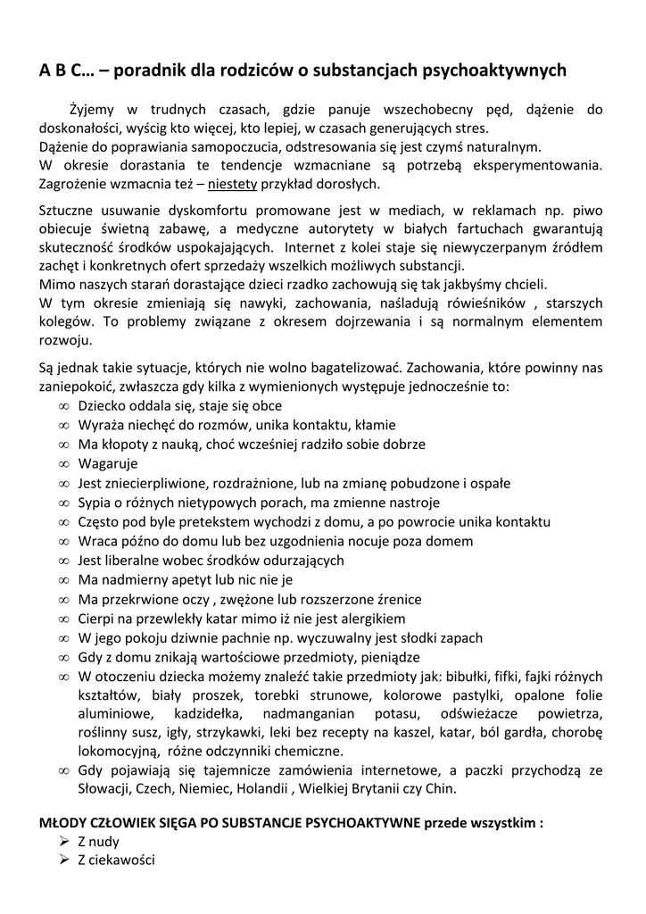 A B C… – poradnik dla rodziców o substancjach psychoaktywnych Żyjemy w trudnych czasach, gdzie panuje wszechobecny pęd, dążenie do doskonałości, wyścig kto więcej, kto lepiej, w czasach generujących stres. Dążenie do poprawiania samopoczucia, odstresowania się jest czymś naturalnym. W okresie dorastania te tendencje wzmacniane są potrzebą eksperymentowania. Zagrożenie wzmacnia też – niestety przykład dorosłych. Sztuczne usuwanie dyskomfortu promowane jest w mediach, w reklamach np. piwo obiecuje świetną zabawę, a medyczne autorytety w białych fartuchach gwarantują skuteczność środków uspokajających. Internet z kolei staje się niewyczerpanym źródłem zachęt i konkretnych ofert sprzedaży wszelkich możliwych substancji. Mimo naszych starań dorastające dzieci rzadko zachowują się tak jakbyśmy chcieli. W tym okresie zmieniają się nawyki, zachowania, naśladują rówieśników , starszych kolegów. To problemy związane z okresem dojrzewania i są normalnym elementem rozwoju. Są jednak takie sytuacje, których nie wolno bagatelizować. Zachowania, które powinny nas zaniepokoić, zwłaszcza gdy kilka z wymienionych występuje jednocześnie to: • Dziecko oddala się, staje się obce • Wyraża niechęć do rozmów, unika kontaktu, kłamie • Ma kłopoty z nauką, choć wcześniej radziło sobie dobrze • Wagaruje • Jest zniecierpliwione, rozdrażnione, lub na zmianę pobudzone i ospałe • Sypia o różnych nietypowych porach, ma zmienne nastroje • Często pod byle pretekstem wychodzi z domu, a po powrocie unika kontaktu • Wraca późno do domu lub bez uzgodnienia nocuje poza domem • Jest liberalne wobec środków odurzających • Ma nadmierny apetyt lub nic nie je • Ma przekrwione oczy , zwężone lub rozszerzone źrenice • Cierpi na przewlekły katar mimo iż nie jest alergikiem • W jego pokoju dziwnie pachnie np. wyczuwalny jest słodki zapach • Gdy z domu znikają wartościowe przedmioty, pieniądze • W otoczeniu dziecka możemy znaleźć takie przedmioty jak: bibułki, fifki, fajki różnych kształtów, biały proszek, torebki strunowe, kolorowe pastylki, opalone folie aluminiowe, kadzidełka, nadmanganian potasu, odświeżacze powietrza, roślinny susz, igły, strzykawki, leki bez recepty na kaszel, katar, ból gardła, chorobę lokomocyjną, różne odczynniki chemiczne. • Gdy pojawiają się tajemnicze zamówienia internetowe, a paczki przychodzą ze Słowacji, Czech, Niemiec, Holandii , Wielkiej Brytanii czy Chin. MŁODY CZŁOWIEK SIĘGA PO SUBSTANCJE PSYCHOAKTYWNE przede wszystkim : Z nudy Z ciekawości Z braku więzi rodzinnych, jest to szukanie akceptacji, jeśli dziecko nie spotyka jej w rodzinie, to znajduje ją w grupie rówieśniczej. MŁODZI LUDZIE SIĘGAJĄ NAJCZĘŚCIEJ: Po: 1. Dopalacze 2. Eksperymentują z roślinami znanymi jako trujące: bieluń dziędzierzawa, pokrzyk wilcza jagoda, lulek czarny 3. Leki bez recepty 4. Leki uspakajające i nasenne 5. Sterydy anaboliczne. Jeśli chodzi o dopalacze, to są to produkty pochodzenia zarówno syntetycznego jak i naturalnego, sprzedawane w sklepach internetowych lub stacjonarnych jako produkty przeznaczone do celów kolekcjonerskich, opatrzonych etykietą : produkt nie nadaje się do spożycia przez ludzi. Dopalacze to termin nieposiadający charakteru naukowego. Używa się go do określenia substancji psychoaktywnych lub ich mieszanek, które nie znajdują się na liście substancji kontrolowanych przepisami Ustawy o przeciwdziałaniu narkomanii. Dopalacze zawierają substancje działające na ośrodkowy układ nerwowy i po ich zażyciu zmienia się nastrój i zachowanie człowieka. Dopalacze możemy spotkać w postaci: kapsułek, tabletek, białego proszku, suszu grzybów, suszu roślinnego. Przyjmowane są: donosowo, doustnie, do palenia, w postaci wywaru do picia. Są trzy kierunki działania dopalaczy: działać mogą pobudzająco, euforyzująco, halucynogennie Dopalacze możemy podzielić na: Syntetyczne, substancje chemiczne o trudno brzmiących nazwach, częściej posługuje się skrótami np. BZP, JWH-018 itp. Naturalne- działanie oparte na egzotycznych roślinach , a także grzybach. Wykazują działanie euforyczne, psychodeliczne, halucynogenne. Najczęściej są palone lub zażywane w kapsułkach, w których znajduje się sproszkowany ekstrakt. Najczęściej używane rośliny to: szałwia wieszcza, powój hawajski, kratom, natomiast grzyby to muchomor czerwony i plamisty występujące w naszych lasach. Często też do mieszanek ziołowych dodawane są substancje syntetyczne. DOPALACZE SĄ bardzo NIEBEZPIECZNE DLA ZDROWIA I ŻYCIA, ze względu na: Najczęściej nieznany skład. Poszczególne substancje wywołują często odmienne stany np. radość połączona z agresją, halucynacje ze strachem. Niejednorodność .Te same dopalacze mają różny skład chemiczny. Zawierają co rusz nowe substancje o nieznanym działaniu, gdyż wpisywanie substancji na listę zakazanych powoduje, syntezę innych, często agresywniej działających, dopalacze są cały czas „unowocześniane”. Szybkie działanie i silne pobudzenie ośrodkowego układu nerwowego. Nie ma jednego wzorca reakcji na przyjętą substancję zawartą w dopalaczu. Niebezpieczne efekty uboczne, gdyż do produkcji dopalaczy używane są np. kwas solny, aceton, benzyna, fosfor itp. Brak stałości składu tzn. inne substancje, różna ich ilość w dopalaczach o tej samej nazwie. Do objawów związanych z użyciem dopalaczy należą między innymi: Agresja, napady szału Huśtawka nastroju Stany depresyjne Pobudzenie psychoruchowe Halucynacje wzrokowo- słuchowe Uczucie „oderwania od ciała” Bezsenność Biegunka , wymioty Utrata przytomności Bełkot Alternatywą dla dopalaczy są eksperymenty z roślinami występującymi w Polsce np.: o Pokrzyk wilcza jagoda- do odurzenia spożywane są owoce, w których, gdy są dojrzałe występuje duże stężenie atropiny. o Bieluń dzięd