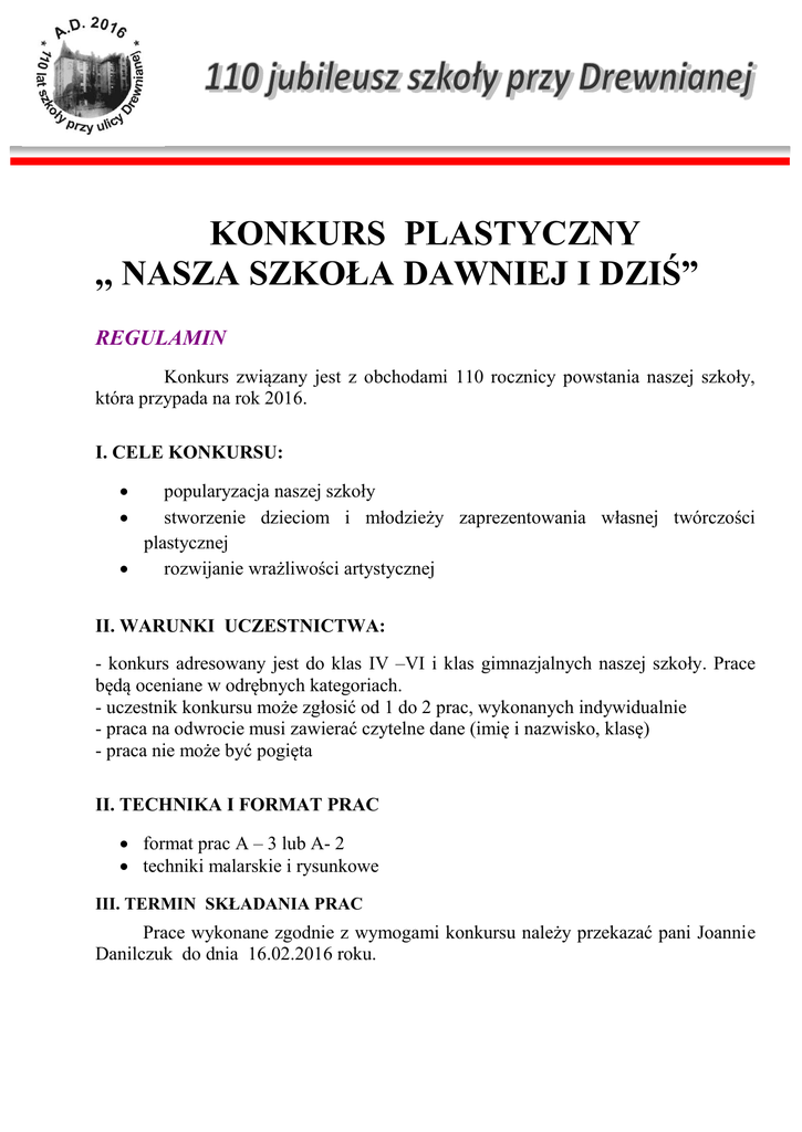 KONKURS PLASTYCZNY ,, NASZA SZKOŁA DAWNIEJ I DZIŚ” REGULAMIN Konkurs związany jest z obchodami 110 rocznicy powstania naszej szkoły, która przypada na rok 2016. I. CELE KONKURSU: popularyzacja naszej szkoły stworzenie dzieciom i młodzieży zaprezentowania własnej twórczości plastycznej rozwijanie wrażliwości artystycznej II. WARUNKI UCZESTNICTWA: - konkurs adresowany jest do klas IV –VI i klas gimnazjalnych naszej szkoły. Prace będą oceniane w odrębnych kategoriach. - uczestnik konkursu może zgłosić od 1 do 2 prac, wykonanych indywidualnie - praca na odwrocie musi zawierać czytelne dane (imię i nazwisko, klasę) - praca nie może być pogięta II. TECHNIKA I FORMAT PRAC format prac A – 3 lub A- 2 techniki malarskie i rysunkowe III. TERMIN SKŁADANIA PRAC Prace wykonane zgodnie z wymogami konkursu należy przekazać pani Joannie Danilczuk do dnia 16.02.2016 roku. V. OGŁOSZENIE WYNIKÓW, WRĘCZENIE NAGRÓD Zgłoszone prace będą eksponowane na wystawie pokonkursowej na terenie Zespołu Szkół Nr 69 oraz na stronie internetowej organizatora. Ogłoszenie wyników i wręczenie nagród nastąpi na terenie szkoły. O dokładnym terminie organizatorzy powiadomią laureatów. Organizator nie zwraca prac. Uczestnicy konkursu akceptują regulamin, wyrażając zgodę na reprodukowanie prac, powielanie, umieszczanie na stronach internetowych, itp. Wszelkie zapytania należy kierować do pani Joanny Danilczuk. ZAPRASZAMY DO UDZIAŁU W KONKURSIE Szkoła Podstawowa nr 41 Gimnazjum nr 40 z Oddziałami Integracyjnymi z Oddziałami Integracyjnymi im Stanisława Staszica im. Żołnierzy Armii Krajowej Grupy Bojowej Krybar”
