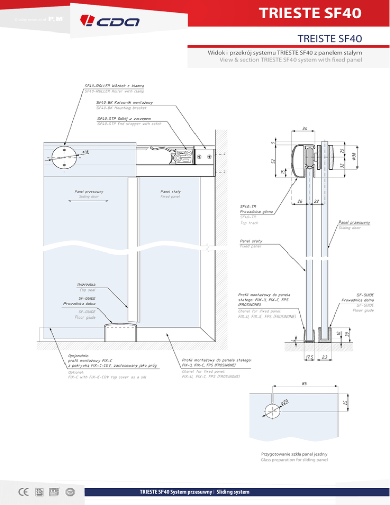 TRIESTE SF40 Quality product of TREISTE SF40 Widok i przekrój systemu TRIESTE SF40 z panelem stałym View & section TRIESTE SF40 system with fixed panel SF40-ROLLER Wózkek z klamrą SF40-ROLLER Roller with clamp SF40-BK Kątownik montażowy SF40-BK Mounting bracket SF40-STP Odbój z zaczepem SF40-STP End stopper with catch 15 32 52 ∅38 ∅38 25 5 34 Panel przesuwny Sliding door Panel stały Fixed panel 26 SF40-TR Prowadnica górna SF40-TR Top track 22 Panel przesuwny Sliding door Panel stały Fixed panel Profil montażowy do panela stałego: FIX-U, FIX-C, FPS (FROSINONE) SF-GUIDE Prowadnica dolna SF-GUIDE Prowadnica dolna SF-GUIDE Floor giude Chanel for fixed panel: FIX-U, FIX-C, FPS (FROSINONE) 4 10 SF-GUIDE Floor giude 30 Uszczelka Clip seal Opcjonalnie: profil montażowy FIX-C z pokrywką FIX-C-COV, zastosowany jako próg Profil montażowy do panela stałego: FIX-U, FIX-C, FPS (FROSINONE) Optional: FIX-C with FIX-C-COV top cover as a sill Chanel for fixed panel: FIX-U, FIX-C, FPS (FROSINONE) 17.5 23 0 ∅2 Przygotowanie szkła panel jezdny Glass preparation for sliding panel TRIESTE SF40 System przesuwny І Sliding system 25 85