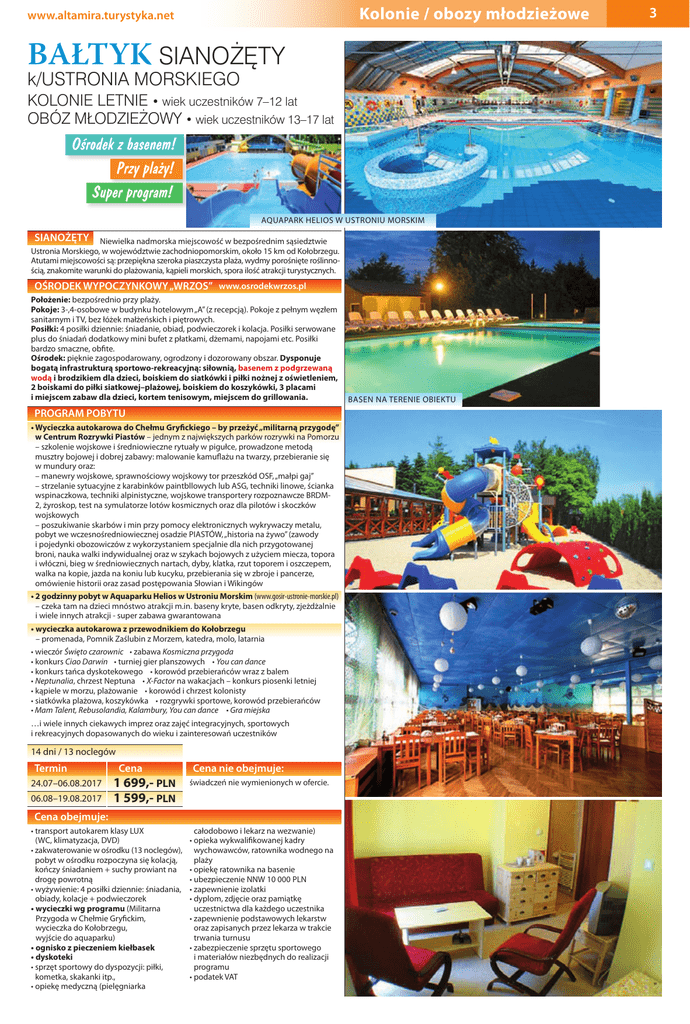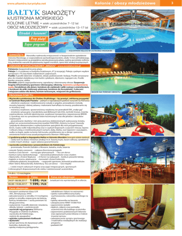Kolonie / obozy młodzieżowe www.altamira.turystyka.net BAŁTYK SIANOŻĘTY k/USTRONIA MORSKIEGO KOLONIE LETNIE • wiek uczestników 7–12 lat OBÓZ MŁODZIEŻOWY • wiek uczestników 13–17 lat Ośrodek z basenem! Przy plaży! Super program! AQUAPARK HELIOS W USTRONIU MORSKIM SIANOŻĘTY Niewielka nadmorska miejscowość w bezpośrednim sąsiedztwie Ustronia Morskiego, w województwie zachodniopomorskim, około 15 km od Kołobrzegu. Atutami miejscowości są: przepiękna szeroka piaszczysta plaża, wydmy porośnięte roślinnością, znakomite warunki do plażowania, kąpieli morskich, spora ilość atrakcji turystycznych. OŚRODEK WYPOCZYNKOWY „WRZOS” www.osrodekwrzos.pl Położenie: bezpośrednio przy plaży. Pokoje: 3-,4-osobowe w budynku hotelowym „A” (z recepcją). Pokoje z pełnym węzłem sanitarnym i TV, bez łóżek małżeńskich i piętrowych. Posiłki: 4 posiłki dziennie: śniadanie, obiad, podwieczorek i kolacja. Posiłki serwowane plus do śniadań dodatkowy mini bufet z płatkami, dżemami, napojami etc. Posiłki bardzo smaczne, obfite. Ośrodek: pięknie zagospodarowany, ogrodzony i dozorowany obszar. Dysponuje bogatą infrastrukturą sportowo-rekreacyjną: siłownią, basenem z podgrzewaną wodą i brodzikiem dla dzieci, boiskiem do siatkówki i piłki nożnej z oświetleniem, 2 boiskami do piłki siatkowej–plażowej, boiskiem do koszykówki, 3 placami i miejscem zabaw dla dzieci, kortem tenisowym, miejscem do grillowania. PROGRAM POBYTU • Wycieczka autokarowa do Chełmu Gryfickiego – by przeżyć „militarną przygodę” w Centrum Rozrywki Piastów – jednym z największych parków rozrywki na Pomorzu – szkolenie wojskowe i średniowieczne rytuały w pigułce, prowadzone metodą musztry bojowej i dobrej zabawy: malowanie kamuflażu na twarzy, przebieranie się w mundury oraz: – manewry wojskowe, sprawnościowy wojskowy tor przeszkód OSF, „małpi gaj” – strzelanie sytuacyjne z karabinków paintbllowych lub ASG, techniki linowe, ścianka wspinaczkowa, techniki alpinistyczne, wojskowe transportery rozpoznawcze BRDM2, żyroskop, test na symulatorze lotów kosmicznych oraz dla pilotów i skoczków wojskowych – poszukiwanie skarbów i min przy pomocy elektronicznych wykrywaczy metalu, pobyt we wczesnośredniowiecznej osadzie PIASTÓW, „historia na żywo” (zawody i pojedynki obozowiczów z wykorzystaniem specjalnie dla nich przygotowanej broni, nauka walki indywidualnej oraz w szykach bojowych z użyciem miecza, topora i włóczni, bieg w średniowiecznych nartach, dyby, klatka, rzut toporem i oszczepem, walka na kopie, jazda na koniu lub kucyku, przebierania się w zbroje i pancerze, omówienie historii oraz zasad postępowania Słowian i Wikingów • 2 godzinny pobyt w Aquaparku Helios w Ustroniu Morskim (www.gosir-ustronie-morskie.pl) – czeka tam na dzieci mnóstwo atrakcji m.in. baseny kryte, basen odkryty, zjeżdżalnie i wiele innych atrakcji - super zabawa gwarantowana • wycieczka autokarowa z przewodnikiem do Kołobrzegu – promenada, Pomnik Zaślubin z Morzem, katedra, molo, latarnia • wieczór Święto czarownic • zabawa Kosmiczna przygoda • konkurs Ciao Darwin • turniej gier planszowych • You can dance • konkurs tańca dyskotekowego • korowód przebierańców wraz z balem • Neptunalia, chrzest Neptuna • X-Factor na wakacjach – konkurs piosenki letniej • kąpiele w morzu, plażowanie • korowód i chrzest kolonisty • siatkówka plażowa, koszykówka • rozgrywki sportowe, korowód przebierańców • Mam Talent, Rebusolandia, Kalambury, You can dance • Gra miejska …i wiele innych ciekawych imprez oraz zajęć integracyjnych, sportowych i rekreacyjnych dopasowanych do wieku i zainteresowań uczestników 14 dni / 13 noclegów Termin 24.07–06.08.2017 06.08–19.08.2017 Cena 1 699,- PLN 1 599,- PLN Cena nie obejmuje: świadczeń nie wymienionych w ofercie. Cena obejmuje: • transport autokarem klasy LUX (WC, klimatyzacja, DVD) • zakwaterowanie w ośrodku (13 noclegów), pobyt w ośrodku rozpoczyna się kolacją, kończy śniadaniem + suchy prowiant na drogę powrotną • wyżywienie: 4 posiłki dziennie: śniadania, obiady, kolacje + podwieczorek • wycieczki wg programu (Militarna Przygoda w Chełmie Gryfickim, wycieczka do Kołobrzegu, wyjście do aquaparku) • ognisko z pieczeniem kiełbasek • dyskoteki • sprzęt sportowy do dyspozycji: piłki, kometka, skakanki itp., • opiekę medyczną (pielęgniarka całodobowo i lekarz na wezwanie) •o pieka wykwalifikowanej kadry wychowawców, ratownika wodnego na plaży •o piekę ratownika na basenie •u bezpieczenie NNW 10 000 PLN • z apewnienie izolatki •d yplom, zdjęcie oraz pamiątkę uczestnictwa dla każdego uczestnika • z apewnienie podstawowych lekarstw oraz zapisanych przez lekarza w trakcie trwania turnusu • z abezpieczenie sprzętu sportowego i materiałów niezbędnych do realizacji programu •p odatek VAT BASEN NA TERENIE OBIEKTU 3