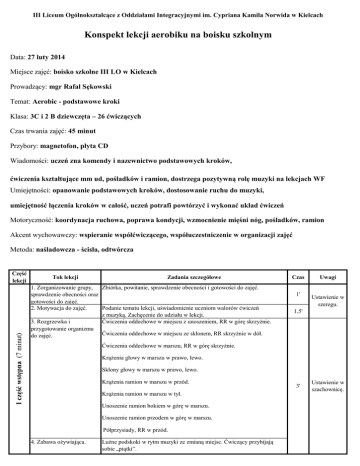 III Liceum Ogólnokształcące z Oddziałami Integracyjnymi im. Cypriana Kamila Norwida w Kielcach Konspekt lekcji aerobiku na boisku szkolnym Data: 27 luty 2014 Miejsce zajęć: boisko szkolne III LO w Kielcach Prowadzący: mgr Rafał Sękowski Temat: Aerobic - podstawowe kroki Klasa: 3C i 2 B dziewczęta – 26 ćwiczących Czas trwania zajęć: 45 minut Przybory: magnetofon, płyta CD Wiadomości: uczeń zna komendy i nazewnictwo podstawowych kroków, ćwiczenia kształtujące mm ud, pośladków i ramion, dostrzega pozytywną rolę muzyki na lekcjach WF Umiejętności: opanowanie podstawowych kroków, dostosowanie ruchu do muzyki, umiejętność łączenia kroków w całość, uczeń potrafi powtórzyć i wykonać układ ćwiczeń Motoryczność: koordynacja ruchowa, poprawa kondycji, wzmocnienie mięśni nóg, pośladków, ramion Akcent wychowawczy: wspieranie współćwiczącego, współuczestniczenie w organizacji zajęć Metoda: naśladowcza - ścisła, odtwórcza I część wstępna (7 minut) Część lekcji Tok lekcji Zadania szczegółowe 1. Zorganizowanie grupy, Zbiórka, powitanie, sprawdzenie obecności i gotowości do zajęć. sprawdzenie obecności oraz gotowości do zajęć. 2. Motywacja do zajęć. Podanie tematu lekcji, uświadomienie uczniom walorów ćwiczeń z muzyką. Zachęcenie do udziału w lekcji. 3. Rozgrzewka i Ćwiczenia oddechowe w miejscu z unoszeniem, RR w górę skrzyżnie. przygotowanie organizmu Ćwiczenia oddechowe w miejscu ze skłonem, RR skrzyżnie w dół. do zajęć. Czas 1' Uwagi Ustawienie w szeregu. 1,5' Ćwiczenia oddechowe w marszu, RR w górę skrzyżnie. Krążenia głowy w marszu w prawo, lewo. Skłony głowy w marszu w prawo, lewo. Krążenia ramion w marszu w przód. Krążenia ramion w marszu w tył. Unoszenie ramion bokiem w górę w marszu. Unoszenie ramion przodem w górę w marszu. Półprzysiady, RR w przód. 4. Zabawa ożywiająca. Luźne podskoki w rytm muzyki ze zmianą miejsc. Ćwiczący przybijają sobie „piątki”. 3' Ustawienie w szachownicę. Część lekcji Zadania szczegółowe Tok lekcji 5. Kształtowanie Step - out (szeroki rozkrok i akcent z dotykaniem podłoża palcami stóp: umiejętności, doskonalenie wymachy RR na przemian (PR, LR) z boku w przód sprawności motorycznej. wymachy RR (obu jednocześnie) z boku w przód Uwagi 8x Ustawienie w szachownicę. 8x wymachy RR na przemian (PR, LR) z boku w górę 8x wymachy RR (obu jednocześnie) z boku w górę Step - touch (krok dostawny): 8x RR wzdłuż tułowia 8x 7. Łączenie kroków w całość. wyrzut RR (obu jednocześnie) góra, dół 8x klaśnięcie przed sobą 8x 8. Doskonalenie całego układu. z podniesieniem kolana 8x wyrzut RR w przód na 1,2 na 3,4 skrzyżowanie dłoni na barkach 8x wyrzut naprzmienny RR góra, skos 8x po L w prawo, RR wzdłuż tułowia 8x po L w lewo, RR wzdłuż tułowia 8x po kwadracie, RR do poziomu Podwójny step - touch (krok dostawny podwójny): 8x RR wzdłuż tułowia 8x RR skrzyżnie przed sobą 8x z unoszeniem kolana 8x unoszenie prostych RR w górę 8x z klaśnięciem z podskokiem 8x z obrotem 8x 8x 8x 8x 8x 8x 8x 8x 8x 8x 8x 8x 8x 8x 8x 8x II część główna (33 minuty) 6. Nauka poszczególnych kroków i ich nazw. po L w prawo, RR wzdłuż tułowia po L w lewo, RR wzdłuż tułowia po kwadracie, RR skrzyżnie przed sobą po skosie w przód, tył V step w przód V step w tył Heel-back pojedynczy (ugięcie kolana) Step-touch podwójny, RR skrzyżnie w przód V step w przód V step w tył Step-touch podwójny z akcentem kolano - łokieć Heel-back podwójny (podwójne ugięcie kolana) Grapevine w prawo (krok skrzyżny z tyłu) Grapevine w lewo (krok skrzyżny z tyłu) Step-touch po kwadracie, RR w bok III część końcowa ( 5 minut) Czas 8x 9. Uspokojenie organizmu. Ćwiczenia stretchingowe w siadzie. Ćwiczenia oddechowe. 10. Czynności organizacyjne 11. Nastawienie do samodzielnej pracy. Zbiórka, podsumowanie zajęć, przypomnienie używanej terminologii poszczególnych kroków. Pochwały. Porzadkowanie miejsca ćwiczeń. 2' Nauka fragmentami, które połączone w całość tworzą układ, który powtarzamy 2-3 razy. Ustawienie w szachownicę. 2' Ustawienie w szeregu. Motywacja do dalszych ćwiczeń oraz aktywnego i zdrowego stylu życia. 1'
