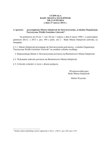 UCHWAŁA RADY MIASTA SULEJÓWEK NR LVI/393/2014 z dnia 27 marca 2014 r. w sprawie: przystąpienia Miasta Sulejówek do Stowarzyszenia „Lokalna Organizacja Turystyczna Wielki Gościniec Litewski”. Na podstawie art.18 ust. 1 i art. 84 ust. 1 ustawy z dnia 8 marca 1990 r. o samorządzie gminnym (Dz.U. z 2013 r. poz. 594 z późn. zm.1) – Rada Miasta Sulejówek uchwala, co następuje: § 1.1. Miasto Sulejówek przystępuje do Stowarzyszenia pod nazwą: „Lokalna Organizacja Turystyczna Wielki Gościniec Litewski” na zasadzie członka zwykłego. 2. Reprezentację Miasta w Stowarzyszeniu powierza się Burmistrzowi Miasta Sulejówek. § 2. Wykonanie uchwały powierza się Burmistrzowi Miasta Sulejówek. § 3. Uchwała wchodzi w życie z dniem podjęcia. Wiceprzewodnicząca Rady Miasta Sulejówek Halina Wysocka 1 Zmiany tekstu jednolitego ustawy ogłoszono w Dz.U. z 2013 r. poz. 645 i poz.1318. Uzasadnienie Miasto Sulejówek zamierza przystąpić do Lokalnej Organizacji Turystycznej Wielki Gościniec Litewski (LOT WGL) z siedzibą w Sokołowie Podlaskim ul. Wolności 21, jako członek zwyczajny. Zgodnie ze statutem Stowarzyszenia, jednostki samorządu terytorialnego mogą wyznaczyć jednego przedstawiciela, który będzie realizował prawa i obowiązki członkowskie. Przedmiotem działalności LOT WGL jest promocja regionu wschodniego Mazowsza i Podlasia, w tym szczególnie: kreowanie i upowszechnianie wizerunku szlaku WGL i terenów przez jaki on przebiega jako rozpoznawalnej marki turystycznej, atrakcyjnej zarówno w kraju jak i za granicą; wzrost znaczenia turystyki w gospodarce i rozwoju gmin i powiatów wschodniego Mazowsza i Podlasia. Do przedmiotu działalności LOT WGL należy również prowadzenie działań z zakresu kultury, sztuki, historii, archeologii, ochrony dóbr kultury i tradycji, dziedzictwa krajobrazowo przyrodniczego, podtrzymywania tradycji narodowej i regionalnej, prowadzenie działalności wspomagającej rozwój wspólnot i społeczności lokalnych, rozwój nauki, edukacji i wychowania. Przystąpienie do Stowarzyszenia skutkuje obowiązkiem płacenia składek członkowskich w wysokości 0,20 zł od jednego mieszkańca Miasta, z poniesieniem jednorazowej opłaty wpisowej w wysokości 50 zł. Oblicza się, iż szacunkowa roczna wysokość składki członkowskiej wyniesie ok. 3.757 zł i zostanie pokryta z budżetu Miasta. Liczba mieszkańców Miasta Sulejówek na dzień 1 marca 2014 r. – 18 783 osoby.