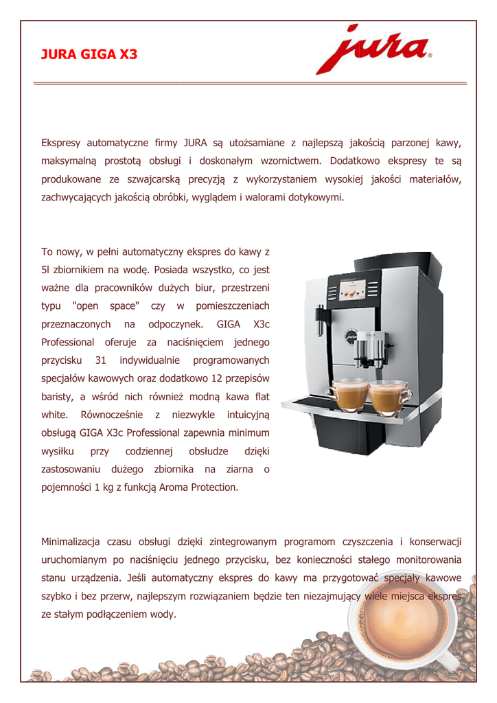 JURA GIGA X3 Ekspresy automatyczne firmy JURA są utożsamiane z najlepszą jakością parzonej kawy, maksymalną prostotą obsługi i doskonałym wzornictwem. Dodatkowo ekspresy te są produkowane ze szwajcarską precyzją z wykorzystaniem wysokiej jakości materiałów, zachwycających jakością obróbki, wyglądem i walorami dotykowymi. To o nowy, w pełni automatyczny ekspres do kawy z 5l zbiornikiem na wodę.. Posiada wszystko, co jest ważne dla pracowników dużych użych biur, przestrzeni typu "open space" przeznaczonych Professional przycisku na oferuje 31 czy w pomieszczeniach odpoczynek. za GIGA naciśnięciem indywidualnie X3c jednego programowanych specjałów kawowych oraz dodatkowo 12 przepisów baristy, a wśród nich ch również modną kawa flat white. Równocześnie z niezwykle intuicyjną obsługą GIGA X3c Professional zapewnia minimum wysiłku przy zastosowaniu codziennej dużego obsłudze zbiornika na dzięki ziarna o pojemności 1 kg z funkcją Aroma Protection. Minimalizacja czasu obsługi dzięki zintegrowanym programom czyszczenia i konserwacji uruchomianym po naciśnięciu jednego przycisku, bez konieczności stałego monitorowania stanu urządzenia. Jeśli automatyczny ekspres do kawy ma przygotować specjały kawowe szybko zybko i bez przerw, najlepszym rozwiązaniem będzie ten niezajmujący wiele miejsca ekspres ze stałym podłączeniem wody. JURA GIGA X3 Dane techniczne: Regulowana jednostka zaparzająca Inteligentny System Wstępnego Zaparzania - Intelligent Pre-Brew Aroma System (I.P.B.A.S.©) Wstępne podgrzewanie Aktywny monitoring ilości ziaren Energy Save Mode (E.S.M.©) Wysokowydajna pompa, 15 bar System grzewczy Termoblok Monitoring napełnienia tacy ociekowej Wyświetlanie statusu konserwacji Zintegrowany program płukania, czyszczenia i odkamieniania Regulacja ustawień twardości wody Jedna lub dwie filiżanki espresso podczas jednego cyklu Higiena JURA: certyfikat TÜV Zero-Energy Switch lub włącznik zasilania Swiss made Ilość indywidualnie zaprogramowanych przepisów Sposób przyrządzenia Przepisy Baristy Dzbanek espresso najlepszej jakości Funkcja Gorącej Dodatkowa kawa mielona Kawa 2 latte macchiato 2 cappuccino 2 Cafe Latte 2 kawy 5 - 16 g ✔ ✔ ✔ ✔ 2 2 ✔ ✔ ✔ ✔ ✔ ✔ Klasyczny ✔ 43 1 Latte Macchiato 1 Cappuccino 2 Kawy 1 Kawa 2 Espresso 1 Espresso 2 Ristretti 1 Ristretto Dzbanek kawy Mleko, pianka mleczna 1 Flat White 2 Flat Whites ✔ ✔ Ulepszony dozownik wrzątku ✔ 2 min. 33 sek. 1 min. 31 sek. 1 min. 23 sek. 1 min. 8 sek. 1 min. 3 sek. JURA GIGA X3 2 espresso 2 ristretto Gorąca woda (200 ml) Technologia delikatnej pianki JURA Przygotowanie mleka lub spienionego mleka Licznik młynka Pojemnik na kawę mieloną Dla zwiększenia różnorodności możliwość stosowania kawy mielonej Wybór ziaren A la carte Programowanie ilości wody Ilość wody może być dostosowywana za każdym razem Programowanie mocy kawy Kolejne kroki programowania mocy kawy Programowanie temperatury Programowanie ilości mleka Programowanie temperatury wody Programowanie ilości gorącej wody Rotary Switch Programowanie przycisków przygotowania napoi Licznik dzienny Programowanie godziny włączenia Programowanie godziny wyłączenia Godziny włączenia i wyłączenia mogą zostać zaprogramowane indywidualnie na każdy dzień tygodnia Pokazuje ilość przygotowanych kaw w podziale na rodzaje Wskaźnik zużycia filtra Zintegrowany program płukania i czyszczenia dyszy cappuccino Automatyczny program płukania systemu cappuccino Wyświetlacz czasu pozostałego do zakończenia cyklu / wskaźnik przebiegu procesu Generowanie grupy kodów Wireless Ready Wyświetlacz Venti Ports regulacja szerokości rozstawu podwójnej wylewki Regulacja wysokości podwójnej wylewki (mleko/kawa) Dysza gorącej wody Regulowana dysza gorącej wody Osobne odkamienianie zbiornika na wodę 38 sek. 29 sek. 28 sek. ✔ ✔ 1 ✔ ✔ ✔ ✔ ✔ 5 ✔ 3 ✔ 3 kroki ✔ ✔ 8 ✔ ✔ ✔ ✔ ✔ ✔ ✔ ✔ ✔ ✔ ✔ Kolorowy wyświetlacz TFT ✔ 20 - 50 mm 70 - 159 mm ✔ 69 - 165 mm ✔ JURA GIGA X3 Projektowanie akustyczne Schowek na akcesoria Dzienna wydajność Pojemność zbiornika na wodę Pojemność zbiornika na fusy (porcje) Ilość zbiorników na ziarna kawy Pojemność zbiornika na ziarna kawy z pokrywą chroniącą aromat Długość kabla zasilającego Napięcie Natężenie prądu Częstotliwość Moc Systemy do rozliczania Zużycie energii podczas czasu oczekiwania Waga Szerokość / Wysokość / Głębokość w cm ✔ ✔ 120 5l 40 1 1000 g 1,1 m 220 - 240 prąd przemienny 10 amp 50 Hz 2300 wat zgodny < 0.5 18,2 kg 37 / 55 / 49,7