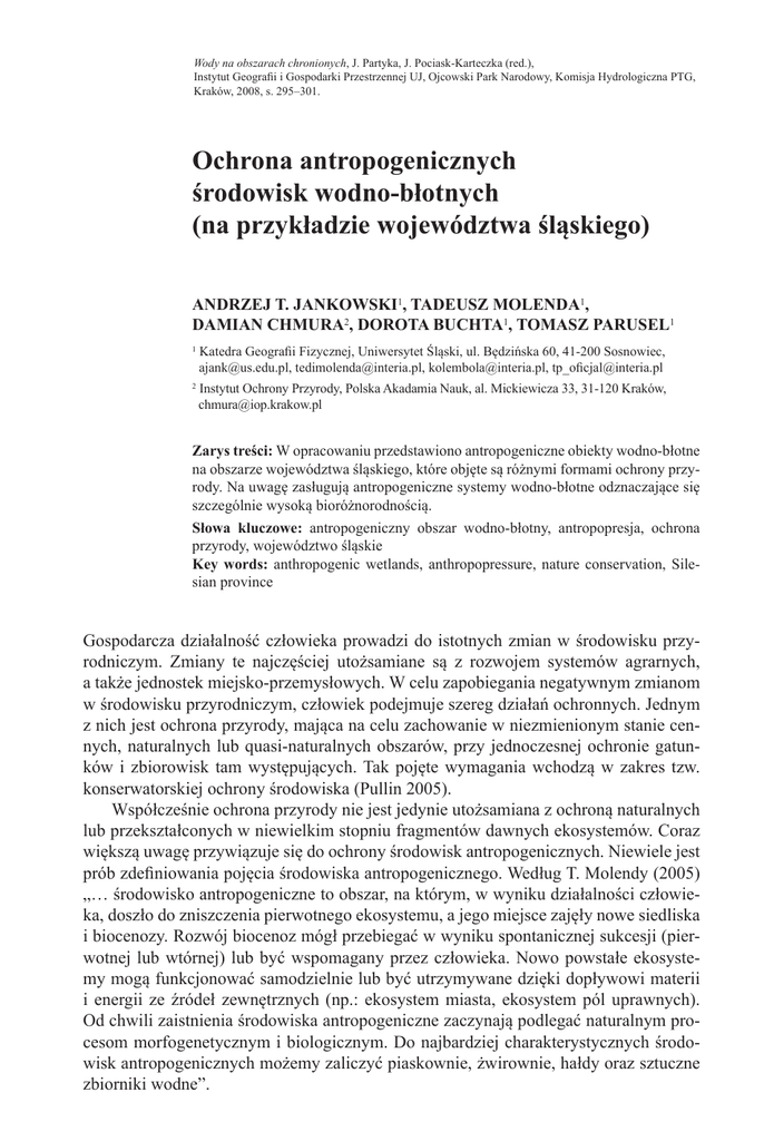 Wody na obszarach chronionych, J. Partyka, J. Pociask-Karteczka (red.), Instytut Geografii i Gospodarki Przestrzennej UJ, Ojcowski Park Narodowy, Komisja Hydrologiczna PTG, Kraków, 2008, s. 295–301. Ochrona antropogenicznych środowisk wodno-błotnych (na przykładzie województwa śląskiego) Andrzej T. Jankowski1, Tadeusz Molenda1, Damian Chmura2, Dorota Buchta1, Tomasz Parusel1 1 Katedra Geografii Fizycznej, Uniwersytet Śląski, ul. Będzińska 60, 41-200 Sosnowiec, [email protected], [email protected], [email protected], [email protected] 2 Instytut Ochrony Przyrody, Polska Akadamia Nauk, al. Mickiewicza 33, 31-120 Kraków, [email protected] Zarys treści: W opracowaniu przedstawiono antropogeniczne obiekty wodno-błotne na obszarze województwa śląskiego, które objęte są różnymi formami ochrony przyrody. Na uwagę zasługują antropogeniczne systemy wodno-błotne odznaczające się szczególnie wysoką bioróżnorodnością. Słowa kluczowe: antropogeniczny obszar wodno-błotny, antropopresja, ochrona przyrody, województwo śląskie Key words: anthropogenic wetlands, anthropopressure, nature conservation, Silesian province Gospodarcza działalność człowieka prowadzi do istotnych zmian w środowisku przyrodniczym. Zmiany te najczęściej utożsamiane są z rozwojem systemów agrarnych, a także jednostek miejsko-przemysłowych. W celu zapobiegania negatywnym zmianom w środowisku przyrodniczym, człowiek podejmuje szereg działań ochronnych. Jednym z nich jest ochrona przyrody, mająca na celu zachowanie w niezmienionym stanie cennych, naturalnych lub quasi-naturalnych obszarów, przy jednoczesnej ochronie gatunków i zbiorowisk tam występujących. Tak pojęte wymagania wchodzą w zakres tzw. konserwatorskiej ochrony środowiska (Pullin 2005). Współcześnie ochrona przyrody nie jest jedynie utożsamiana z ochroną naturalnych lub przekształconych w niewielkim stopniu fragmentów dawnych ekosystemów. Coraz większą uwagę przywiązuje się do ochrony środowisk antropogenicznych. Niewiele jest prób zdefiniowania pojęcia środowiska antropogenicznego. Według T. Molendy (2005) „… środowisko antropogeniczne to obszar, na którym, w wyniku działalności człowieka, doszło do zniszczenia pierwotnego ekosystemu, a jego miejsce zajęły nowe siedliska i biocenozy. Rozwój biocenoz mógł przebiegać w wyniku spontanicznej sukcesji (pierwotnej lub wtórnej) lub być wspomagany przez człowieka. Nowo powstałe ekosystemy mogą funkcjonować samodzielnie lub być utrzymywane dzięki dopływowi materii i energii ze źródeł zewnętrznych (np.: ekosystem miasta, ekosystem pól uprawnych). Od chwili zaistnienia środowiska antropogeniczne zaczynają podlegać naturalnym procesom morfogenetycznym i biologicznym. Do najbardziej charakterystycznych środowisk antropogenicznych możemy zaliczyć piaskownie, żwirownie, hałdy oraz sztuczne zbiorniki wodne”. 296 Andrzej T. Jankowski, Tadeusz Molenda, Damian Chmura, Dorota Buchta, Tomasz Paruse1 Na obszarze województwa śląskiego, którego znaczna część była i jest w dalszym ciągu poddawana silnej antropopresji, liczne tego typu obiekty objęte zostały różnymi formami ochrony przyrody. Celem opracowania jest wskazanie możliwości opracowania katalogu obiektów związanych ze środowiskami wodno-błotnymi pochodzenia ściśle antropogenicznego oraz pochodzenia przyrodniczego, z udziałem wpływów antropogenicznych. Pominięto środowiska Fot. 1. Rezerwat przyrody „Łężczok” o genezie naturalnej. Źródło: http://przyroda.katowice.pl Wyróżnione na obszarze wojewódzPhoto 1. Nature reserve „Łężczok” twa obszary chronione sklasyfikowano Source: http://przyroda.katowice.pl w obrębie dwóch grup (tab. 1, 2). Zawarte w tabeli 1 obszary chronione powołano w celu ochrony walorów przyrodniczych związanych sensu stricte z antropogenicznymi obiektami wodno-błotnymi, powstałymi głównie wskutek działalności górnictwa powierzchniowego i podziemnego, budowy infrastruktury drogowej, kolejowej i hydrotechnicznej, a także hodowli ryb karpiowatych. Na terenie województwa do grupy tej zaliczyć można 17 obszarów, w tym 5 rezerwatów przyrody, 9 użytków ekologicznych, 2 zespoły przyrodniczo-krajobrazowe oraz jeden obszar chronionego krajobrazu. Do najbardziej spektakularnych przykładów zaliczyć można kompleksy stawów hodowlanych w dolinie Odry: „Łężczok” koło Raciborza oraz „Wielikąt”, a także „Podkępie” w dolinie Wisły (fot. 1). Równie interesującymi obiektami są antropogeniczne mokradła, rozwijające się w obrębie dawnych wyrobisk. Jako przykłady ciekawszych z nich wymienić w tym miejscu należy „Bagna w Antoniowie”, „Młaki nad Pogorią” w Dąbrowie Górniczej oraz „Torfowisko Bory” na terenie miasta Sosnowca (ryc. 1, fot. 2). Poza wymienionymi w tabeli 1 formami obszarów chronionych powołanych w celu ochrony ściśle antropogenicznych obiektów wodno-błotnych, na obszarze województwa śląskiego występują także liczne obiekty tego typu zlokalizowane w obrębie innych form obszarów chronionych (tab. 2). W obrębie dwóch rezerwatów przyrody (Cieszyn) podlegają one dostatecznemu stopniowi ochrony. Należałoby natomiast Fot. 2. „Bagna w Antoniowie” w Dąbrowie Górniczej rozważyć odrębną ochronę wybranych Źródło: http://www.dabrowa.pl cenniejszych obiektów występujących Photo 2. „Bagna w Antoniowie” in Dąbrowa Górw pozostałych formach ochrony przyronicza dy, a tym samym ewentualną możliwość Source: http://www.dabrowa.pl Komunikaty – Ochrona antropogenicznych środowisk wodno-błotnych... 297 Ryc. 1. Obszary chronione w województwie śląskim związane ściśle z antropogenicznymi obiektami wodno-błotnymi Źródło: opracowanie własne na podstawie materiałów elektronicznych Centrum Dziedzictwa Przyrody Górnego Śląska Figure 1. Protected areas in Silesian province closely connected with antropogenical wetl