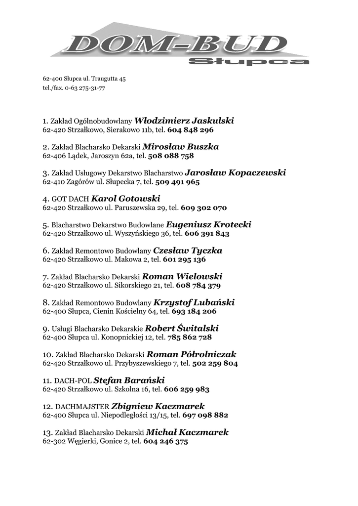 62-400 Słupca ul. Traugutta 45 tel./fax. 0-63 275-31-77 1. Zakład Ogólnobudowlany Włodzimierz Jaskulski 62-420 Strzałkowo, Sierakowo 11b, tel. 604 848 296 2. Zakład Blacharsko Dekarski Mirosław Buszka 62-406 Lądek, Jaroszyn 62a, tel. 508 088 758 3. Zakład Usługowy Dekarstwo Blacharstwo Jarosław Kopaczewski 62-410 Zagórów ul. Słupecka 7, tel. 509 491 965 4. GOT DACH Karol Gotowski 62-420 Strzałkowo ul. Paruszewska 29, tel. 609 302 070 5. Blacharstwo Dekarstwo Budowlane Eugeniusz Krotecki 62-420 Strzałkowo ul. Wyszyńskiego 36, tel. 606 391 843 6. Zakład Remontowo Budowlany Czesław Tyczka 62-420 Strzałkowo ul. Makowa 2, tel. 601 295 136 7. Zakład Blacharsko Dekarski Roman Wielowski 62-420 Strzałkowo ul. Sikorskiego 21, tel. 608 784 379 8. Zakład Remontowo Budowlany Krzystof Lubański 62-400 Słupca, Cienin Kościelny 64, tel. 693 184 206 9. Usługi Blacharsko Dekarskie Robert Świtalski 62-400 Słupca ul. Konopnickiej 12, tel. 785 862 728 10. Zakład Blacharsko Dekarski Roman Półrolniczak 62-420 Strzałkowo ul. Przybyszewskiego 7, tel. 502 259 804 11. DACH-POL Stefan Barański 62-420 Strzałkowo ul. Szkolna 16, tel. 606 259 983 12. DACHMAJSTER Zbigniew Kaczmarek 62-400 Słupca ul. Niepodległości 13/15, tel. 697 098 882 13. Zakład Blacharsko Dekarski Michał Kaczmarek 62-302 Węgierki, Gonice 2, tel. 604 246 375